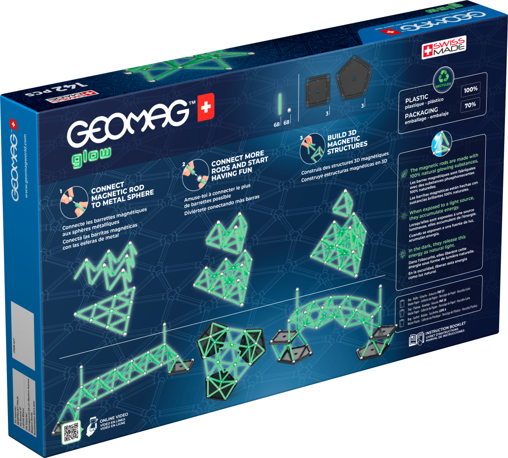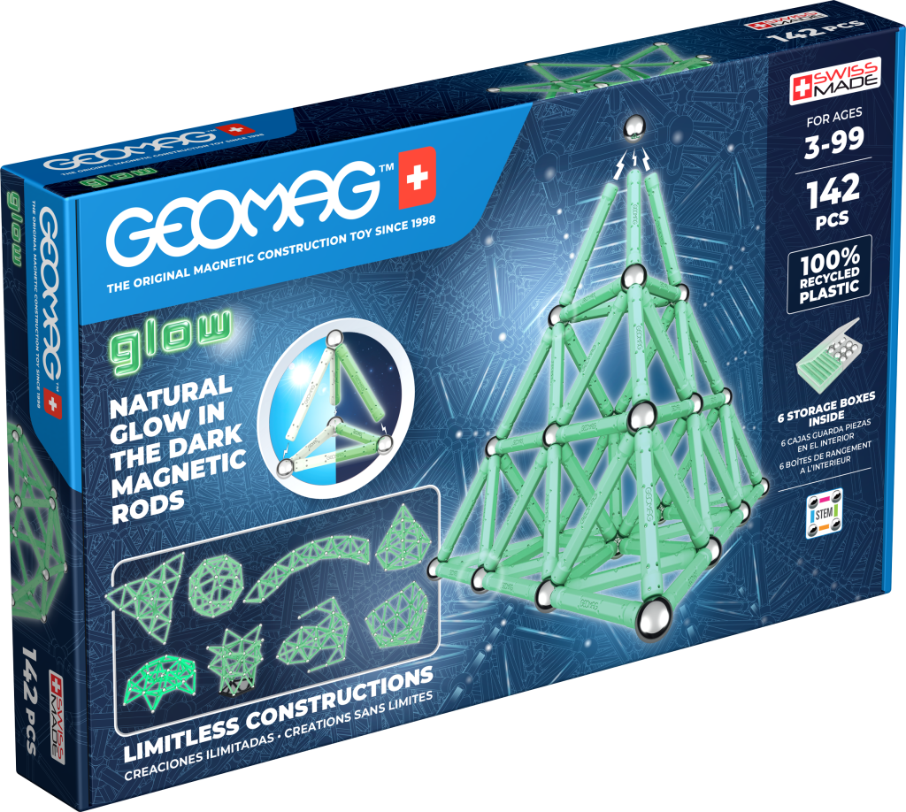 Největší Glow stavebnice Geomag. Obsahuje 68 svítivých magnetických tyček, 68 ocelových kuliček, 3 čtvercové podstavce a 3 pětiúhelníkové podstavce. Celkem 142 dílků. Baleno v praktických úložných pouzdrech.