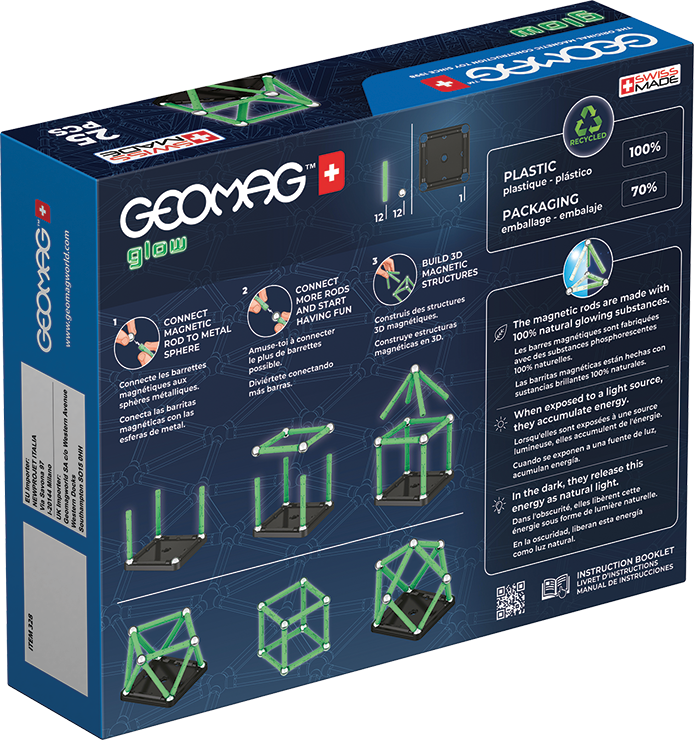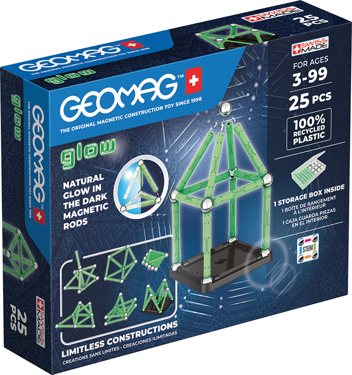 Balení je prakticky řešeno s úložným boxem uvnitř, který umožňuje snadné uskladnění všech dílků po skončení hry. Díky kompaktnímu designu a vysoce kvalitnímu zpracování je stavebnice určena jak pro děti od 3 let, tak i pro starší uživatele až do 99 let. Geomag Glow tak podporuje rozvoj kreativity, logického myšlení a jemné motoriky prostřednictvím zábavné a poutavé formy hry, která nabízí neomezené možnosti stavby různých geometrických tvarů a struktur.