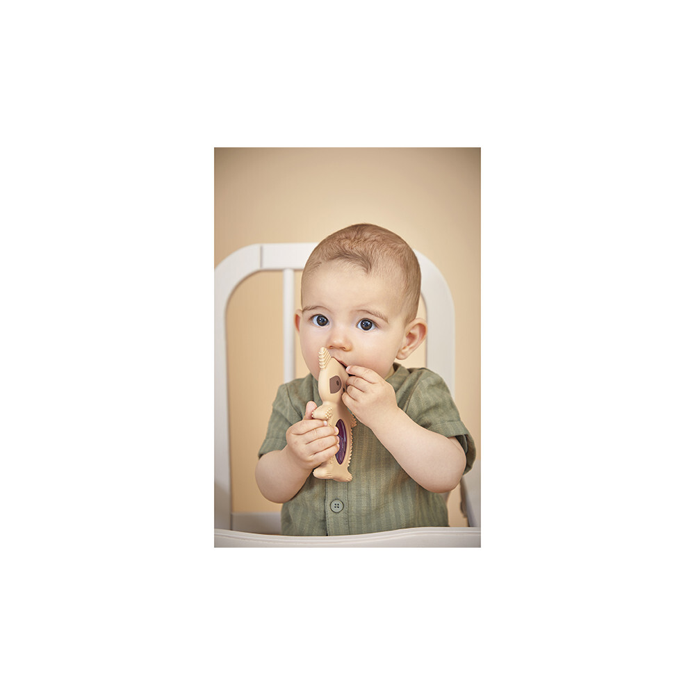Kaloo Grignoti - Chladiace hryzátko mýval je inovatívna pomôcka navrhnutá tak, aby poskytla bábätkám maximálnu úľavu a komfort počas obdobia prerezávania prvých zúbkov. Tento produkt je súčasťou kolekcie Grignoti, ktorá bola špeciálne vyvinutá na zmiernenie ťažkostí pri raste zubov a zároveň na podporu žuvania a rozvoja chuti. Hračka pozostáva z dvoch častí: mäkkého silikónového krúžku v tvare mývala a chladiacej časti v tvare hrozna naplnenej vodou. Chladiaci element poskytuje cielenú pomoc po vychladení v chladničke (10 až 20 minút), kedy studený povrch pomáha upokojiť zapálené a citlivé ďasná. Telo mývala obsahuje rôzne textúry, drážky a výstupky, ktoré sú ideálne na jemnú masáž ďasien a stimuláciu hmatu. Vďaka ergonomickému tvaru sa hračka bábätkám ľahko drží, čím sa prirodzene rozvíja ich jemná motorika. Veľkosť: 13 cm Materiál: Silikón, voda Farba: Hnedá Údržba: Len povrchové čistenie rukou Vek 3m+