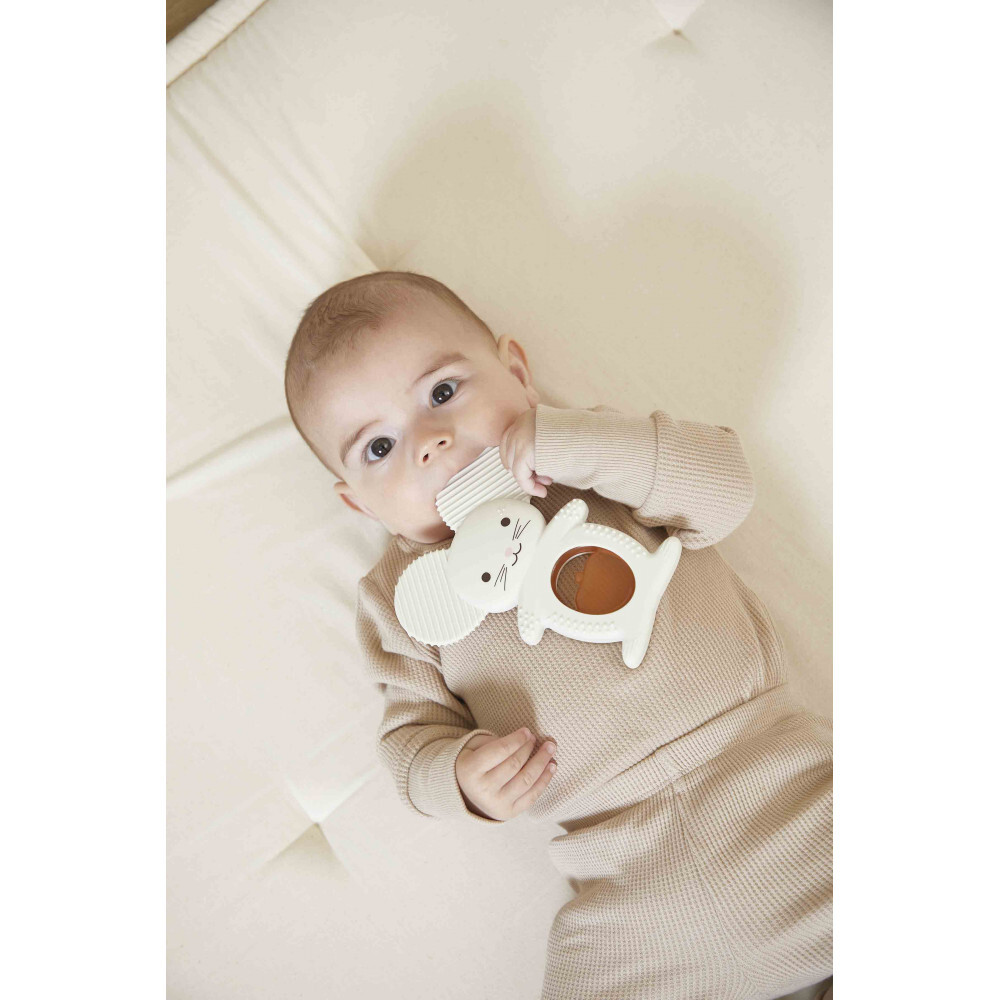 Kaloo Grignoti - Chladiace hryzátko myška je roztomilá a praktická pomôcka navrhnutá tak, aby priniesla bábätkám okamžitú úľavu pri prorezávaní prvých zúbkov. Tento produkt patrí do série Grignoti, ktorá je špeciálne vytvorená na upokojenie citlivých ďasien a podporu senzorického vnímania najmenších detí. Duo obsahuje mäkký silikónový krúžok v tvare bielej myšky a chladiaci element v tvare jablka naplnený vodou. Po vložení „ovocia“ do chladničky na 10 až 20 minút poskytuje hračka príjemný chladivý efekt, ktorý redukuje bolesť a opuch ďasien. Rôznorodé textúry, výstupky a drážky na uškách a tele myšky jemne masírujú ďasná a stimulujú hmat. Ergonomický tvar je prispôsobený malým detským rúčkam, čo uľahčuje úchop a podporuje rozvoj jemnej motoriky. Veľkosť: 14 cm Materiál: Silikón, voda Farba: Biela Údržba: Len povrchové čistenie rukou Vek 3m+