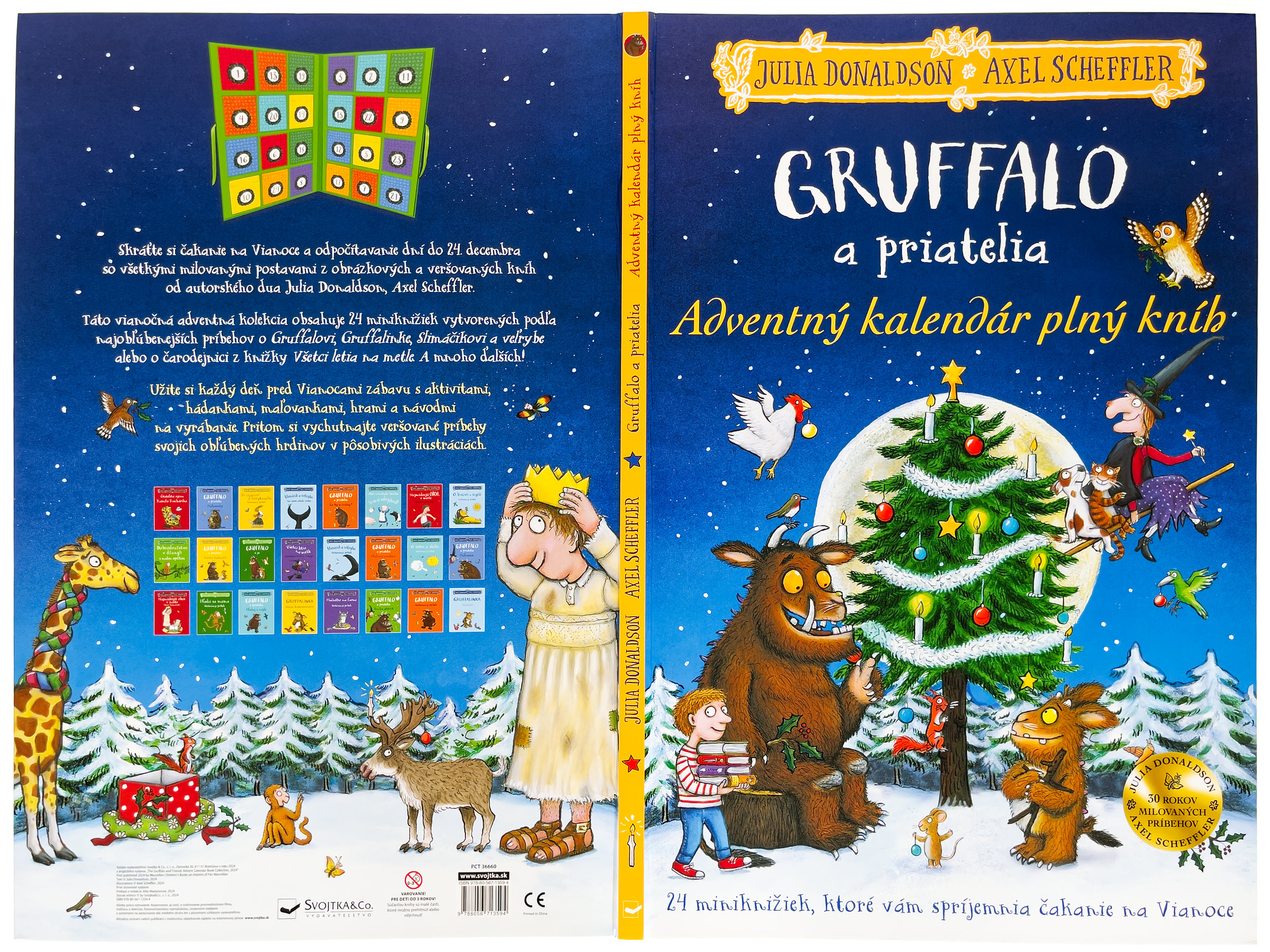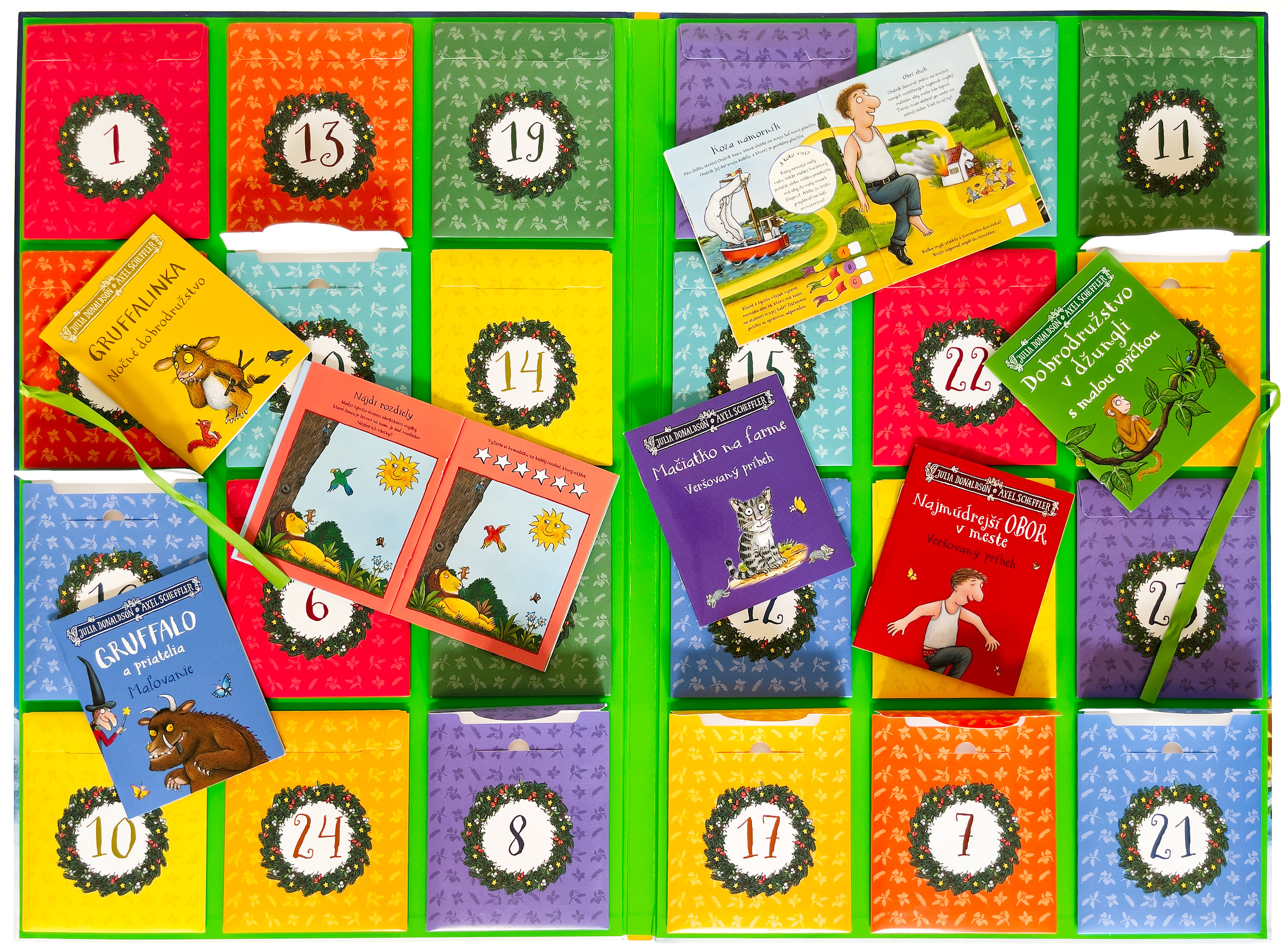 Skráťte si čakanie na Vianoce s adventným kalendárom plným kníh! Odpočítavanie dní do 24. decembra bude plné zábavy a radosti so všetkými milovanými postavami z kníh od Julie Donaldson a Axela Schefflera. Táto vianočná kolekcie obsahuje 24 miniknižiek podľa najobľúbenejších príbehov o Gruffalovi, Gruffalinke, Slimáčikovi a veľrybe, alebo o čarodejnici z knižky Všetci letia na metle a mnoho ďalších. Každý deň pred Vianocami si užijete aktivity, hádanky, maľovanky, hry a návody na vyrábanie a pritom si vychutnáte veršované príbehy vašich obľúbených hrdinov doplnených pôsobivými ilustráciami. Tento adventný kalendár je ideálny spôsob, ako deťom spríjemniť čakanie na Štedrý deň a naplniť adventný čas kúzelnými chvíľami a zábavou.Počet strán: 24 knih x 20