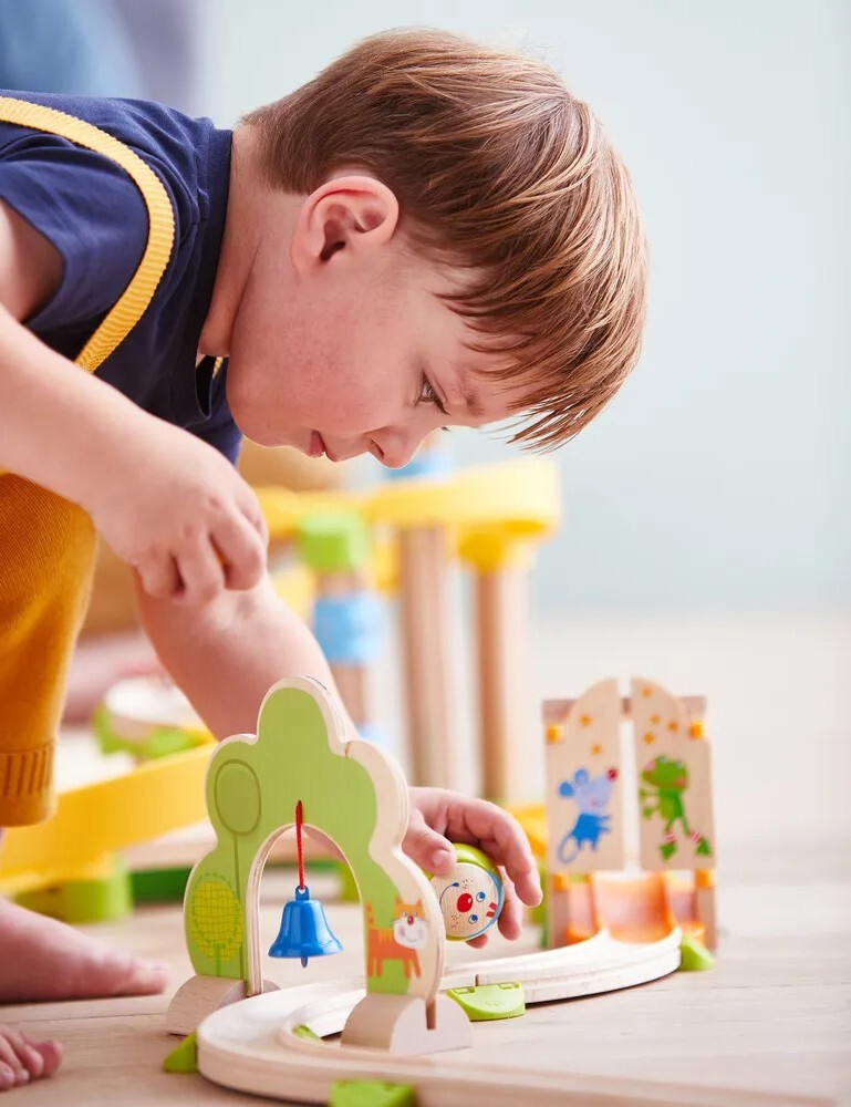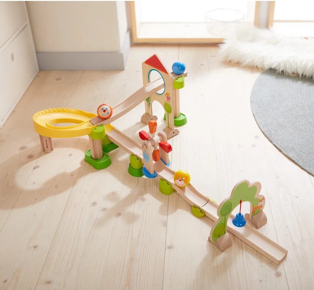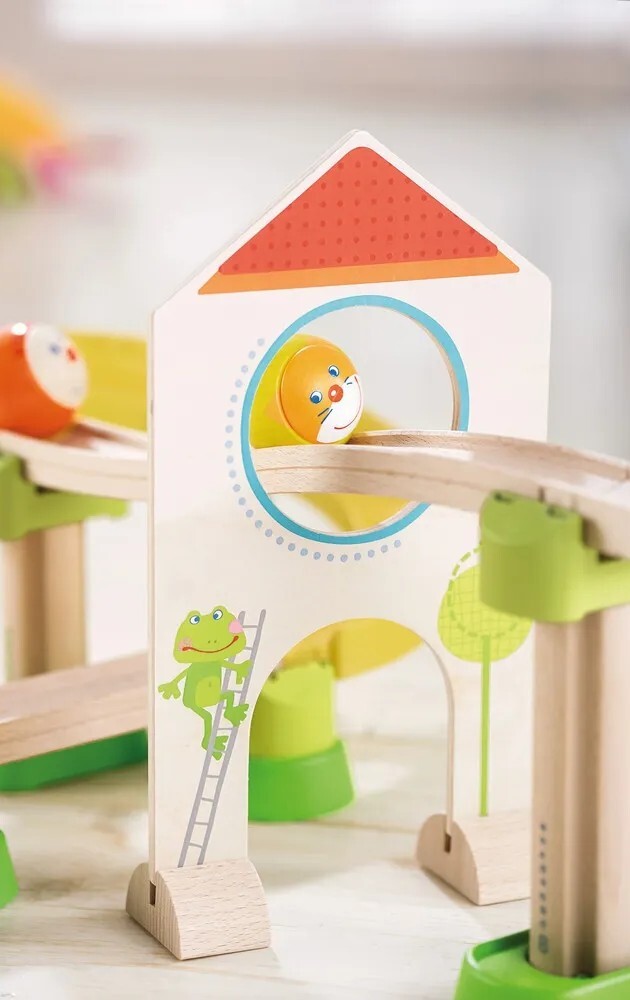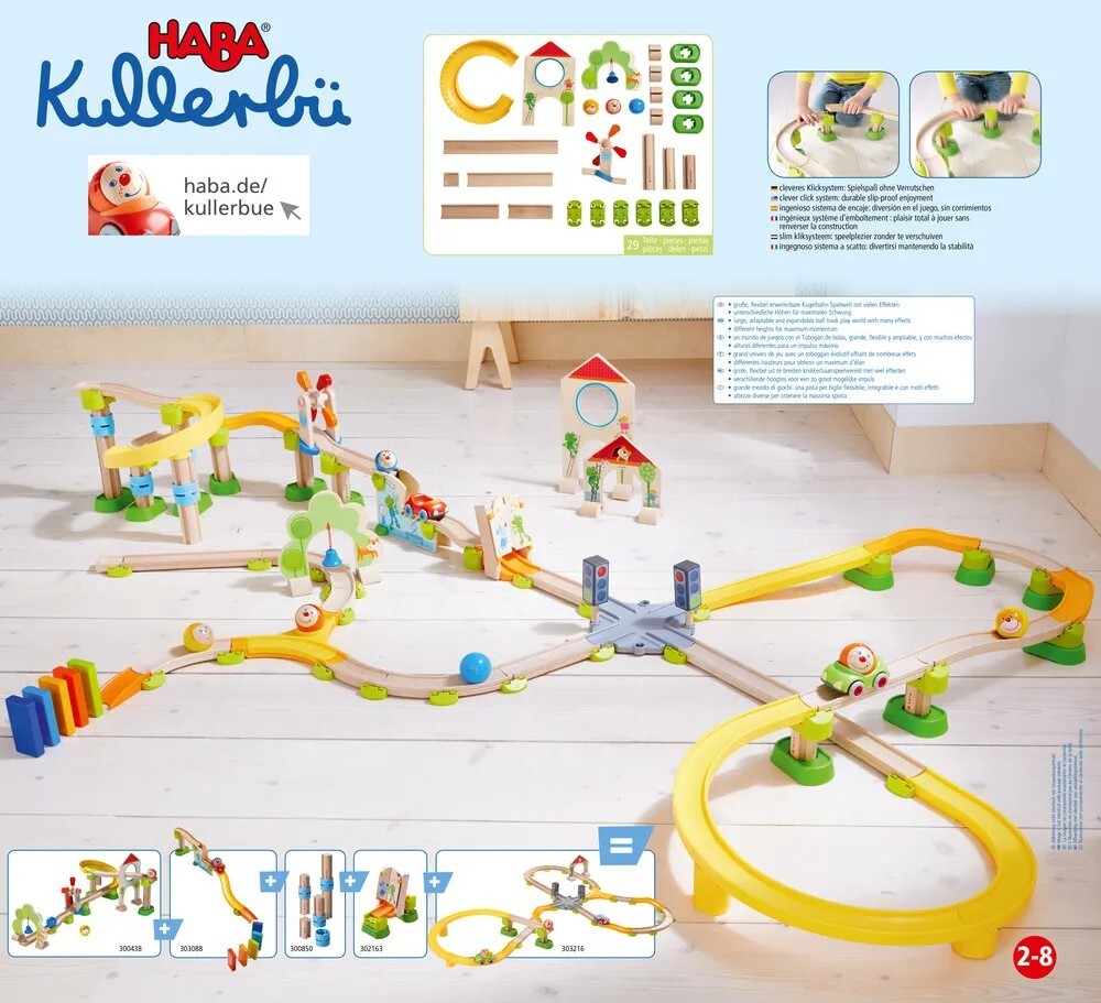 Drevená guľôčková dráha s mnohými zábavnými detailmi. Farebný vzrušujúci svet s guľôčkou je určený pre deti už od 2 rokov, všetky časti sú prispôsobené pre malé detské ruky. Stĺpiky majú šikovný nacvakávací systém, nehrozí rozpadnutie dráhy. Vložíte, kliknete a máte hotovo - zostavenie hernej dráhy by bolo ťažko jednoduchšie. Premyslený systém spojovacích prvkov zaisťuje maximálnu stabilitu ako na podlahe, tak vo vzduchu. Postavte dráhu a sledujte ako guľôčka uháňa pestrofarebnou cestou cez rôzne prekážky a nakoniec dobehne do cieľa. Herný systém guľôčkovej dráhy Kullerbü je navrhnutý tak, aby ho bolo možné flexibilne rozšíriť. Výsledkom je celá rada rôznych konštrukčných možností, vďaka ktorým je Kullerbü zaujímavou a rozmanitou hračkou pre deti od 2 do 8 rokov. Všetky súpravy Kullerbü sú vzájomne kompatibilné. Dráha Kullerbü je vyrobená z bukového dreva, preglejky a plastu. Je perfektnou kombináciou drevených a plastových dielov a spája výhody týchto materiálov, vďaka ktorým sa tento robustný herný systém od spoločnosti HABA stane zábavným spoločníkom po celé detstvo.