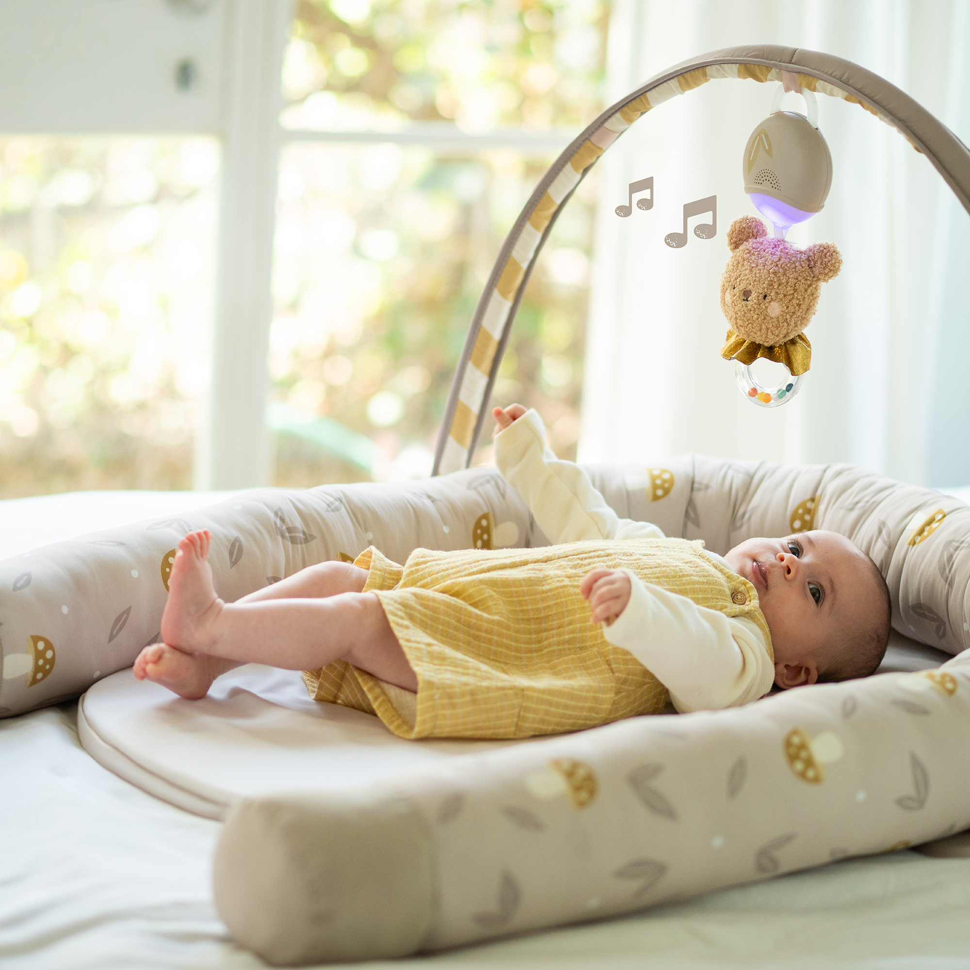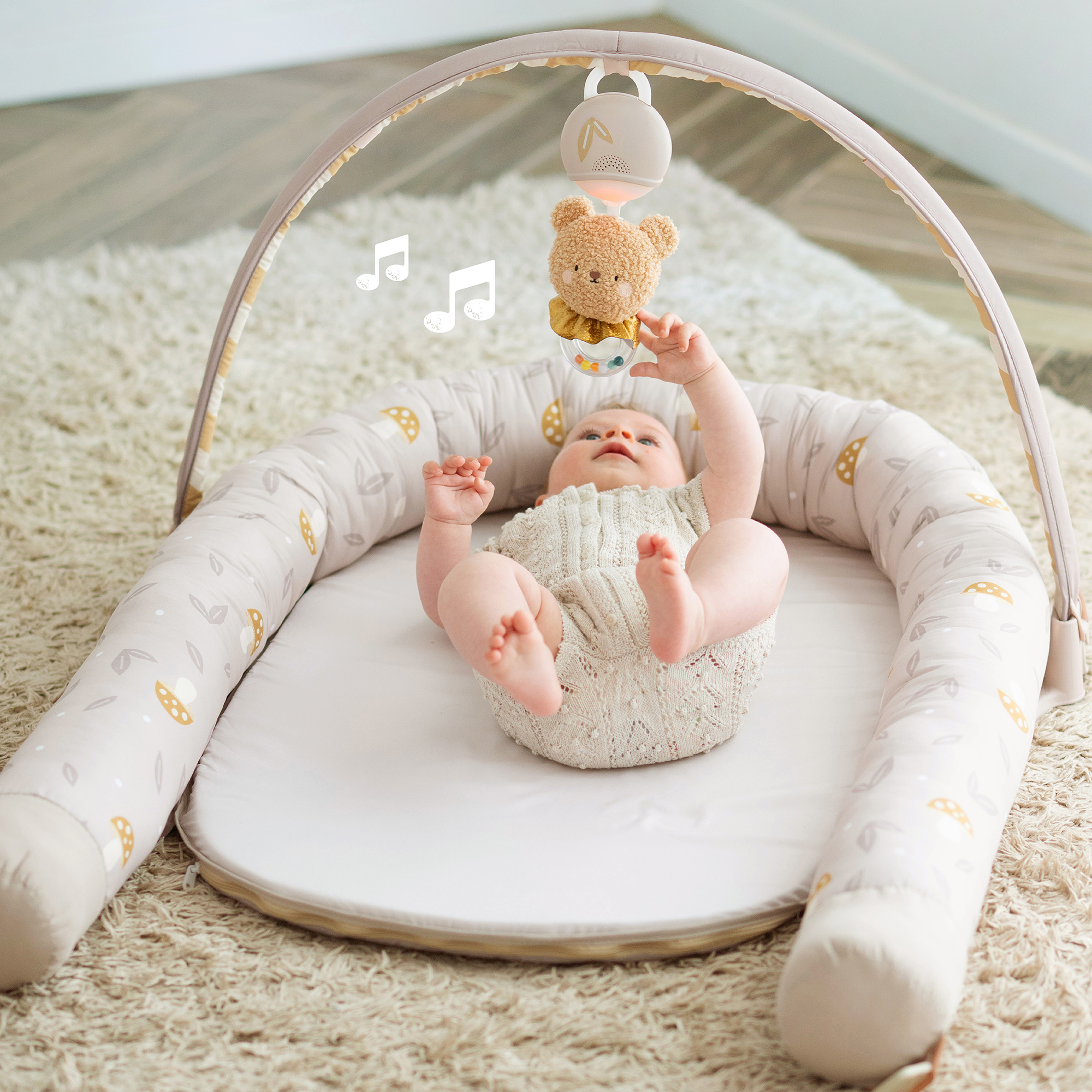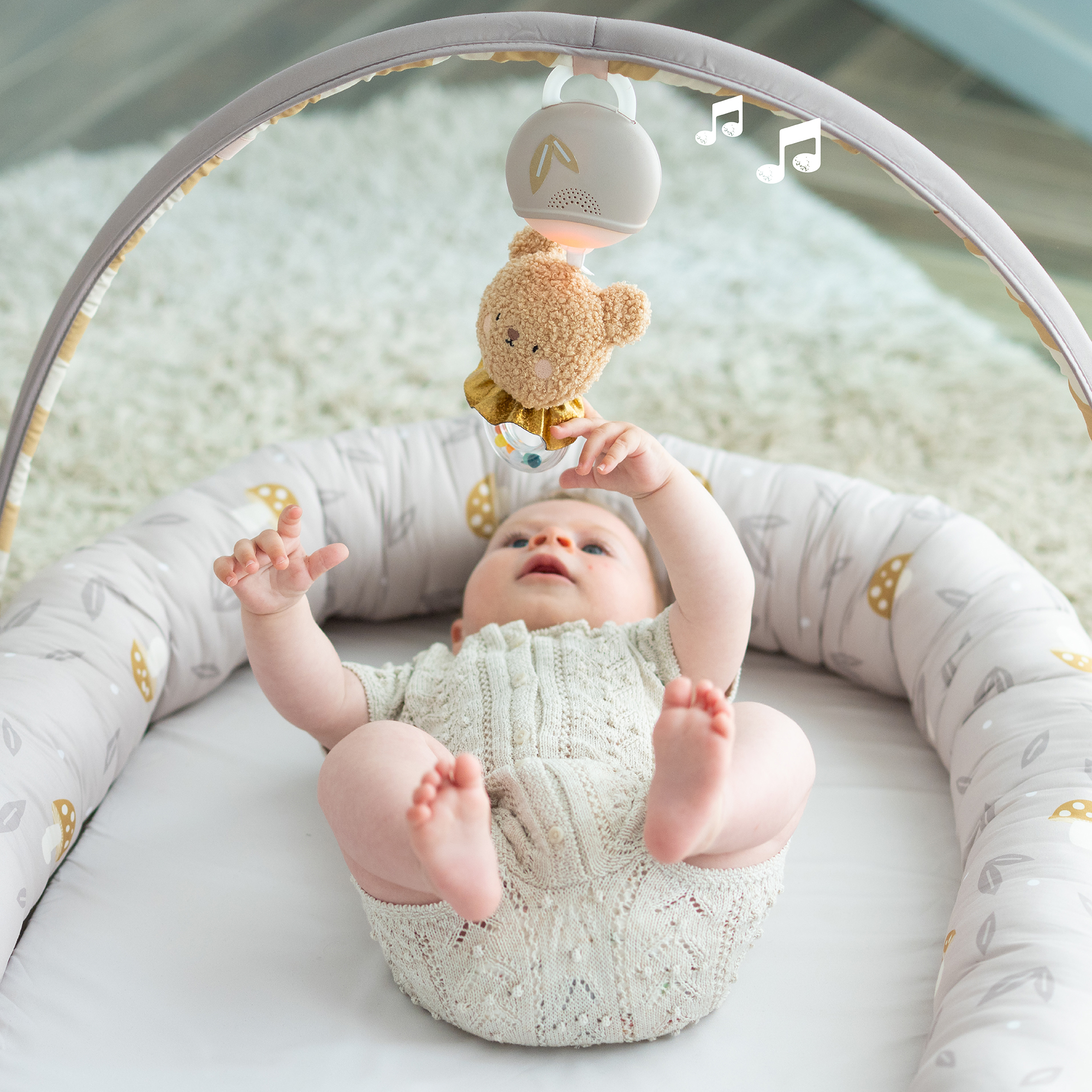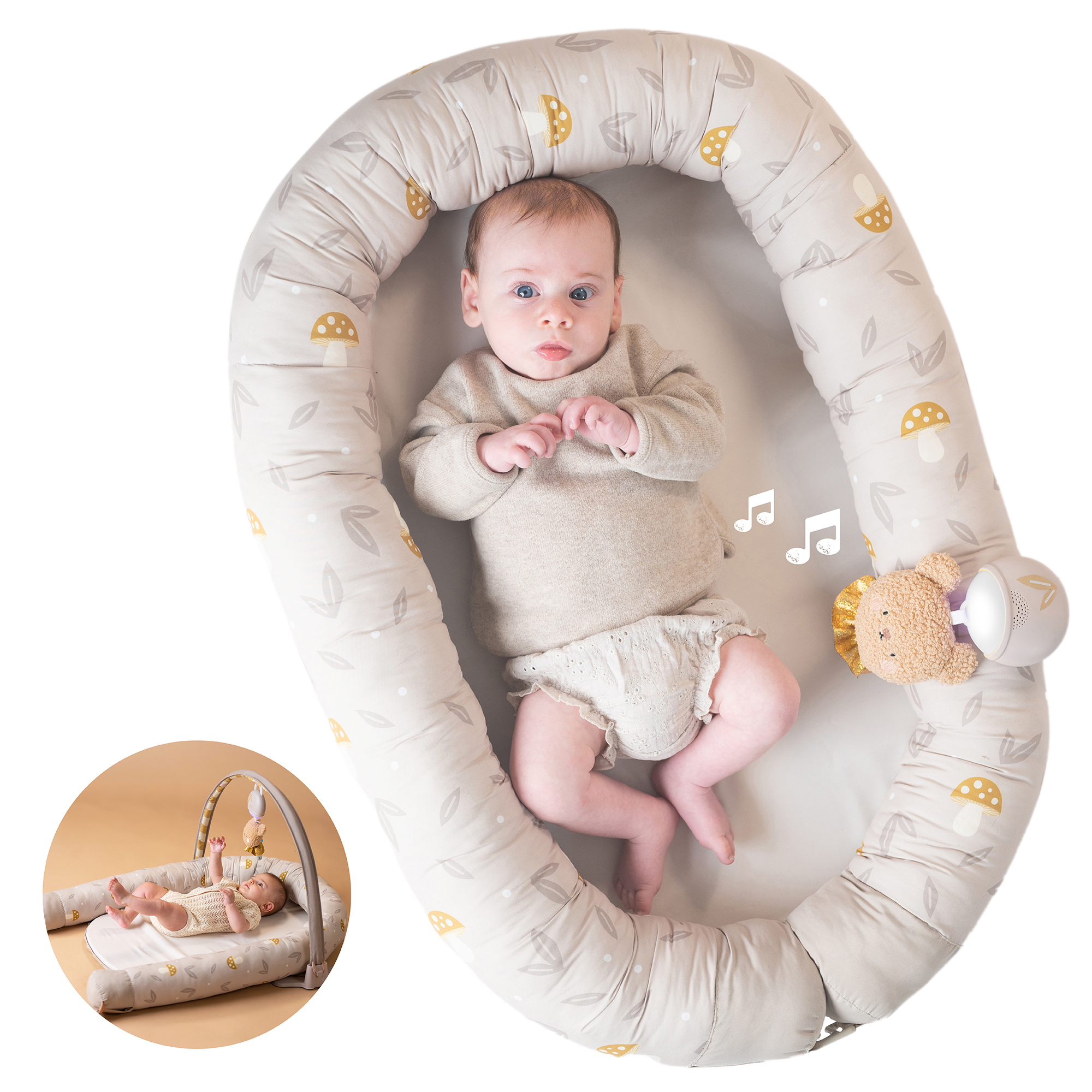 Hnízdo pro miminko Taf Toys je praktický doplněk, který roste spolu s dítětem. V prvních týdnech slouží jako měkké, bezpečně obepínající hnízdo, ve kterém se novorozenec lépe zklidní a odpočívá. Od třech měsíců věku dítěte lze hnízdo rozložit a využít jako pohodlný prostor pro hraní. Součástí odnímatelné hrazdy je plyšový medvídek se světýlky a 22 minutami uklidňujících melodií, které pomáhají miminko zabavit i uklidnit. Hudební medvidek je použitelný i samostatně.