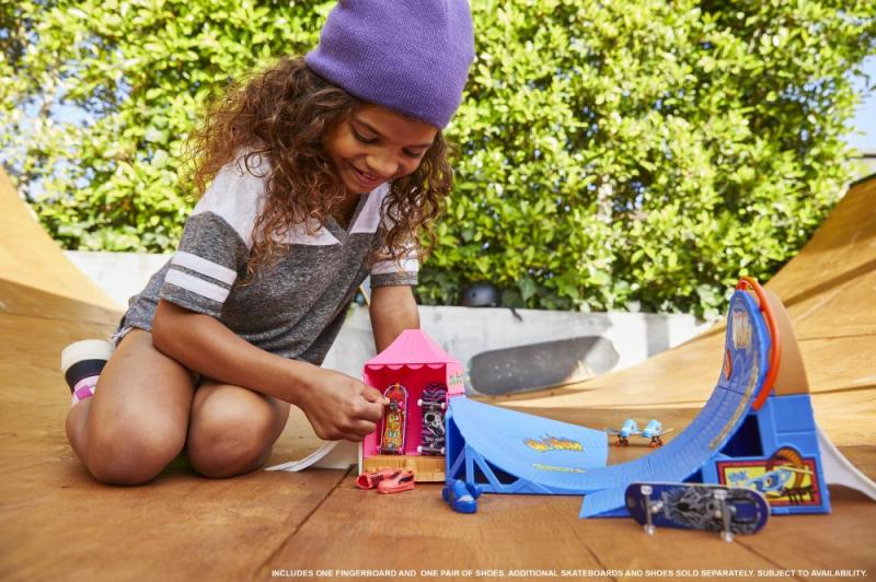 Herný set Hot Wheels® Zábavný fingerboard skatepark je cool miesto plné prekážok, skvelých motívov a zvukov aktivovaných fingerboardom, ktoré zaistia parádny zážitok z hry! Tento herný set je pripravený na veľkolepé kúsky na doske vďaka rampám, rímsam, zábradliam a u-rampám a tiež spúšťacím tlačidlám, ktoré aktivujú úžasnú hudbu uprostred jazdy. Súčasťou je fingerboard navrhnutý v spolupráci s legendou skateboardingu Tony Hawkom a pár odnímateľných skate topánok, ktoré pomáhajú získať cit pri zvládaní trikov. Prepoj tento set s ďalšími setmi a vytvor kolosálny skatepark s neobmedzenými možnosťami kaskadérskych kúskov. Každý set sa predáva samostatne v závislosti od dostupnosti. Farby a vzhľad výrobku sa môžu líšiť.