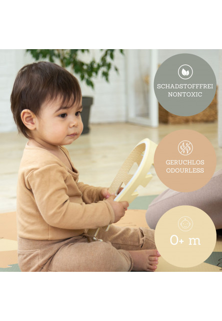 Hrací podložka Puzzle XXL Džungle 1,8 x 1,2 mHravá a pohodlná puzzle podložka s motivem džungleExtra velká hrací podložka Puzzle XXL Dungla se skládá z 6 pěnových čtverců, které jsou 4x větší než klasické puzzle díly, proto poskytuje čtyřnásobek prostoru nejen pro plazení, hraní a dětská dobrodružství, ale také pro různé rodinné aktivity. Využijete ji i na jógu, sportovní cvičení či dokonce piknik v přírodě. Díky stylovým pastelovým barvám a elegantním ručně kresleným motivům zvířátek a rostlin z džungle podložka dokonale doplní každý dětský pokoj. Všechny puzzle díly do sebe pevně zapadají a poskytují tak pohodlný „polštář“ i na tvrdých a studených podlahách.Bezpečná hrací podložka pro nejmenšíHrací podložka v krásných pastelových barvách je vyrobena z kvalitní EVA pěny, která je tlustá 1,2 cm a o 20% měkčí a teplejší než jiné alternativy, což zajišťuje pohodlné a bezpečné hraní. Podložka je voděodolná a jednoduše ji vyčistíte mýdlem a hadříkem, takže ji můžete používat nejen doma, ale i venku. Navíc je 100% bez zápachu a neobsahuje nebezpečné látky jako formamid, BPA a ftaláty.