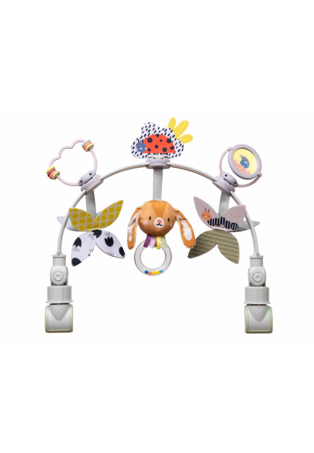 Hrazda Tiny Love je vhodná na kočárek, autosedačku či lehátko. Nabízí množství aktivit pro zabavení dítěte na cestách i doma, např. chrastítko, kousátko, otáčecí větrník nebo bezpečné zrcátko.