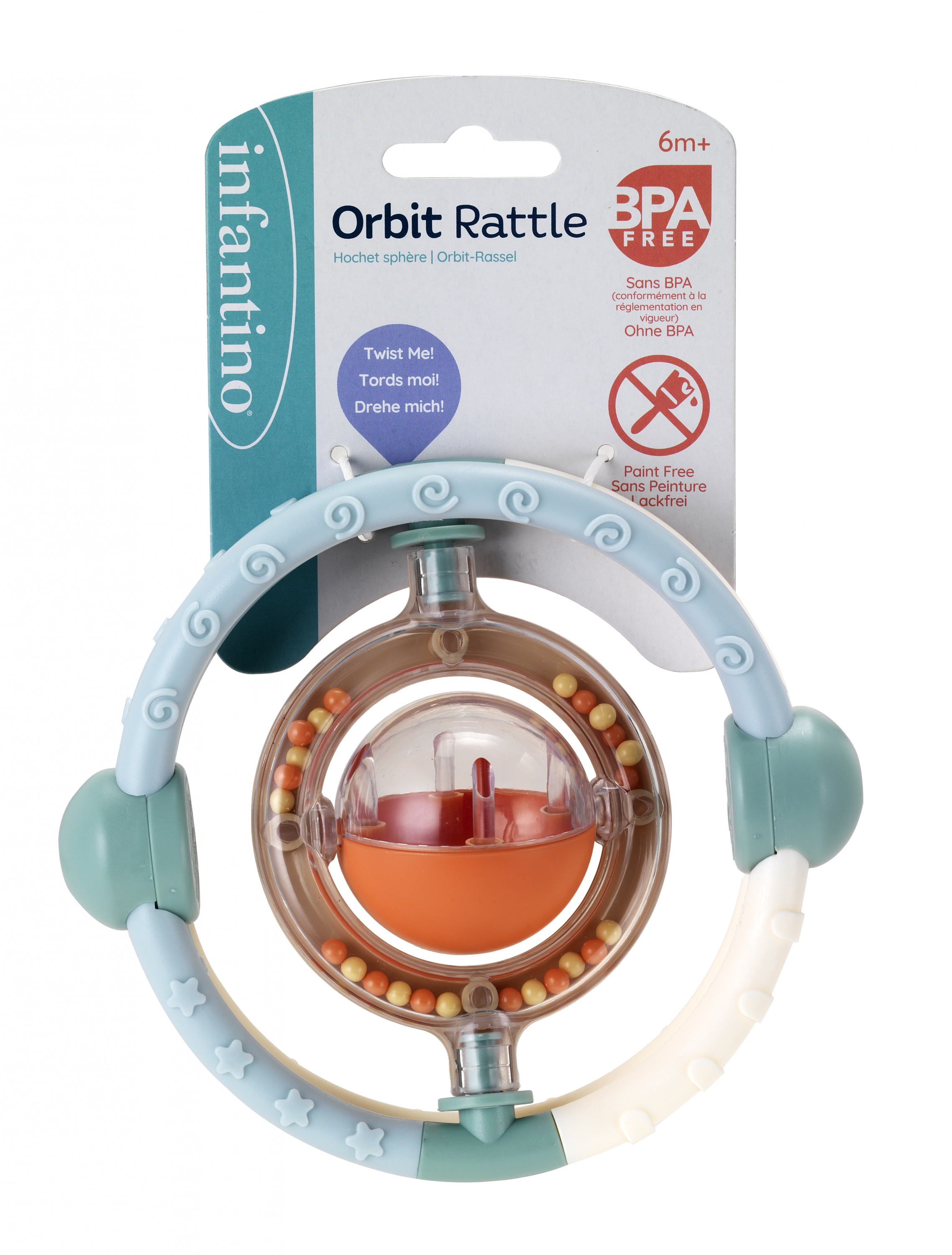 Hrkálka Infantino s rôznymi textúrami má tvar pre ľahké uchopenie a skúmanie ručičkami aj v ústach. Korálky vo vnútri priehľadného krúžku pri pohybe jemne hrkajú.