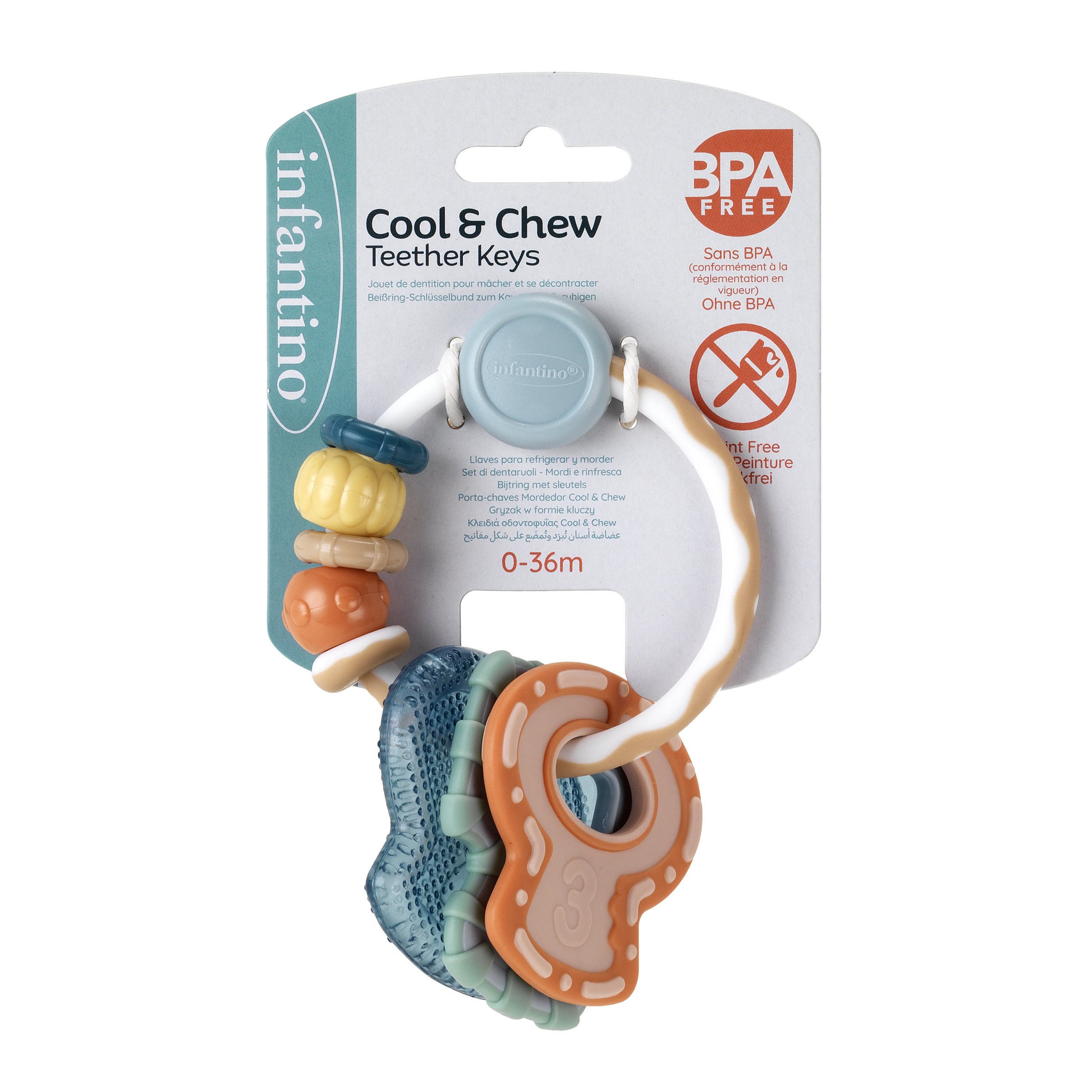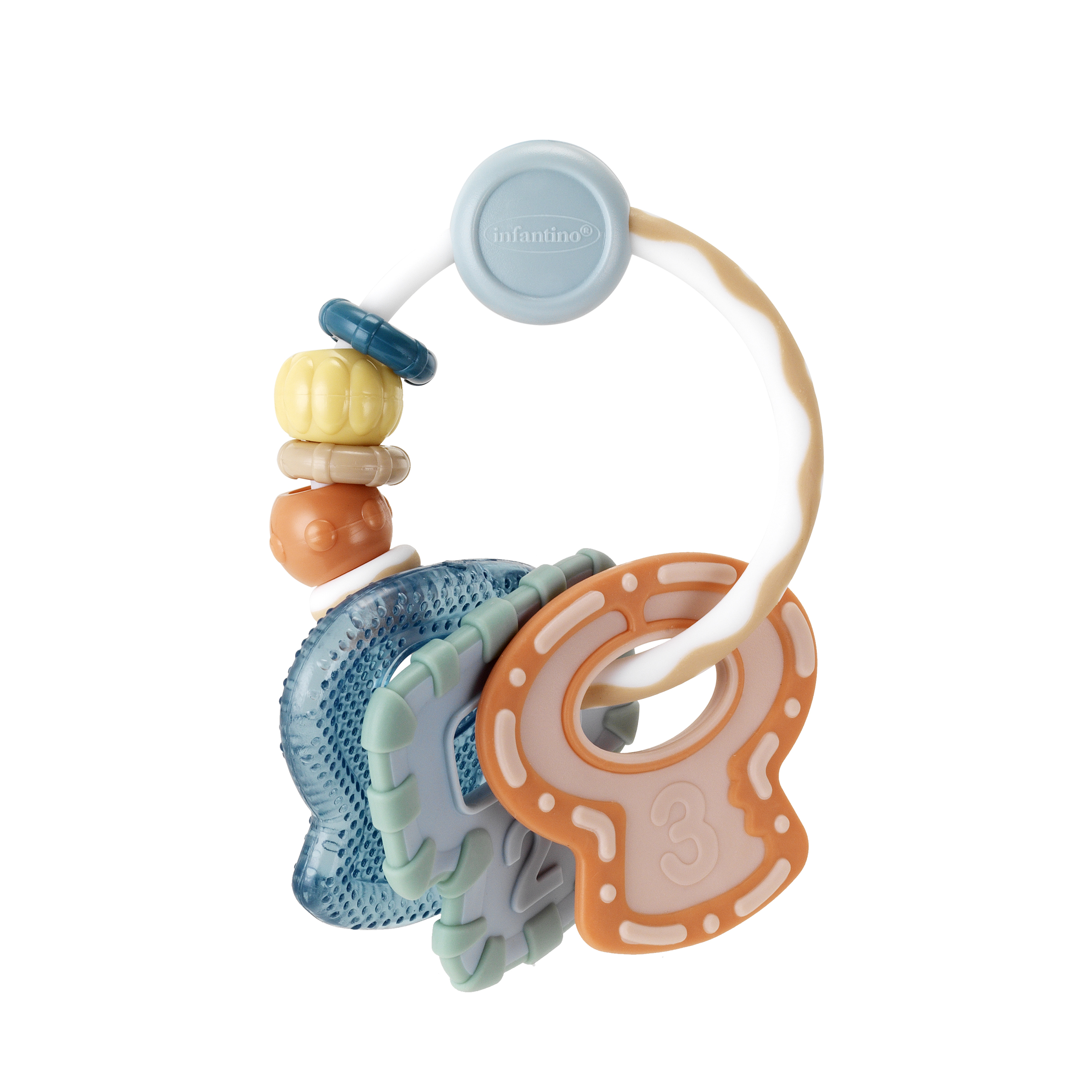 Chrastítko Infantino v podobě kroužku s posuvnými korálky a klíčky, které slouží i jako kousátka pro úlevu při prořezávání prvních zoubků. Kousátka mají různé povrchy (měkčí i pevnější) a je možné je ochladit v lednici pro větší úlevu při růstu zoubků. Hračka při pohybu jemně chrastí.