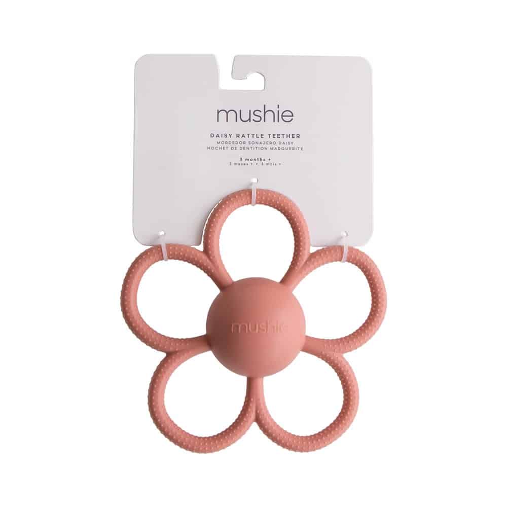 Hryzadlo s hrkálkou Mushie Daisy je inšpirovaný krásnym kvetom sedmokrásky. Hrkálka je zároveň hryzadlo, všetko v jednom – hravý dizajn v tvare kvetu stimuluje sluchové zmysly a zároveň je ľahko uchopiteľný drobnými detskými ručičkami a textúrovaný silikónový povrch masíruje a upokojuje podráždené ďasná dieťaťa, keď začínajú vychádzať zúbky. Hrkálka Daisy je vyrobená z netoxického potravinárskeho silikónu, ktorý je bezpečný na žuvanie. Hryzadlo Mushie Daisy – detaily