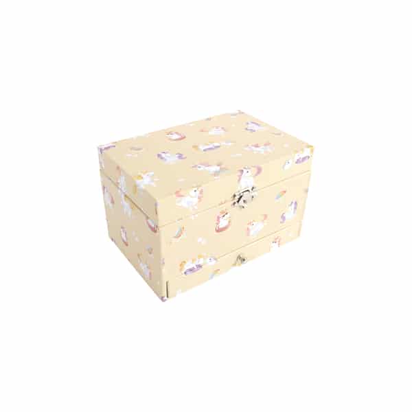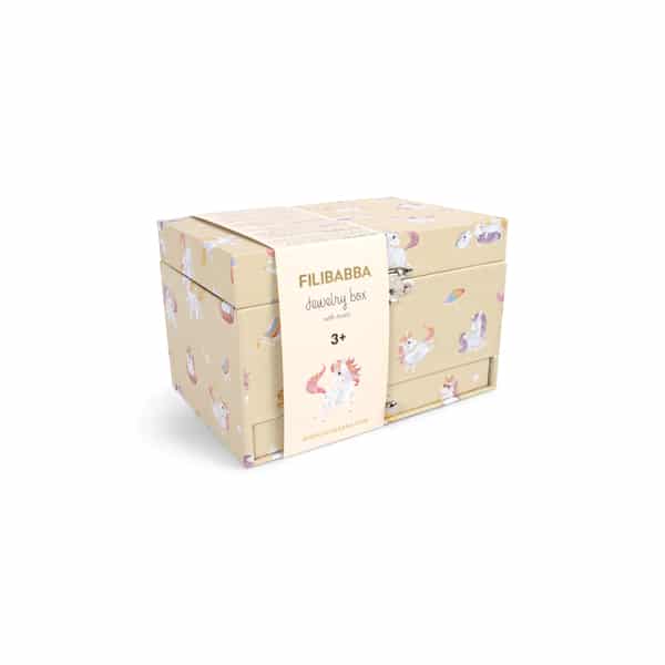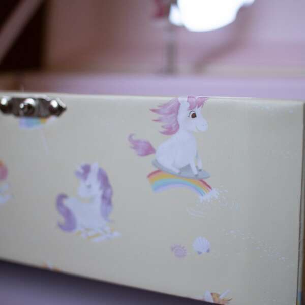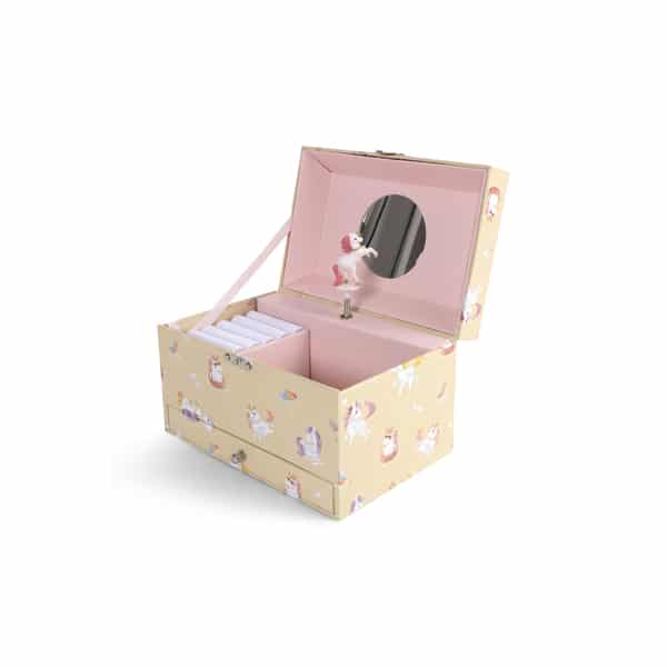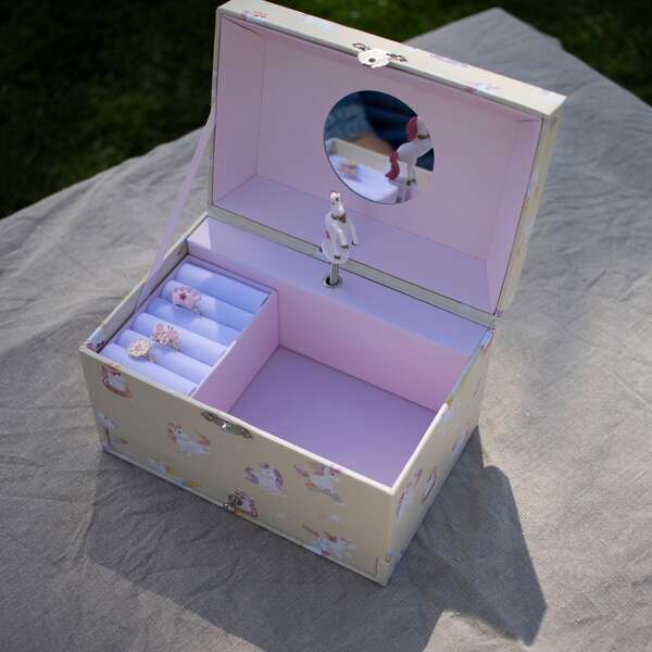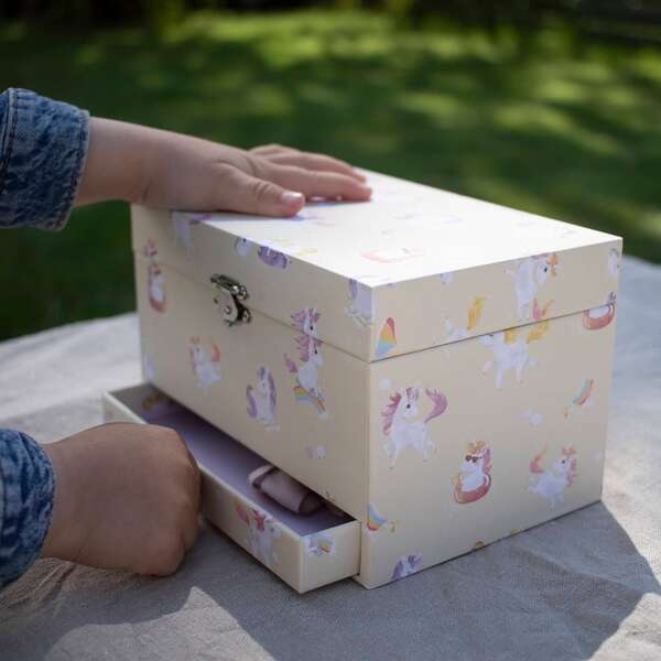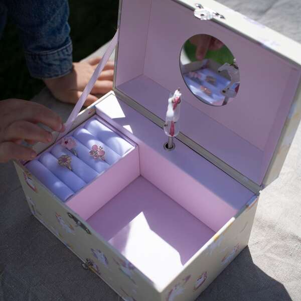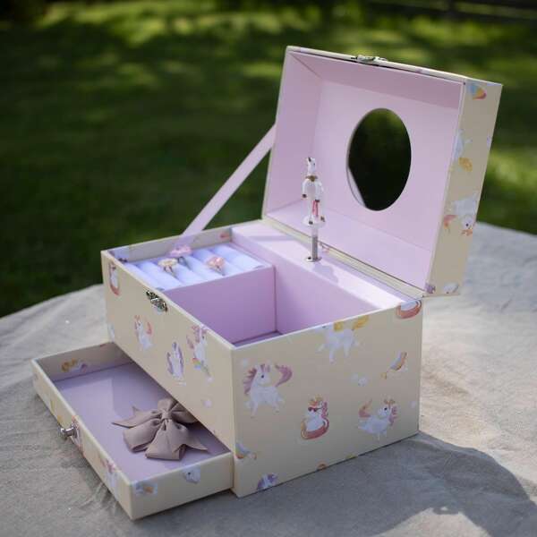 Táto hudobná šperkovnica je dokonalým úkrytom pre všetko – od prázdninových spomienok až po trblietavé korálky a obľúbené náramky. Po otvorení veka sa objaví pôvabný jednorožec, ktorý sa točí za jemnej melódie, zatiaľ čo mäkké zrkadlo odráža zvedavé pohľady a veľké sny. Vo vnútri nájdete priestranný hlavný priestor s dostatkom miesta na malé poklady, vrátane špeciálneho držiaka na prstene a náušnice. Skrytá zásuvka pod ním je ideálna na ďalšie drobnosti. Očarujúci motív jednorožca na vonkajšej strane robí z tejto šperkovnice čarovný doplnok do každej detskej izby – pripravený strážiť tie najcennejšie nálezy dňa, ako sú mušle z pláže či náhrdelník od babičky. Rozmery: 12 × 18 × 11 cm Upozornenie: Pred odovzdaním produktu dieťaťu odstráňte všetky obaly. Pred každým použitím výrobok skontrolujte a v prípade akéhokoľvek poškodenia ho nepoužívajte. Nevhodné pre deti do 3 rokov – obsahuje malé časti, riziko zadusenia. Pokyny na údržbu: Čistite vlhkou handričkou, v prípade potreby s malým množstvom mydla.