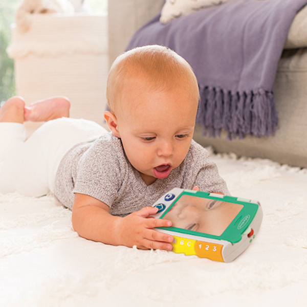 Zábavná interaktívna hračka Infantino, ktorá spája telefón na hranie a malú obrázkovú knižku plnú prekvapení. Na prednej strane má veľké zrkadlo a tlačidlá, s ktorými sa dieťa môže hrať na volanie alebo fotenie. Po otvorení stránok sa spustí vzdelávací obsah – hračka prečíta jednoduché vety a nabáda deti k objavovaniu tvarov, farieb a čísel.
