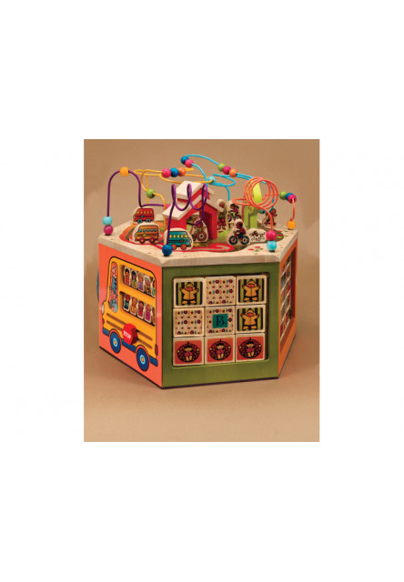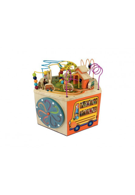 Unikátní dřevěné hrací centrum s množstvím pohyblivých různorodých aktivit zajistí vašemu dítěti hodiny zábavy. Díky své velikosti zabaví současně i několik dětí. Každá ze sedmi stran hracího centra nabízí jiný typ aktivity. Pomůže dětem naučit se barvy, tvary, čísla, písmenka i první anglická slovíčka. Vyrobeno z vysoce kvalitního dřeva s krásnou povrchovou úpravou. Rozměry: 61×61×53,3 cm. Vhodné pro děti od 1 do 3 let.
