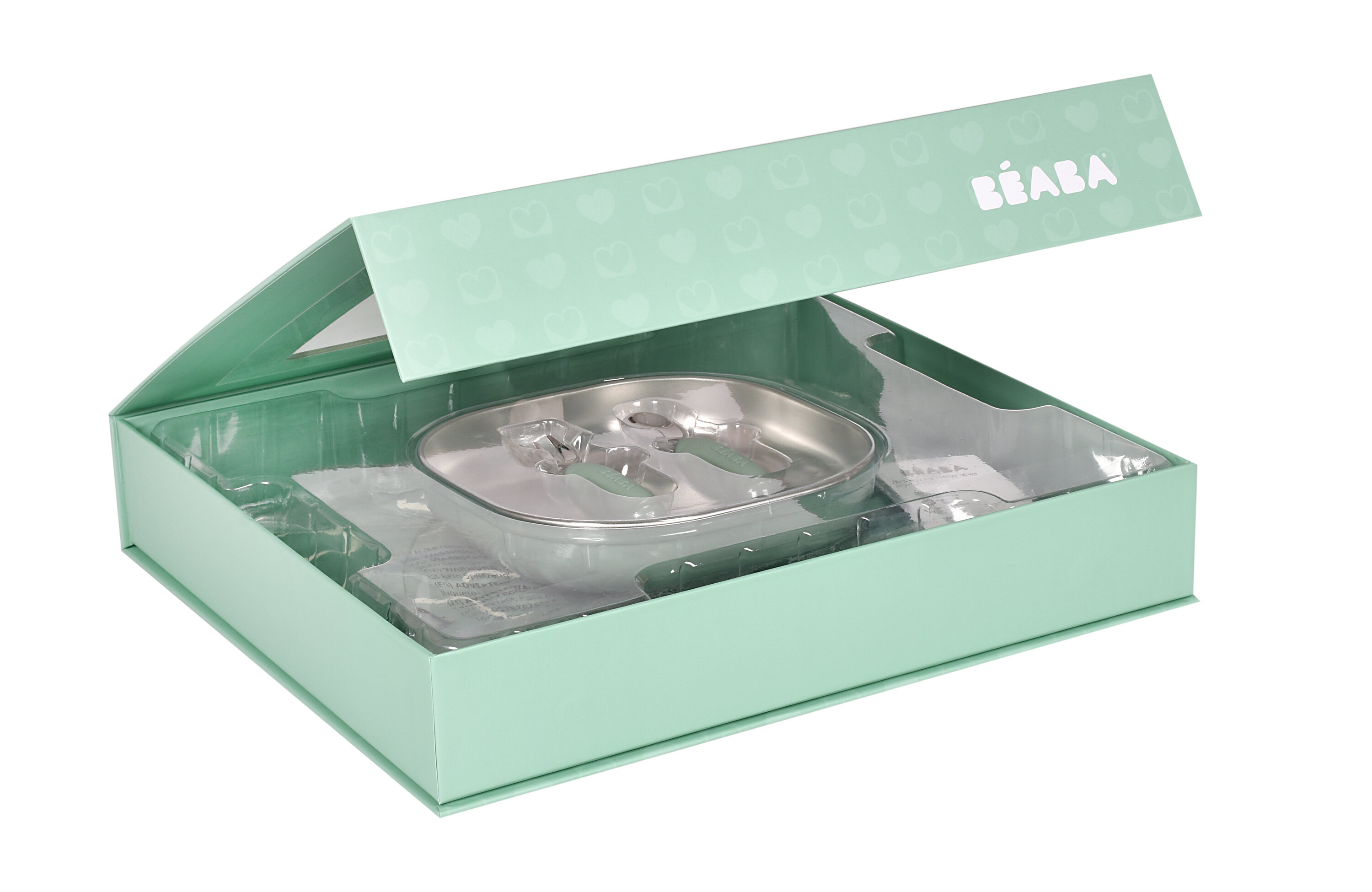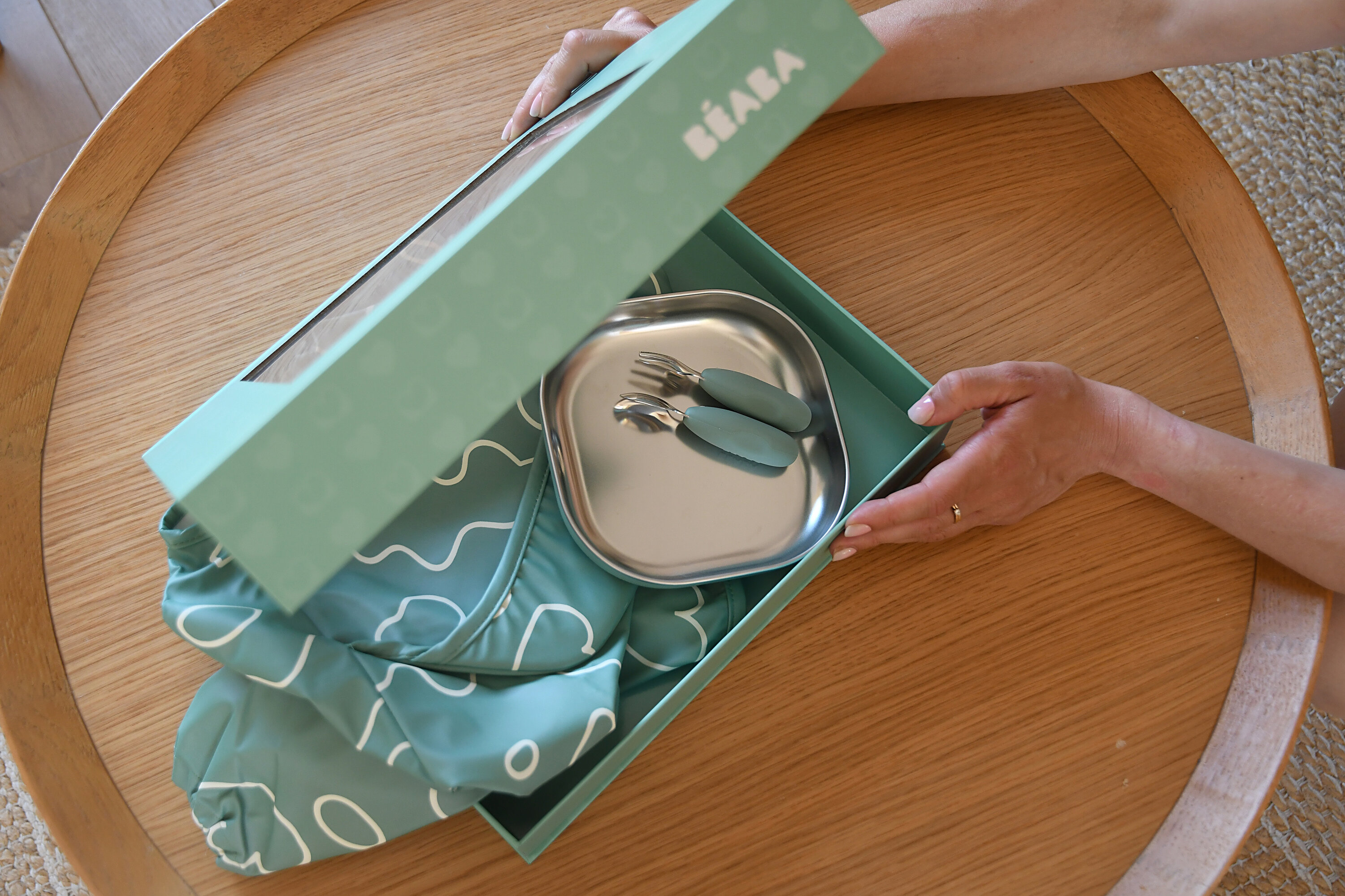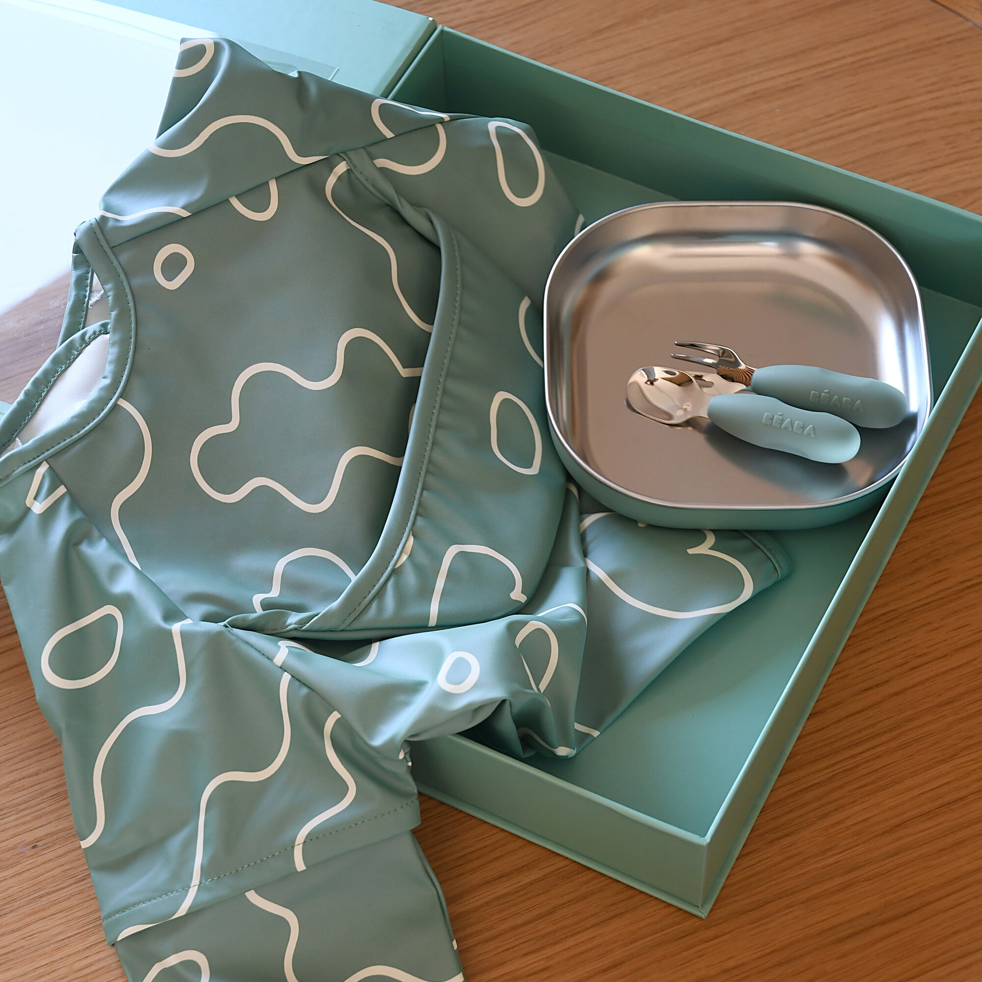 Jídelní sadu pro nejmenší tvoří nerezový talíř se silikonovou povrchovou vrstvou, ergonomická tréninková lžička a vidlička a bryndák s odepínacími rukávy a kapsou na drobky. Krásnou krabičku, ve které je sada zabalená můžete používat i jako krabičku na drobnosti.