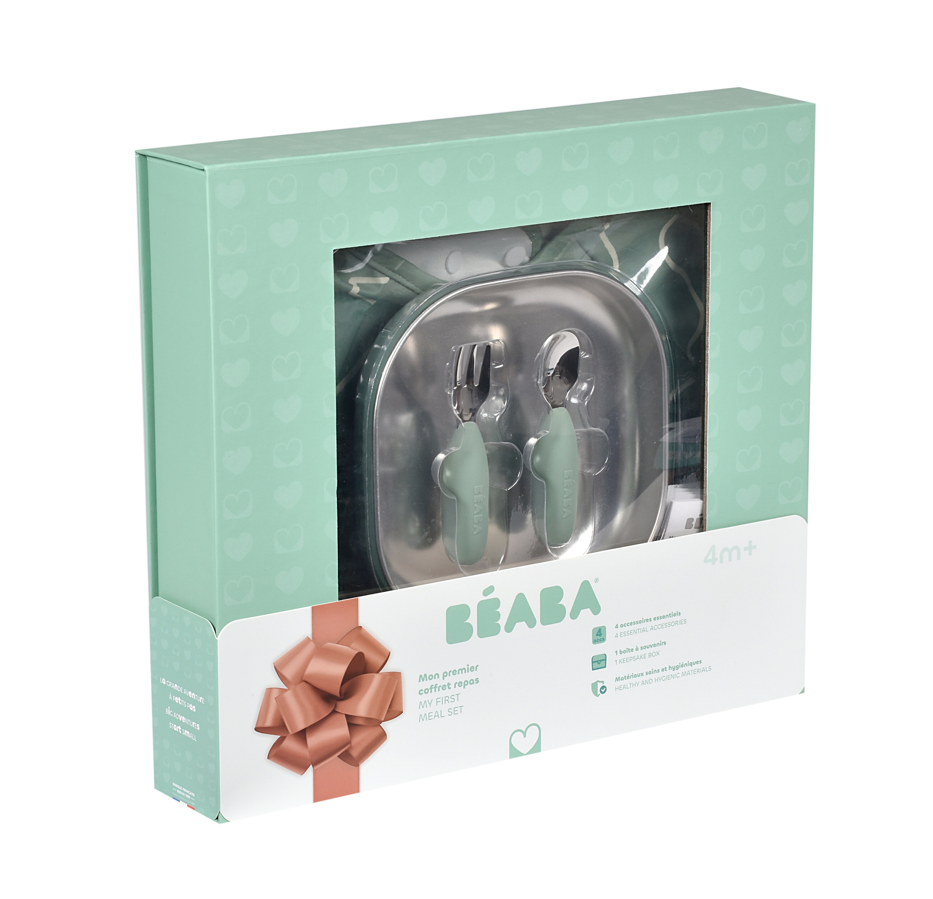 Lžička a vidlička byly vyvinuty ve spolupráci se specialistou na dětské krmení. Krátká, zaoblená rukojeť sedí do malých ruček, mělká lžička pomáhá nabírat přiměřené množství a vidlička se zaoblenými hroty je zcela bezpečná. Kombinace silikonu a nerezu dělá z příboru dlouhodobého pomocníka pro rozvoj samostatnosti.