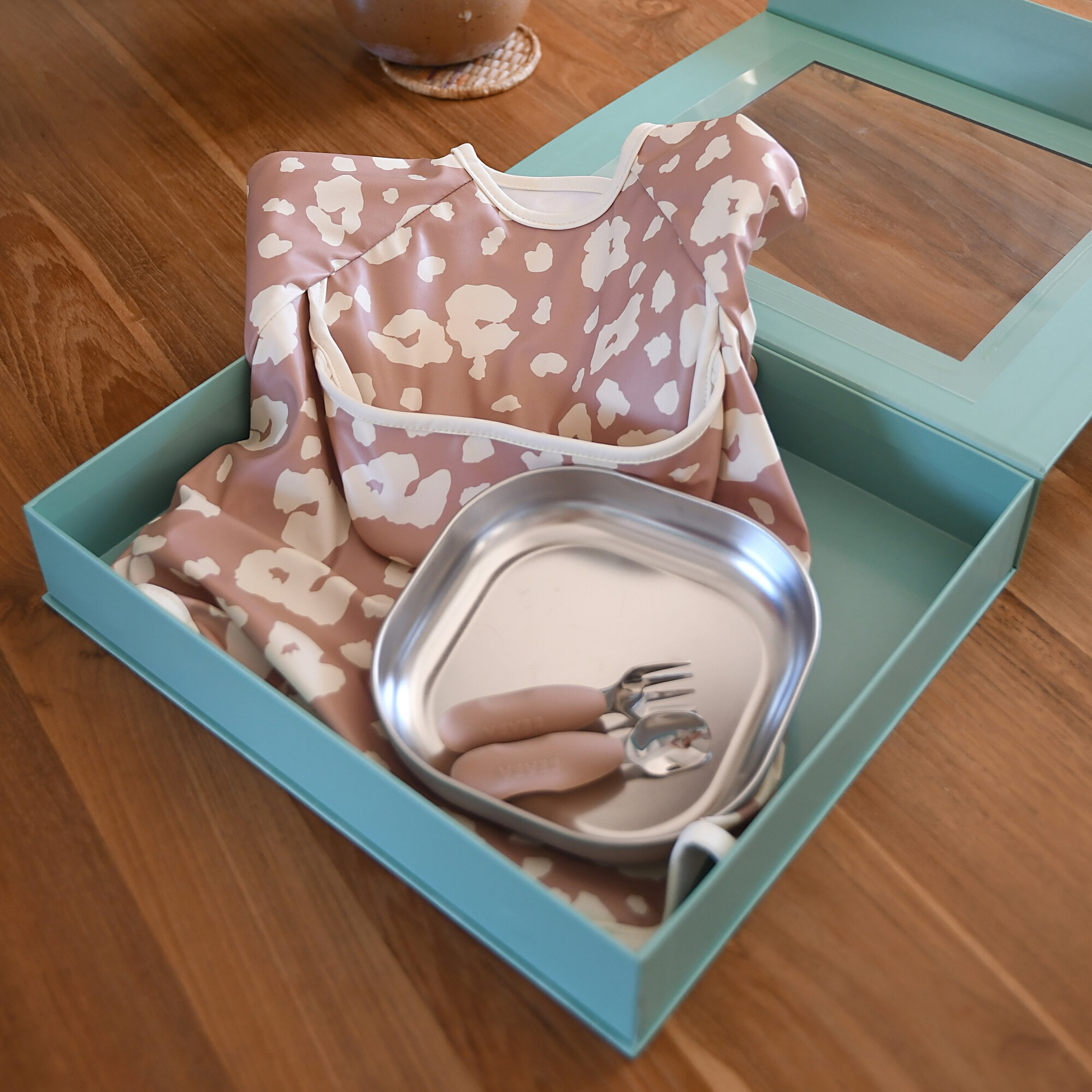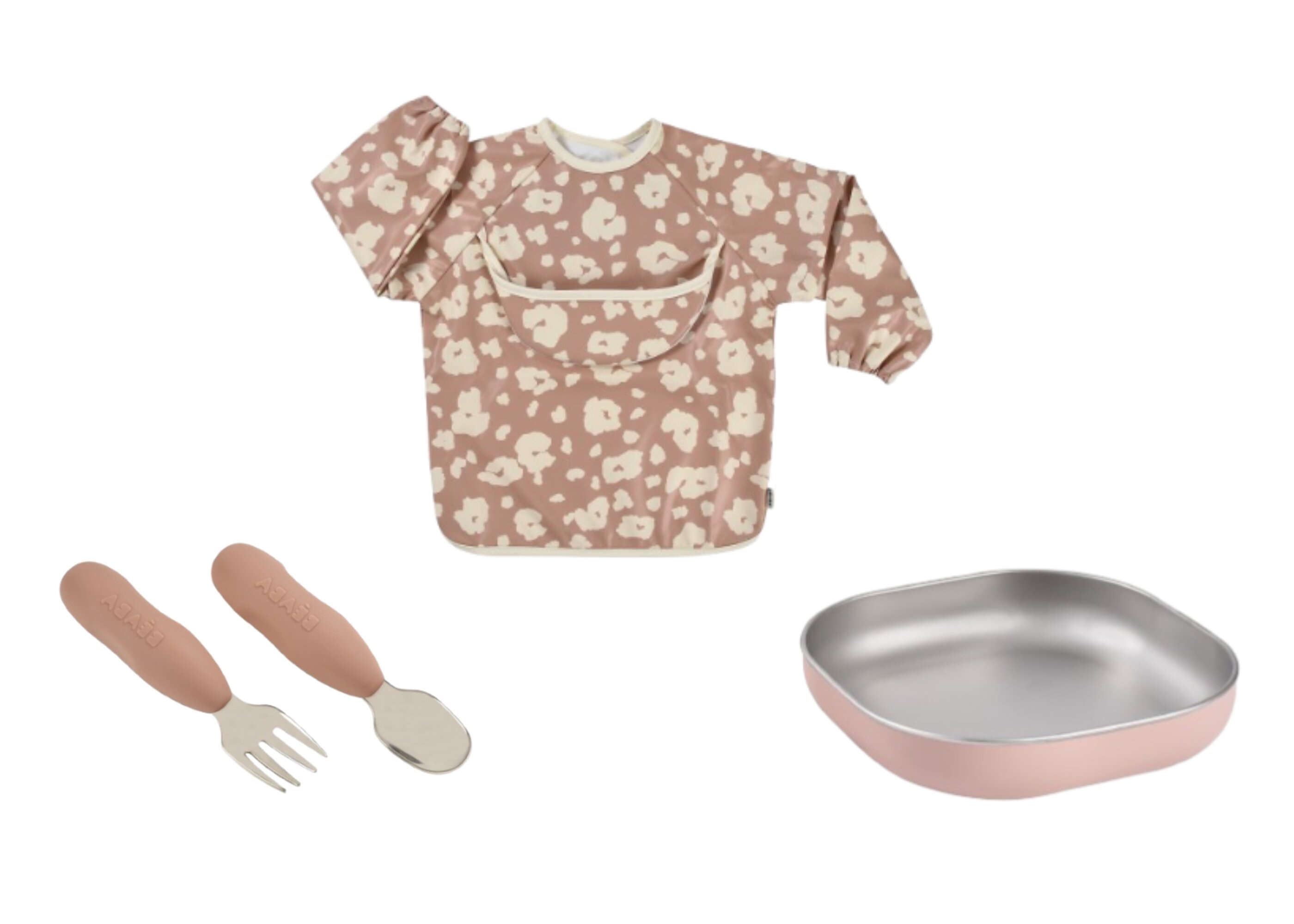 Jídelní sadu pro nejmenší tvoří nerezový talíř se silikonovou povrchovou vrstvou, ergonomická tréninková lžička a vidlička a bryndák s odepínacími rukávy a kapsou na drobky. Krásnou krabičku, ve které je sada zabalená můžete používat i jako krabičku na drobnosti.