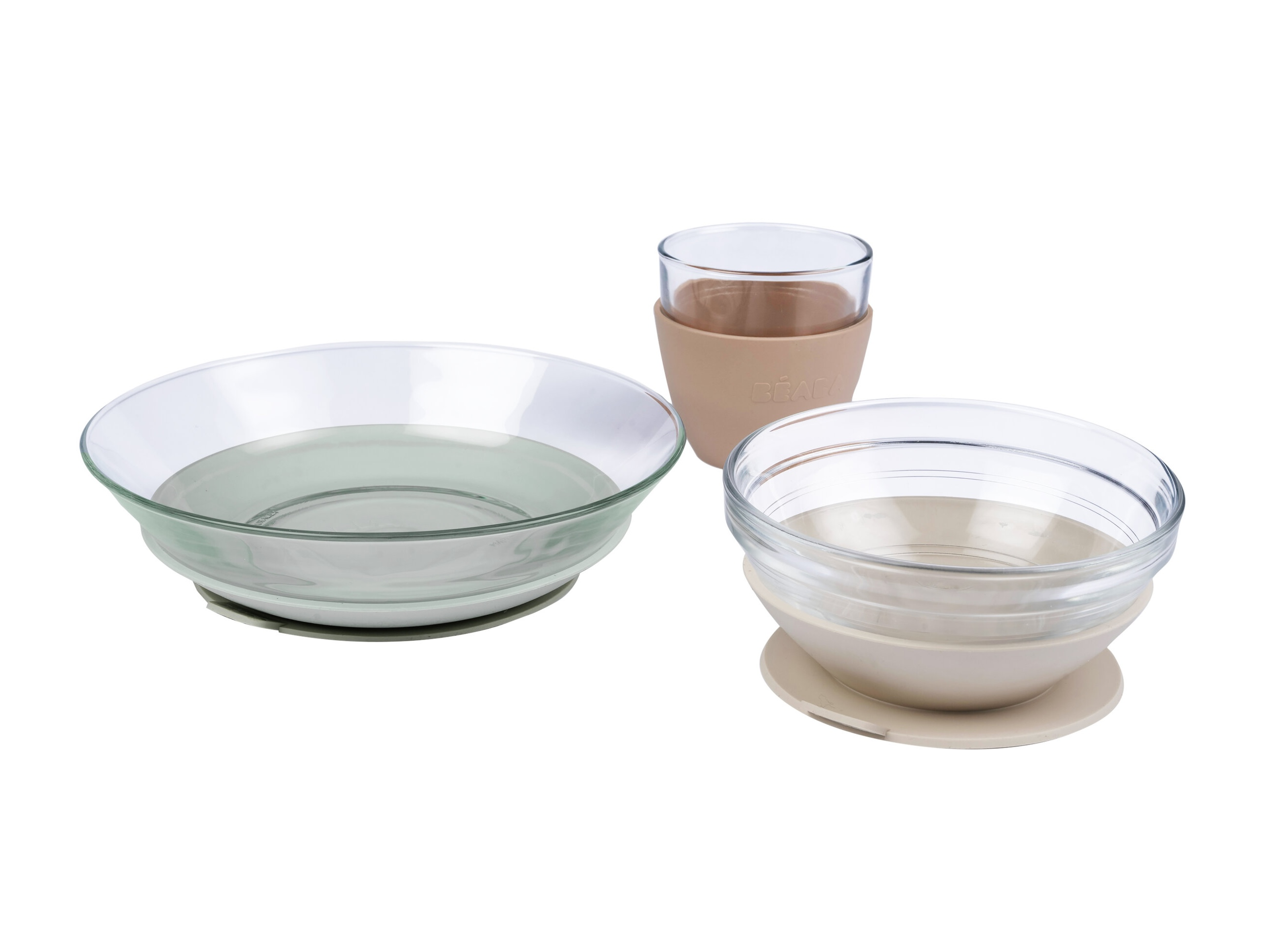 Unikátní sadu nádobí z tvrzeného skla tvoří jídelní miska, talířek a sklenička ergonomického, zaobleného tvaru s hladkými hranami. Miska a talíř jsou doplněny speciálními odnímatelnými podložkami z pružného materiálu s přísavkou, která zajišťuje stabilitu misky či talíře na stole a usnadňuje dítěti stolování. Návlek na skleničku ze stejného materiálu usnadňuje dítěti uchopení skleničky a snižuje riziko jejího vyklouznutí z ruky.