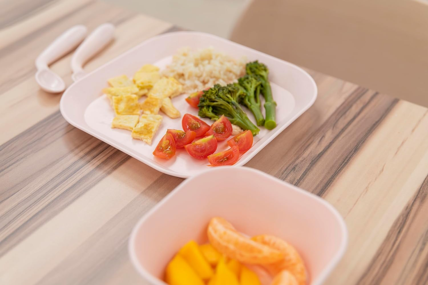 Jídelní sadu tvoří talíř, miska, hrnek se 2 uchy, pružná lžička a vidlička. Talíř i miska s vysokými okraji pomáhají snadnému nabírání pokrmu. Lžička a vidlička jsou vyrobeny z flexibilního příjemného materiálu a mají neklouzavá, kulatá držadla, která usnadňují dítěti držení. Hrnek se dvěma uchy pomáhá dítěti naučit se pít z klasického hrnku.