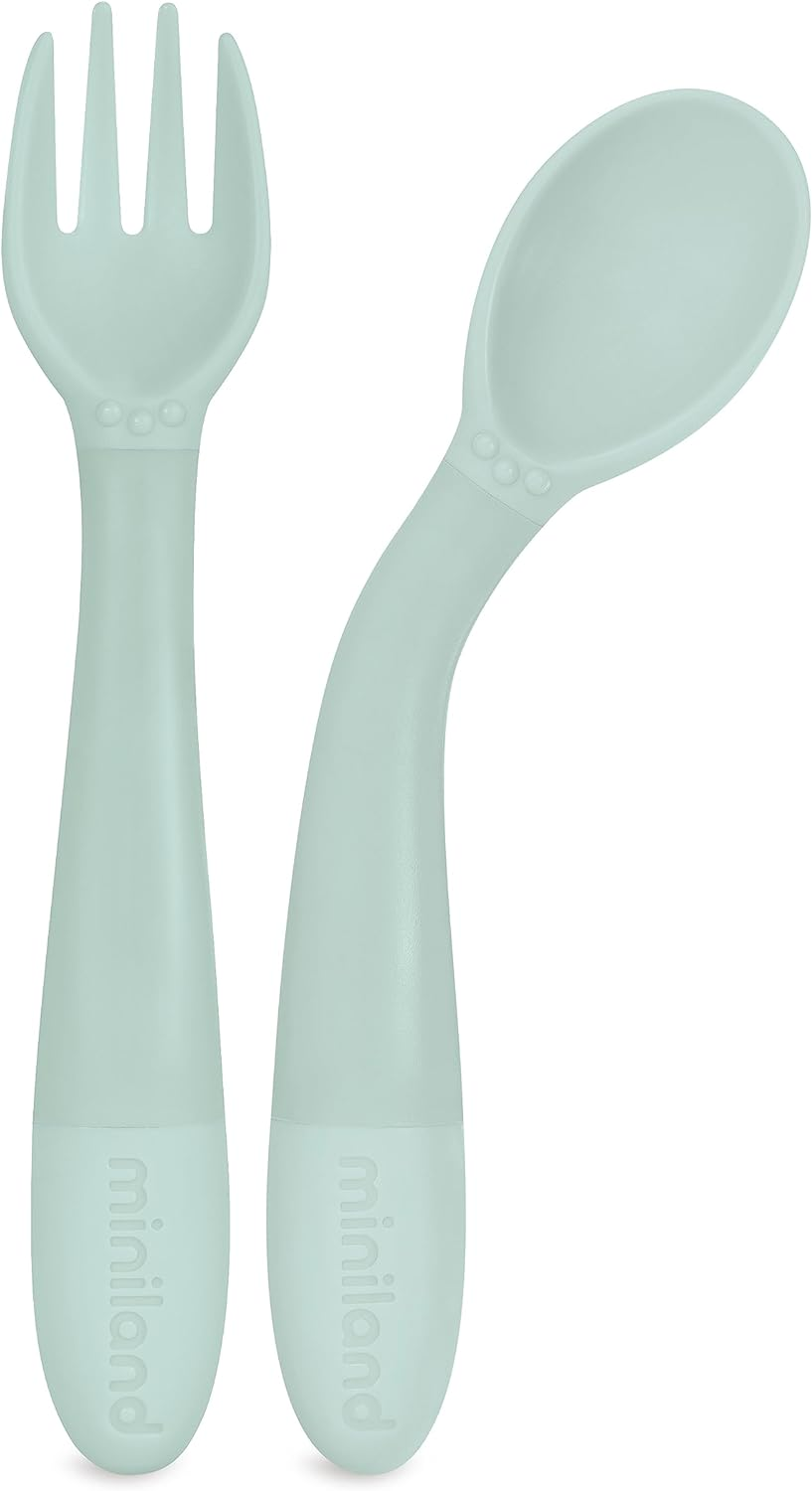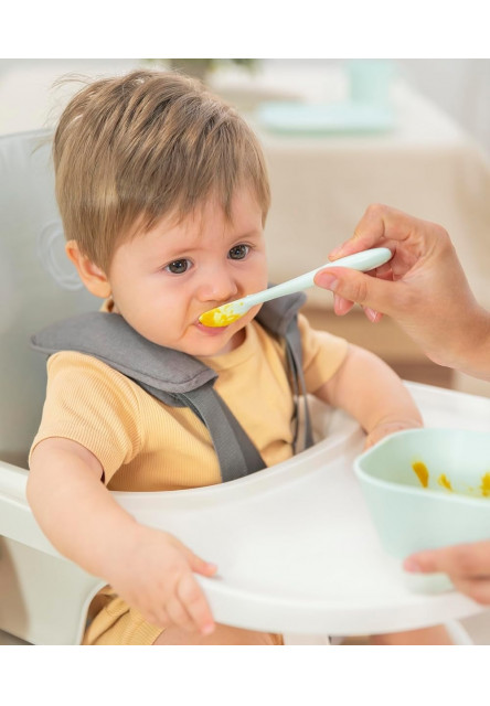 Jídelní sadu tvoří talíř, miska, hrnek se 2 uchy, pružná lžička a vidlička. Talíř i miska s vysokými okraji pomáhají snadnému nabírání pokrmu. Lžička a vidlička jsou vyrobeny z flexibilního příjemného materiálu a mají neklouzavá, kulatá držadla, která usnadňují dítěti držení. Hrnek se dvěma uchy pomáhá dítěti naučit se pít z klasického hrnku.