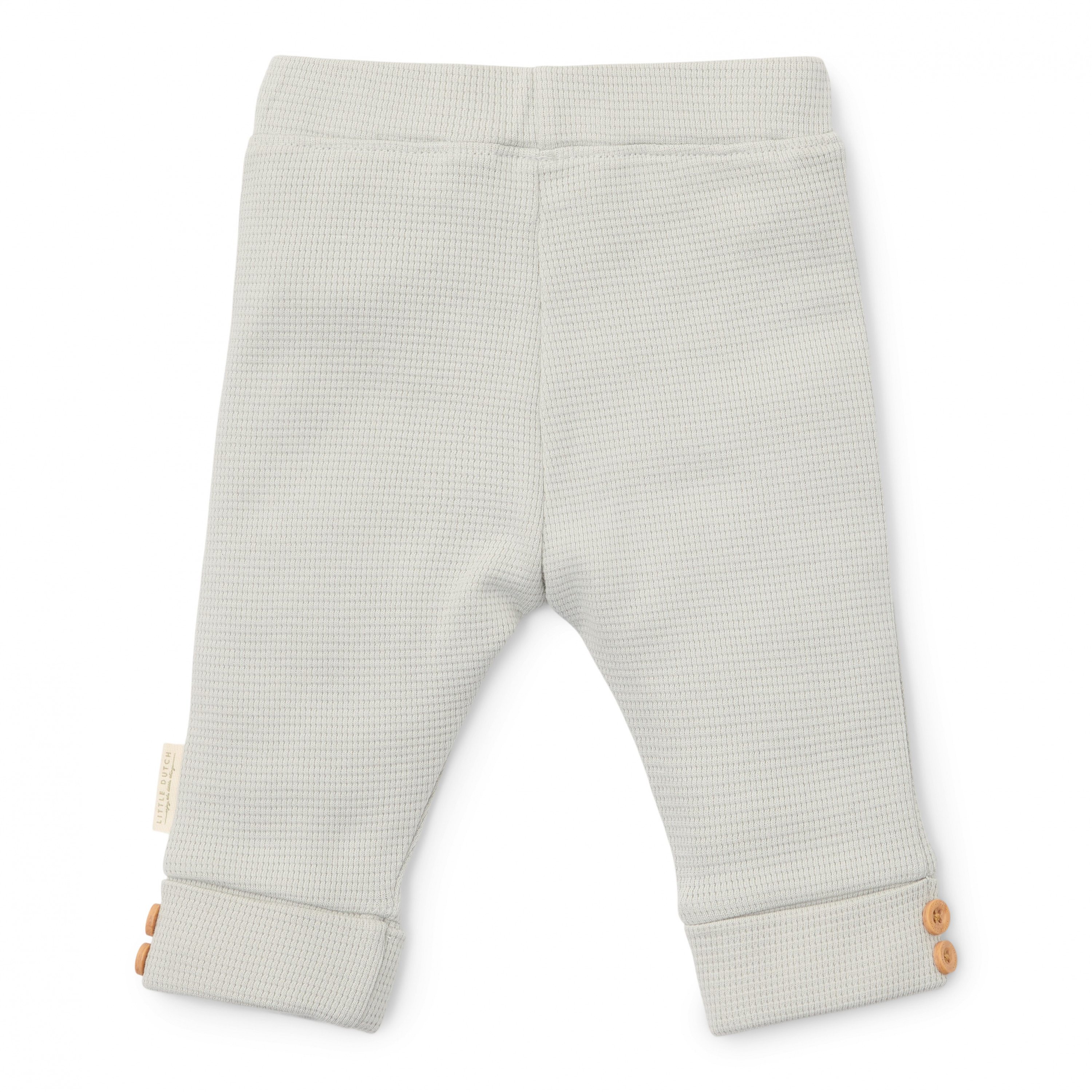 Kalhoty z měkké organické bavlny mají pružný pás pro pohodlí dítěte a dekorativní dřevěné knoflíčky na ohrnutých manžetách nohavic.