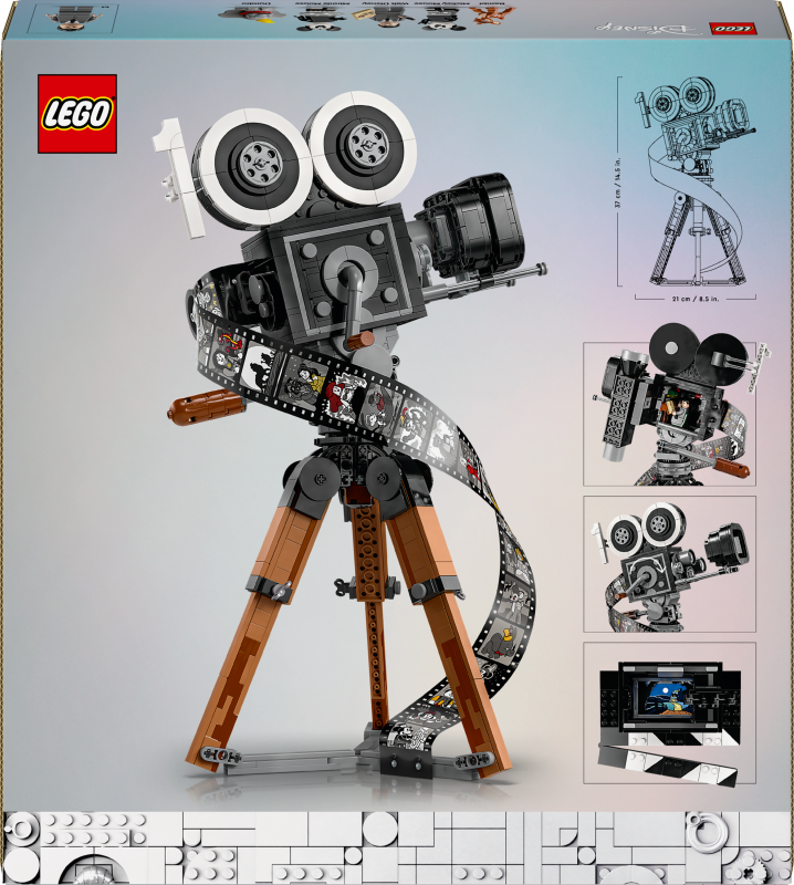 Ukážte svetu svoju lásku pre všetko spojené so štúdiom Disney s touto nádhernou stavebnicou LEGO® | Disney Kamera na počesť Walta Disneyho (43230) pre dospelých. Táto detailne prepracovaná zberateľská stavebnica obsahuje historickú filmovú „kameru“ so zadným panelom, ktorý možno odklopiť a odhaliť prekvapenie a filmovým pásom, na ktorom uvidíte zábery z 20 historických Disney filmov, režisérsku klapku a priestor pre 3 minifigúrky LEGO | Disney, 2 figúrky LEGO zvieratiek a viacrovinovú kameru s 3 obrazovkami z papiera, ktoré zobrazujú, ako sa natáčal krátky film Starý mlyn od štúdia Disney. Stavebnica obsahuje aj otáčajúcu sa kľuku, posuvný „matte box“ a objektívy, ktoré sa dajú otáčať na retro kamere, a navyše pohyblivú spodnú tyč na klapke. Slávnostná pocta Disney Táto prémiová stavebnica LEGO | Disney bola vytvorená na oslavu 100. výročia štúdia Disney. Nájdete v nej 2 známe postavičky a 2 rozpoznateľné zvieratá z kultových filmov a LEGO | Disney minifigúrku Walta Disneyho. Tento jedinečný model bude výrazným zberateľským kúskom ideálnym na vystavenie.