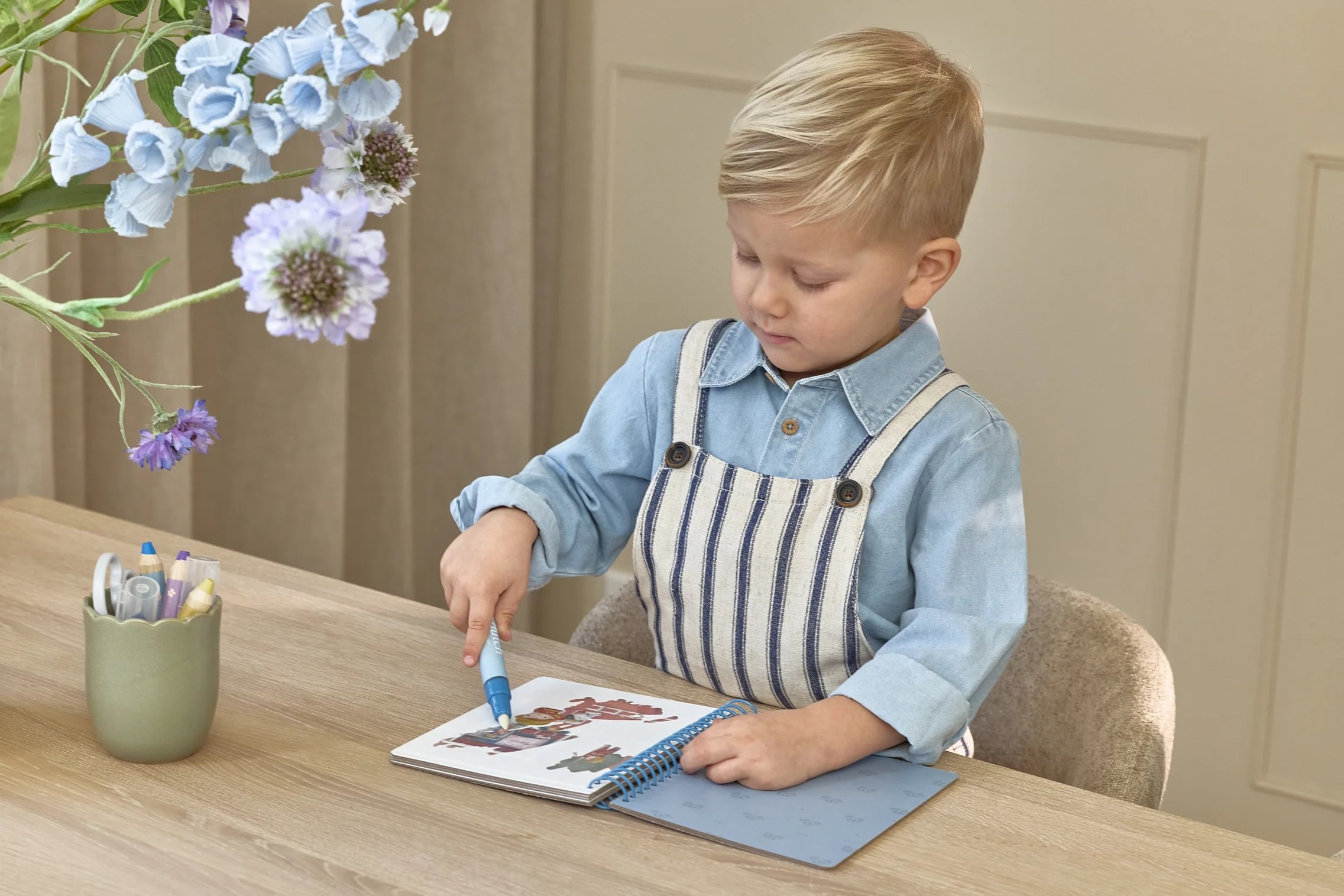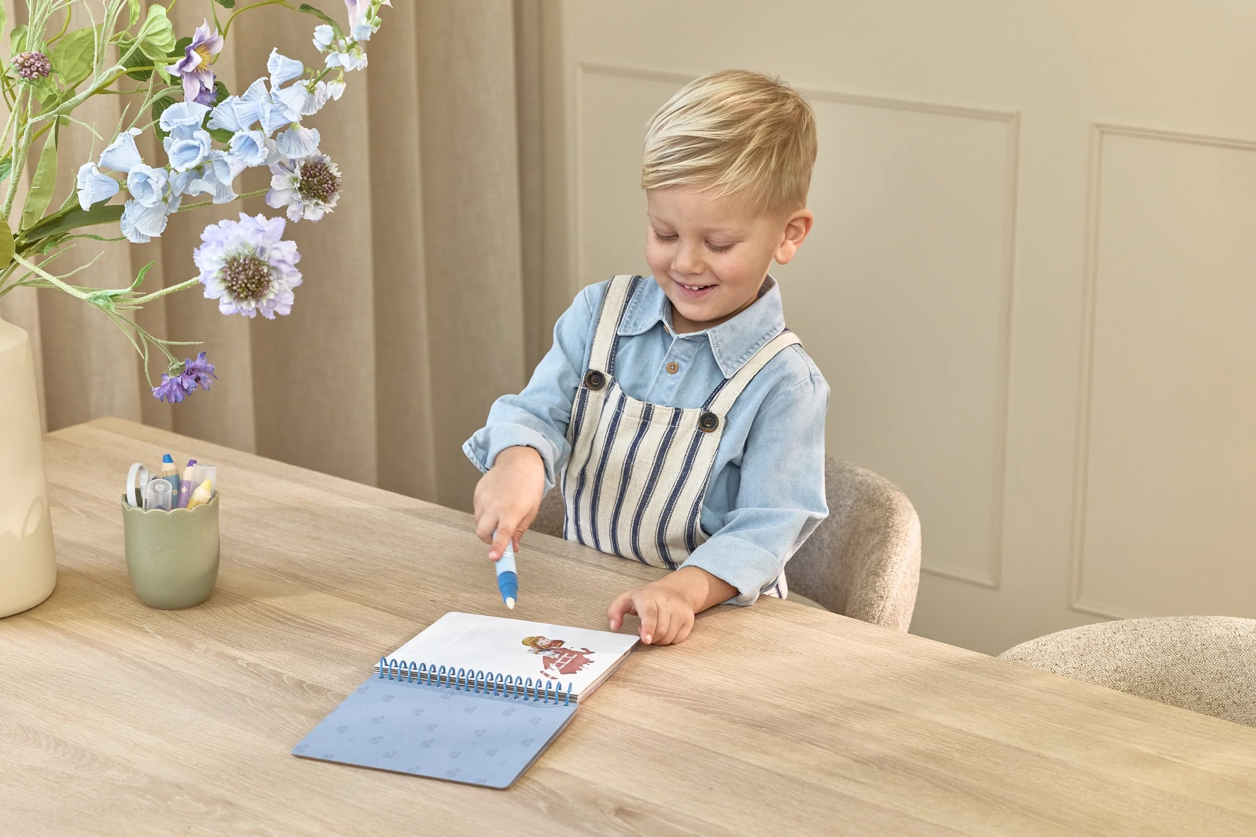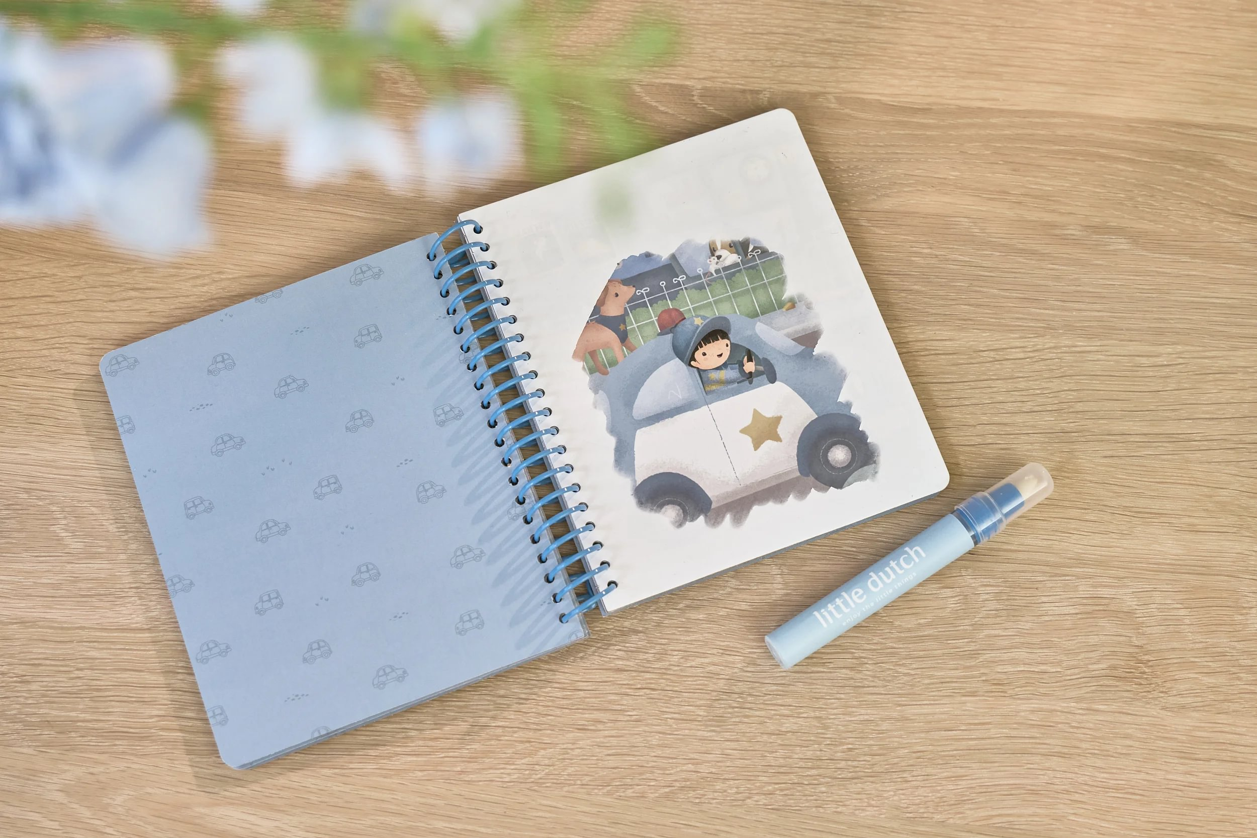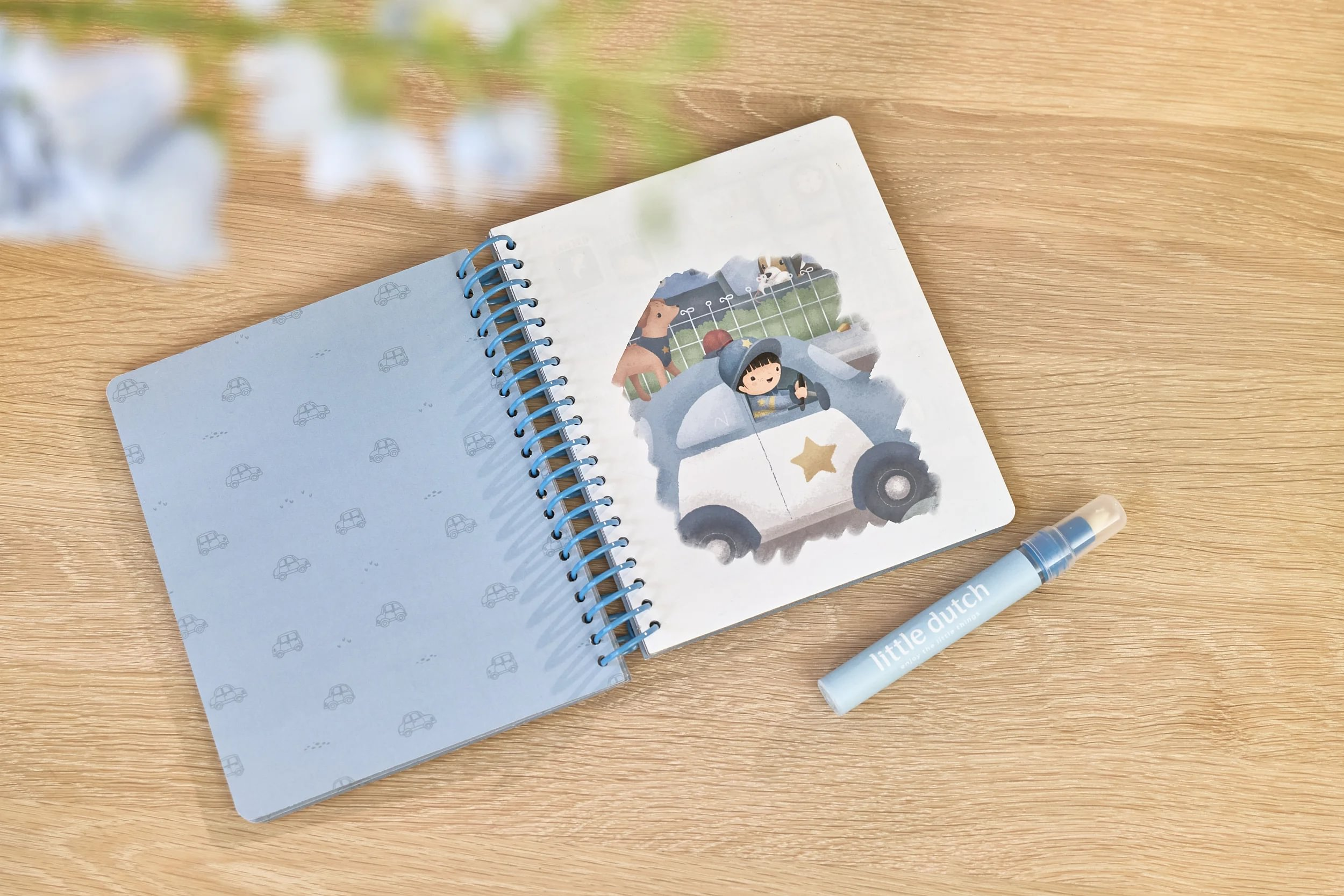 Knižka s piatimi ilustrovanými stránkami je opakovane použiteľná. Vďaka krúžkovej väzbe z pevného kartónu drží otvorená na pohodlné maľovanie.