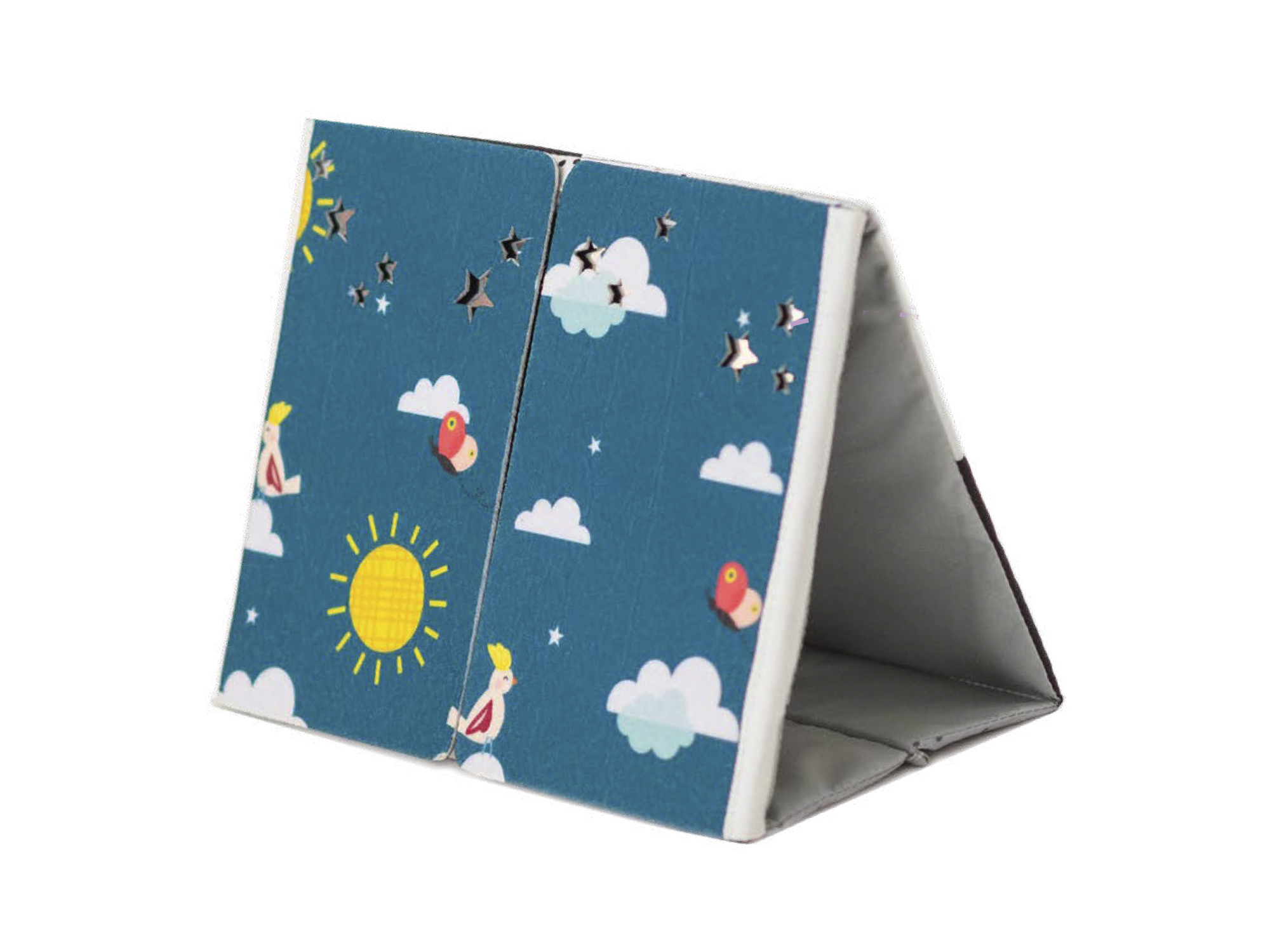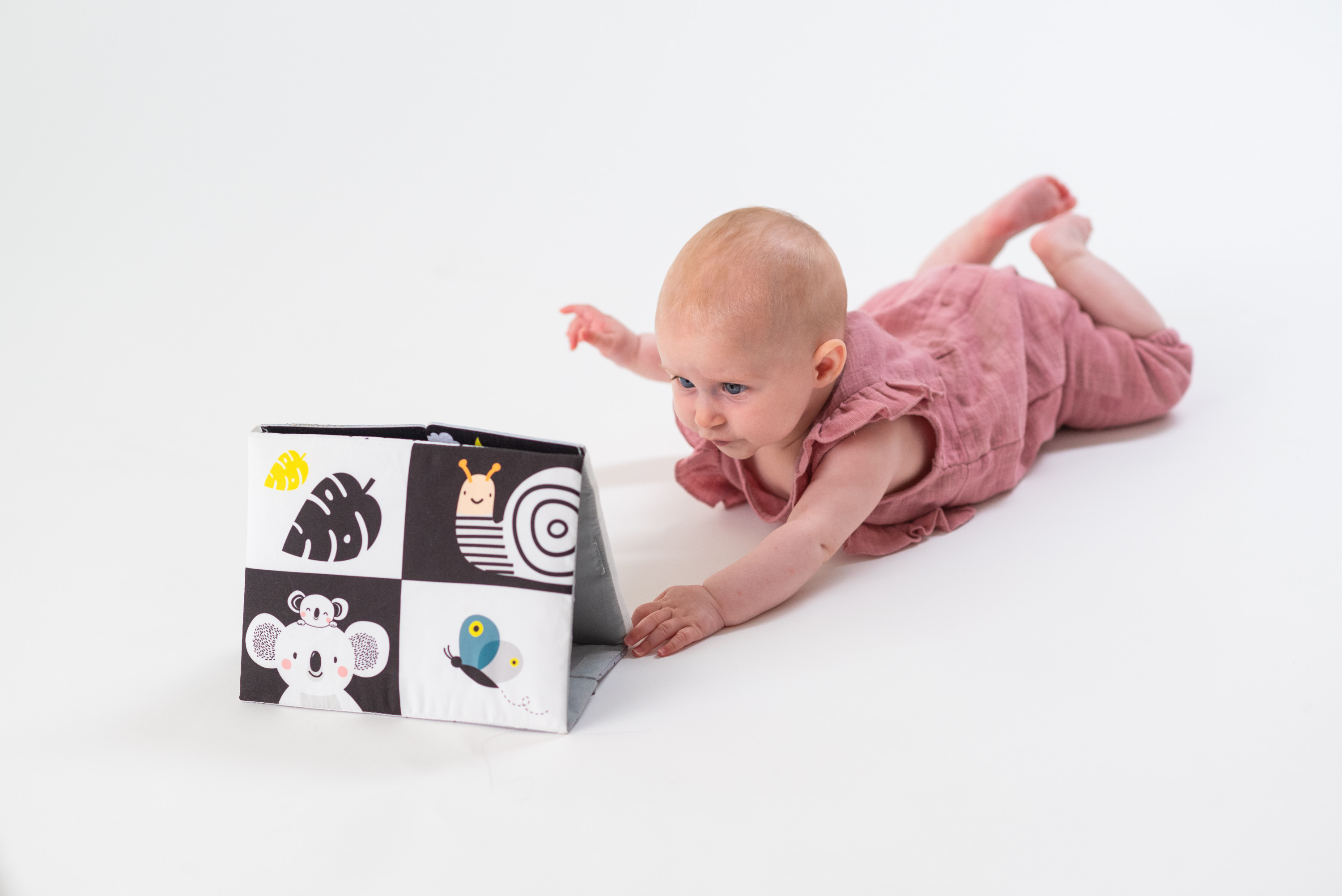 Textilní knížka ve tvaru stolního kalendáře je ideální pro postavení před dítě při hře na bříšku. Neodolatelné vysoce kontrastní obrázky a bezpečné velké zrcátko upoutají pozornost dítěte a pomáhají tak zabavit dítě při hře na bříšku.