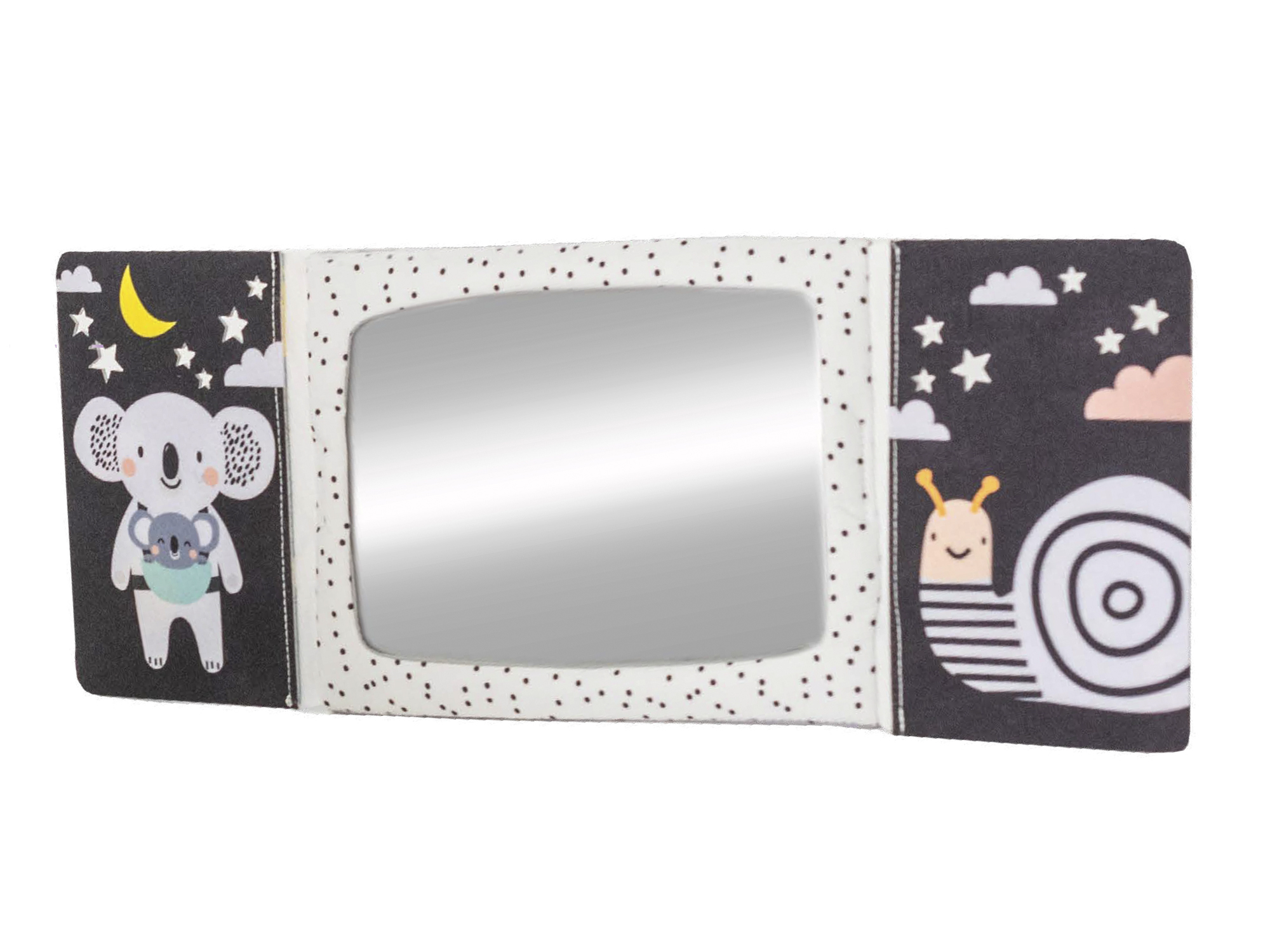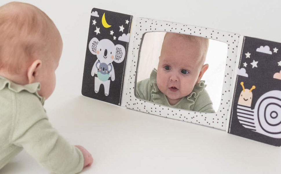 Zrcátko pomáhá dítěti učit se sebeuvědomění a podněcuje rozvoj jeho zraku a komunikačních dovedností. Zrcátko zakryté chlopněmi knihy lze využít i pro oblíbenou schovávací hru Peek-A-Boo mezi rodičem a dítětem.