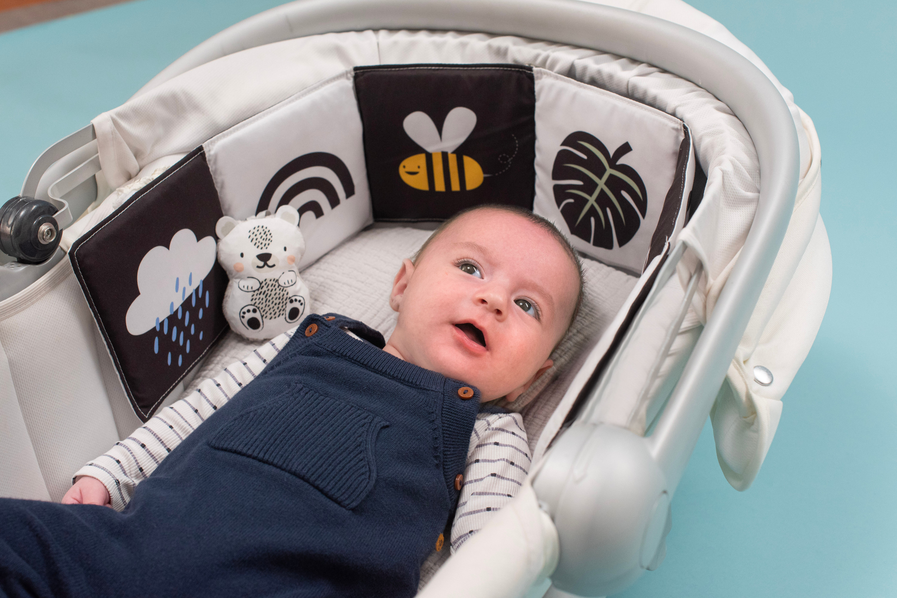 Knížka drží postavená samostatně nebo je možné ji připevnit s pomocí úchytů na postýlku či do kočárku.