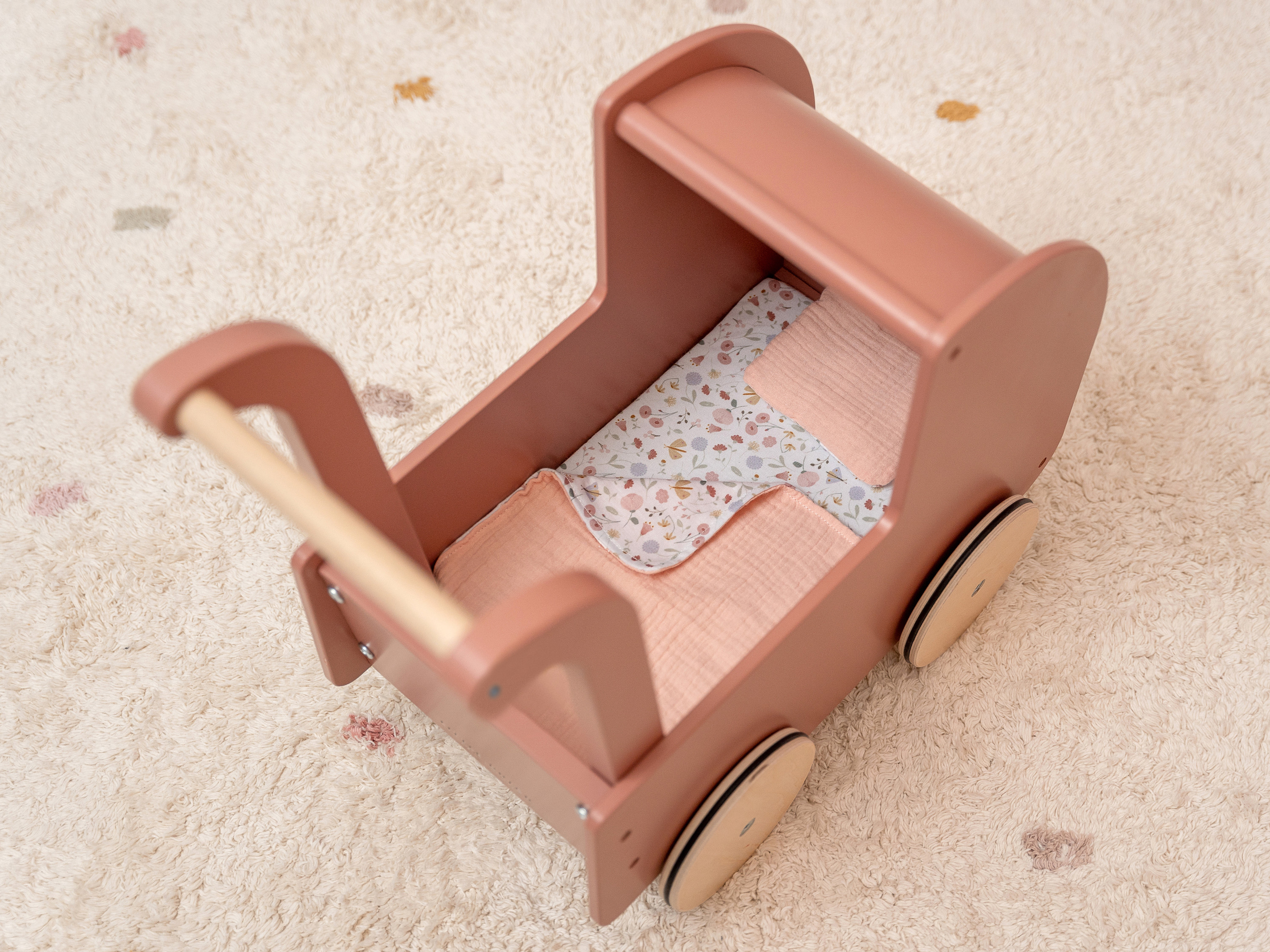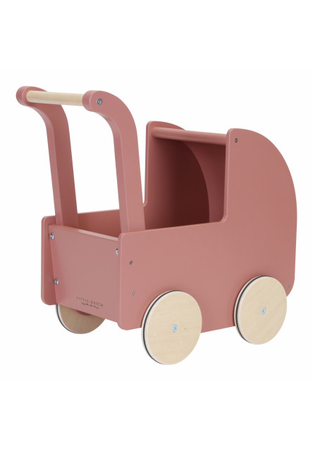 Retro kočárek v krásném dřevěném provedení je vybaven peřinkou, polštářkem a matrací a vybízí tak k uložení oblíbené panenky či plyšáka vašeho dítěte. Díky své velikosti kočárek slouží i jako chodítko, které pomůže dítěti při jeho prvních krůčcích. Jízda s kočárkem podporuje rozvoj rovnováhy, koordinace a motoriky dítěte.
