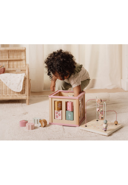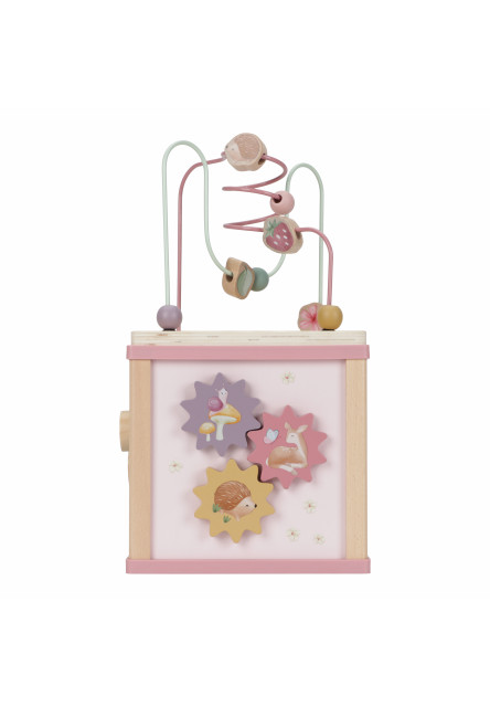 Krásna drevená kocka s aktivitami a motívmi zo života na záhrade vzbudzuje u detí zvedavosť a poskytuje im množstvo zábavy. Jednotlivé strany kocky obsahujú ponúkajú rôznorodé aktivity - napr. triedenie tvarov, rotujúce prevody, hádanky či špirály s posuvnými korálkami.