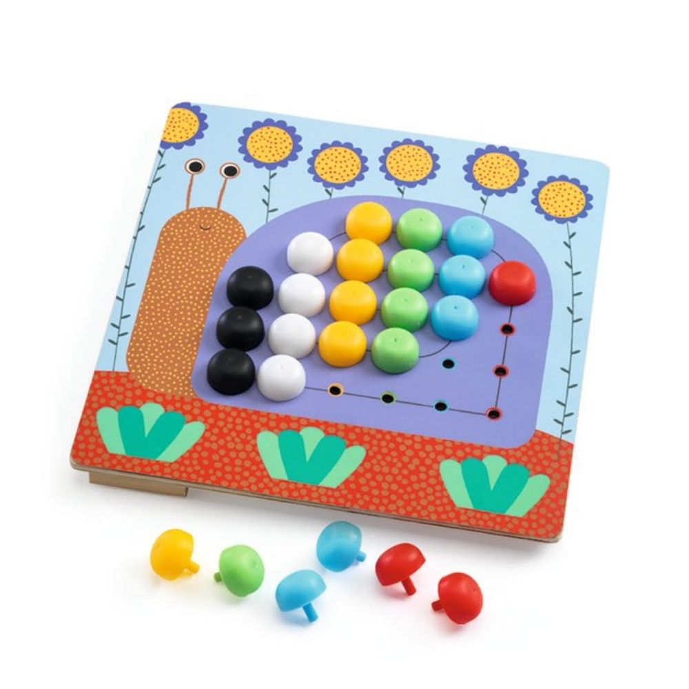 Mozaika obsahuje 8 dierovaných obrázkov s motívom zvieratiek. Dieťa si vyberie obrázok, položí ho na drevenú podložku a vypĺňa ho farebnými kolíčkami. Odporúčaná farba kolíčkov je vyznačená farebným krúžkom okolo dierok na obrázku. Vďaka širokým hlavičkám kolíčkov je mozaika vhodná pre deti už od 3 rokov.