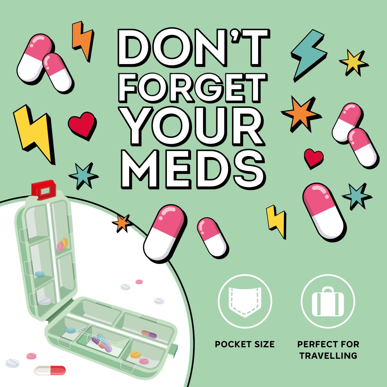 Krabička na pilulky – SOS od Legam: usporiadajte si tablety do priehradiek a vložte ich do kabelky alebo kufra, alebo si ich uložte na nočný stolík.
