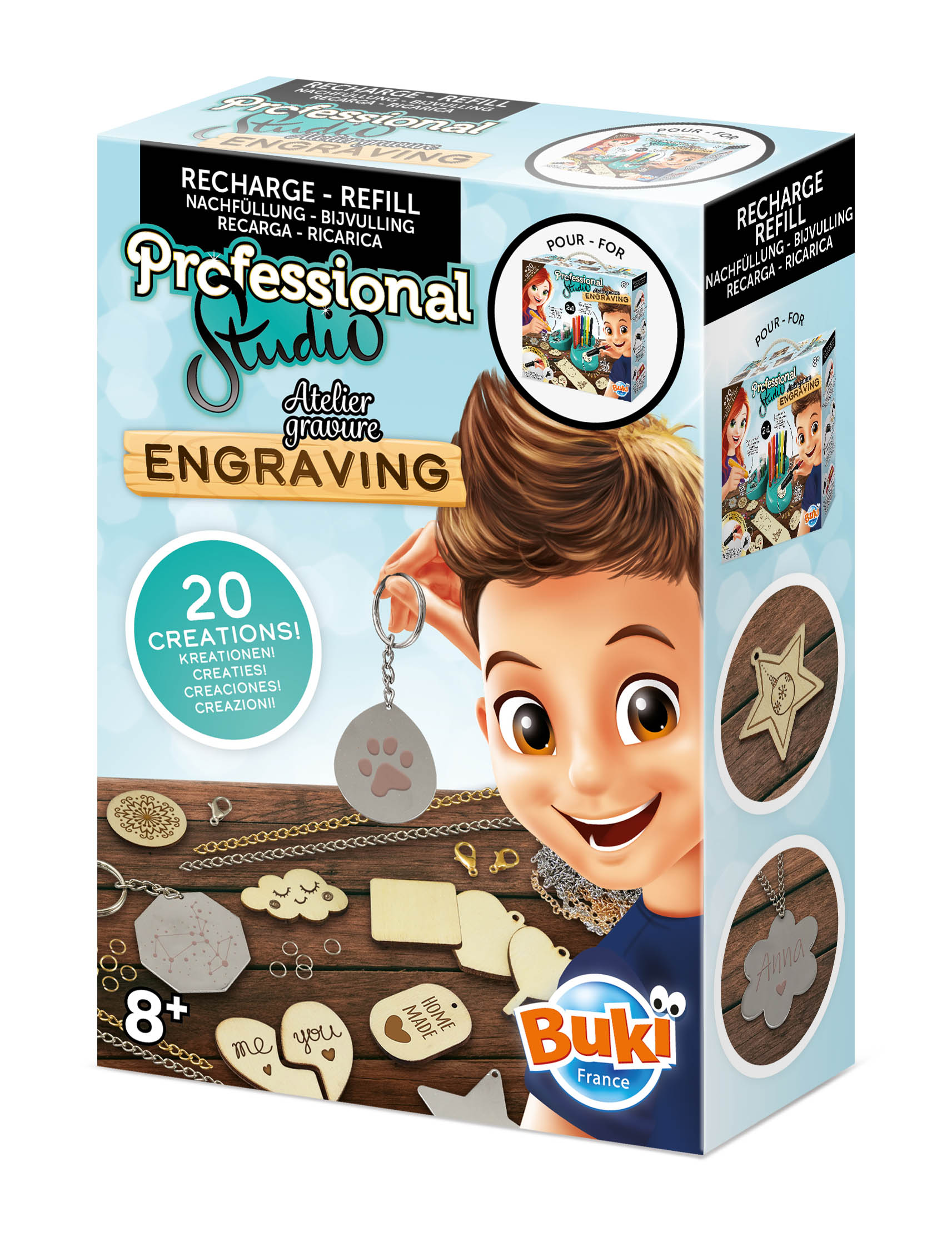 Balenie je doplnkom pre súpravu Kreatívna sada - Gravírovanie. Obsahuje kovové a drevené podkladové materiály rôznych tvarov, retiazky, krúžky, spony atď. Balenie umožňuje vyrobiť 5 magnetiek, 5 kľúčeniek, 10 náhrdelníkov.