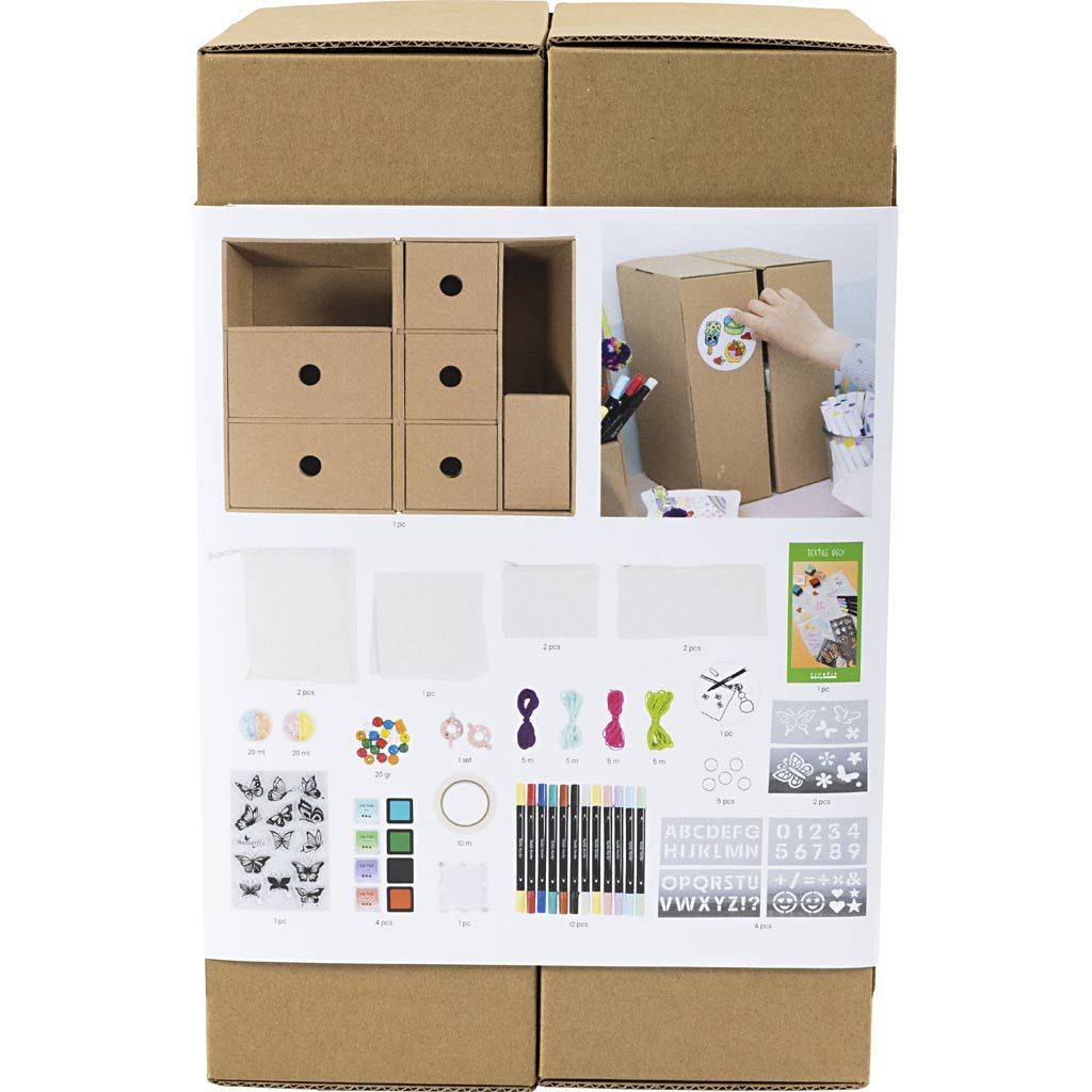 Maxi kreatívna sada v boxe so zásuvkami je plná materiálov na dekorovanie textilu. Nájdete v nej fixy, šablóny a rôznorodé doplnky pre nekonečné tvorenie aj veľa inšpirácie pre prvé projekty.