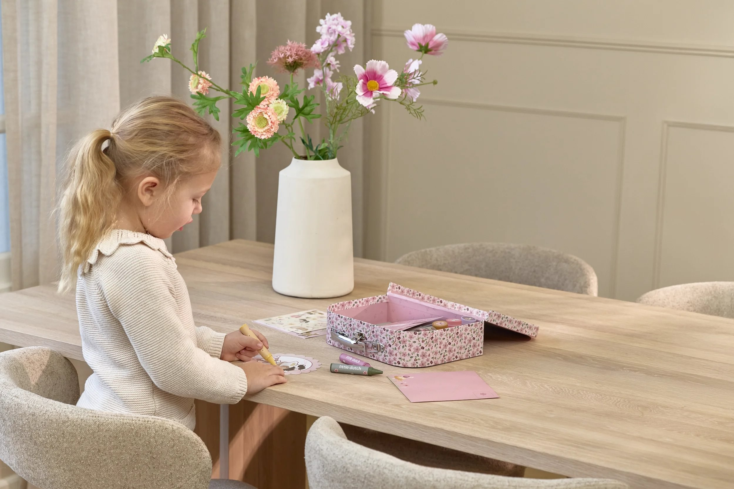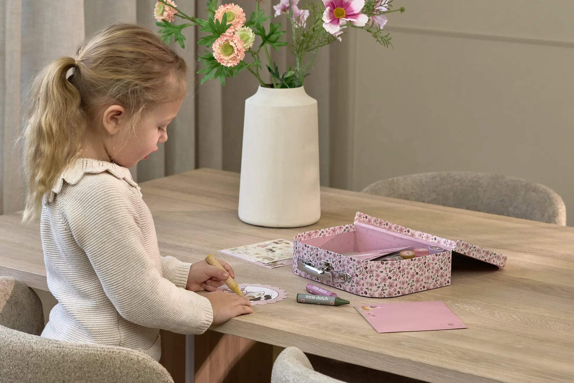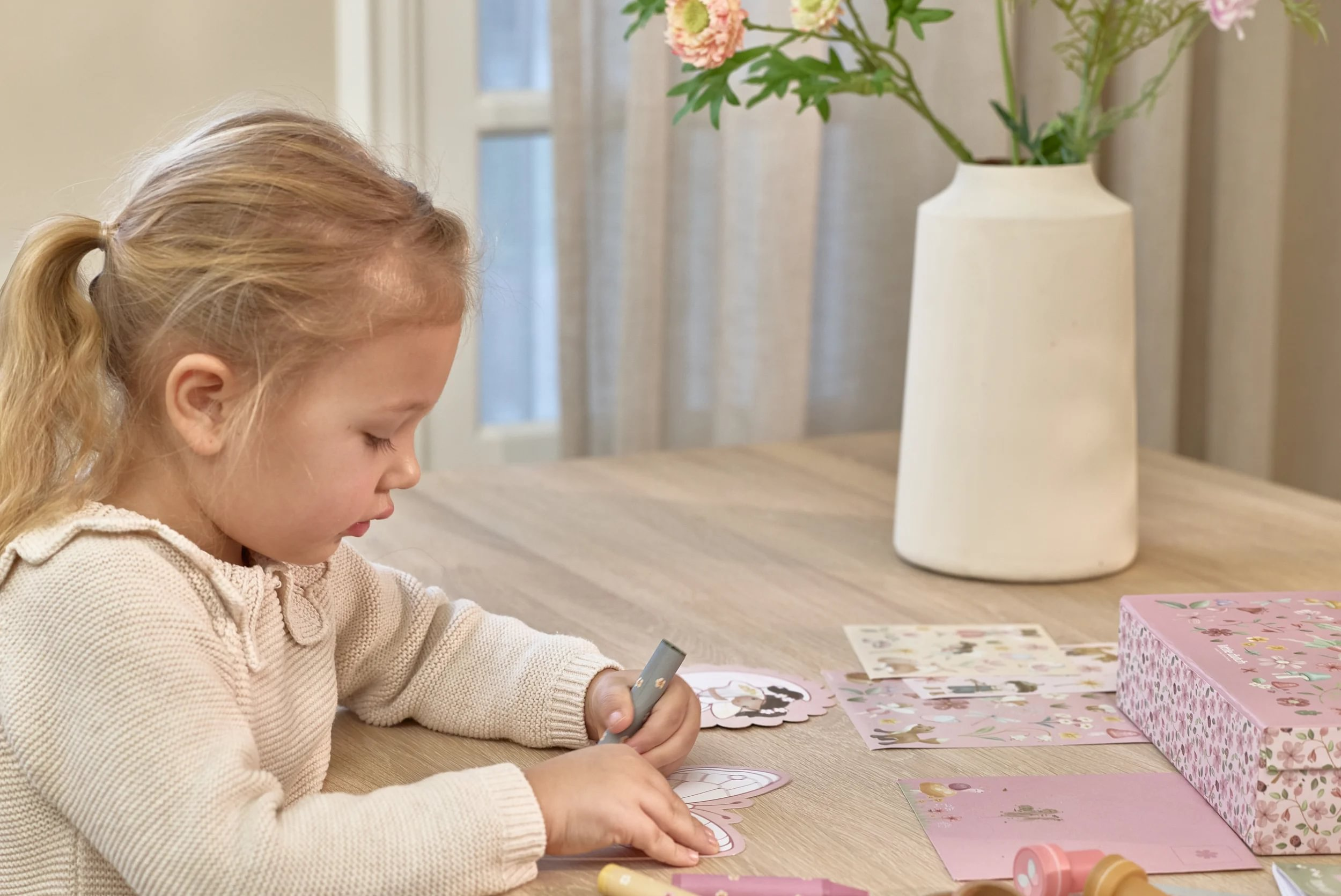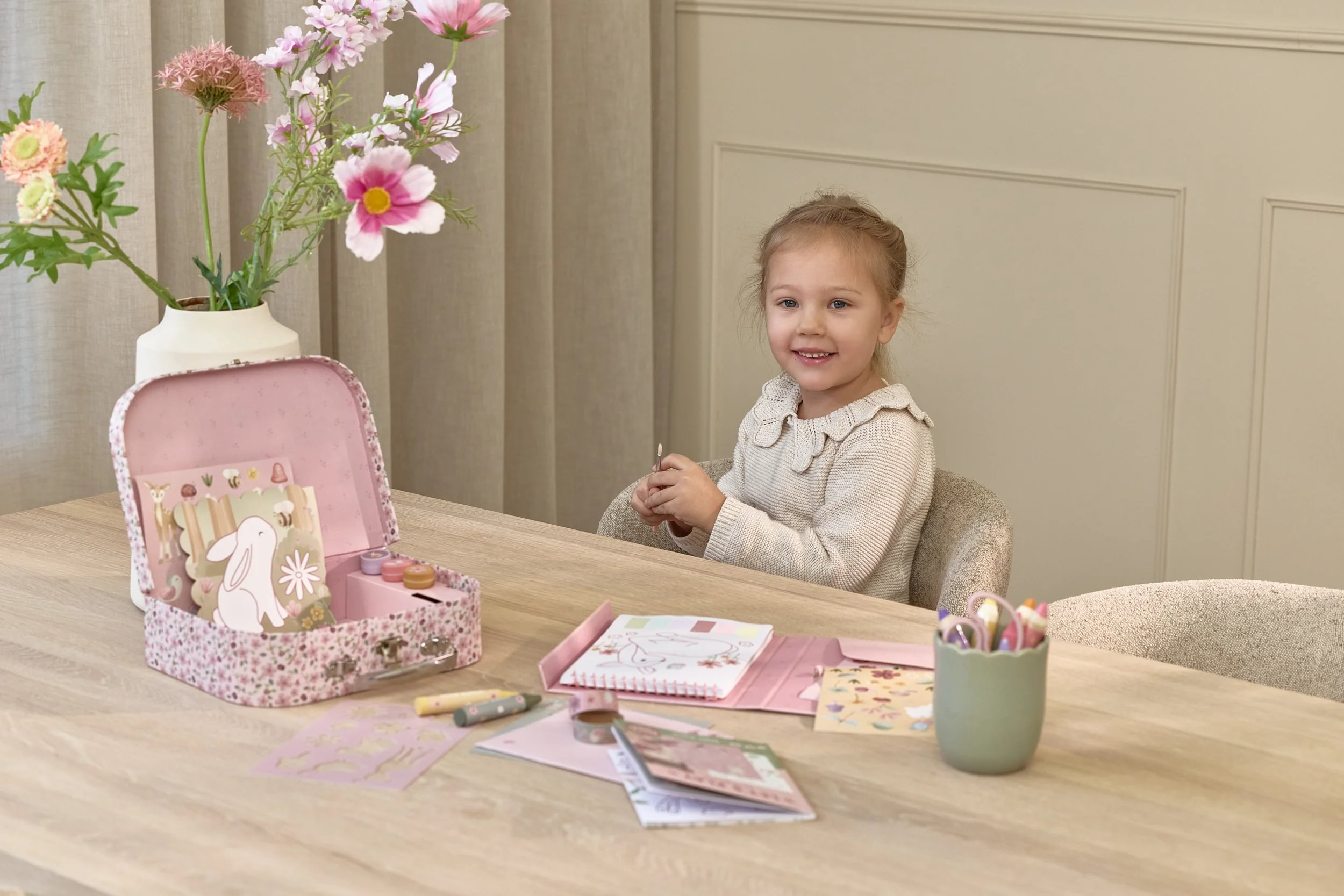 Veľká kreatívna súprava obsahuje potreby pre rôzne druhy výtvarného tvorenia vrátane pasteliek, samolepiek, pečiatok a pod. Motívy zo života rozprávkovej víly, zvieratká a kvety, to všetko nabáda k vymýšľaniu príbehov a kreatívnemu tvoreniu. Všetko je zabalené v krásnom kufríku, do ktorého všetko po skončení hry ľahko upracete.
