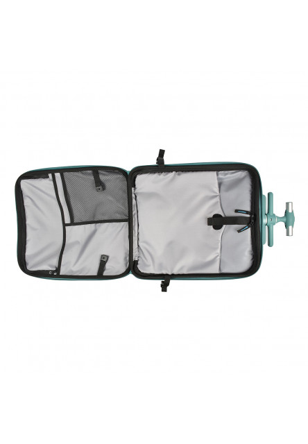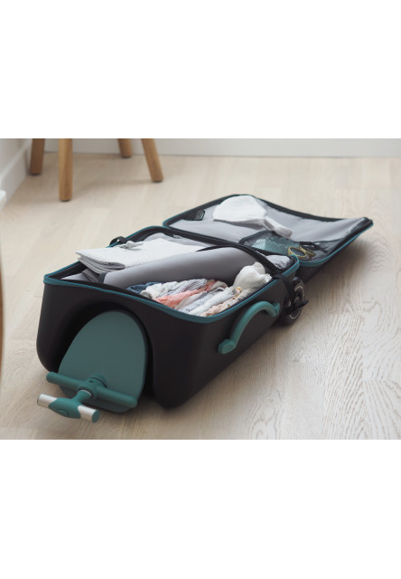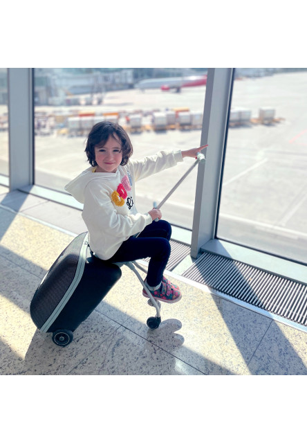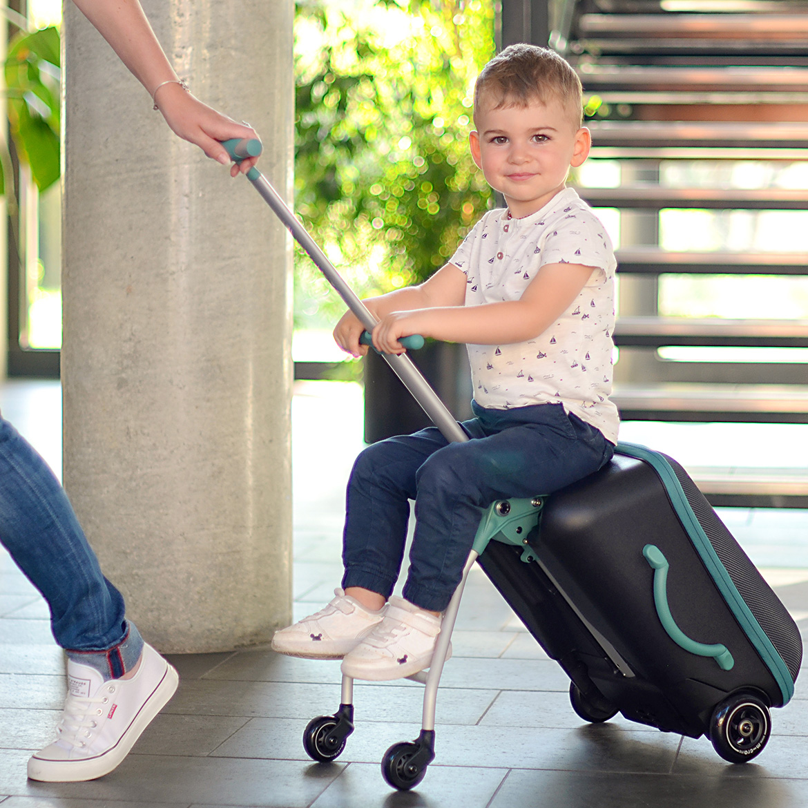 Unikátní kabinové zavazadlo usnadní a zrychlí vaše cestování s malým dítětem na letišti, na nádraží apod. Kufr je vybaven sedátkem, na kterém můžete vozit sedící dítě. Maximální stabilitu při jízdě se sedícím dítětem poskytují vyklápěcí opěrné nohy s kolečky. Vytahovací držadlo a přední kolečka otočná o 360° nabízí pohodlné ovládání kufru.