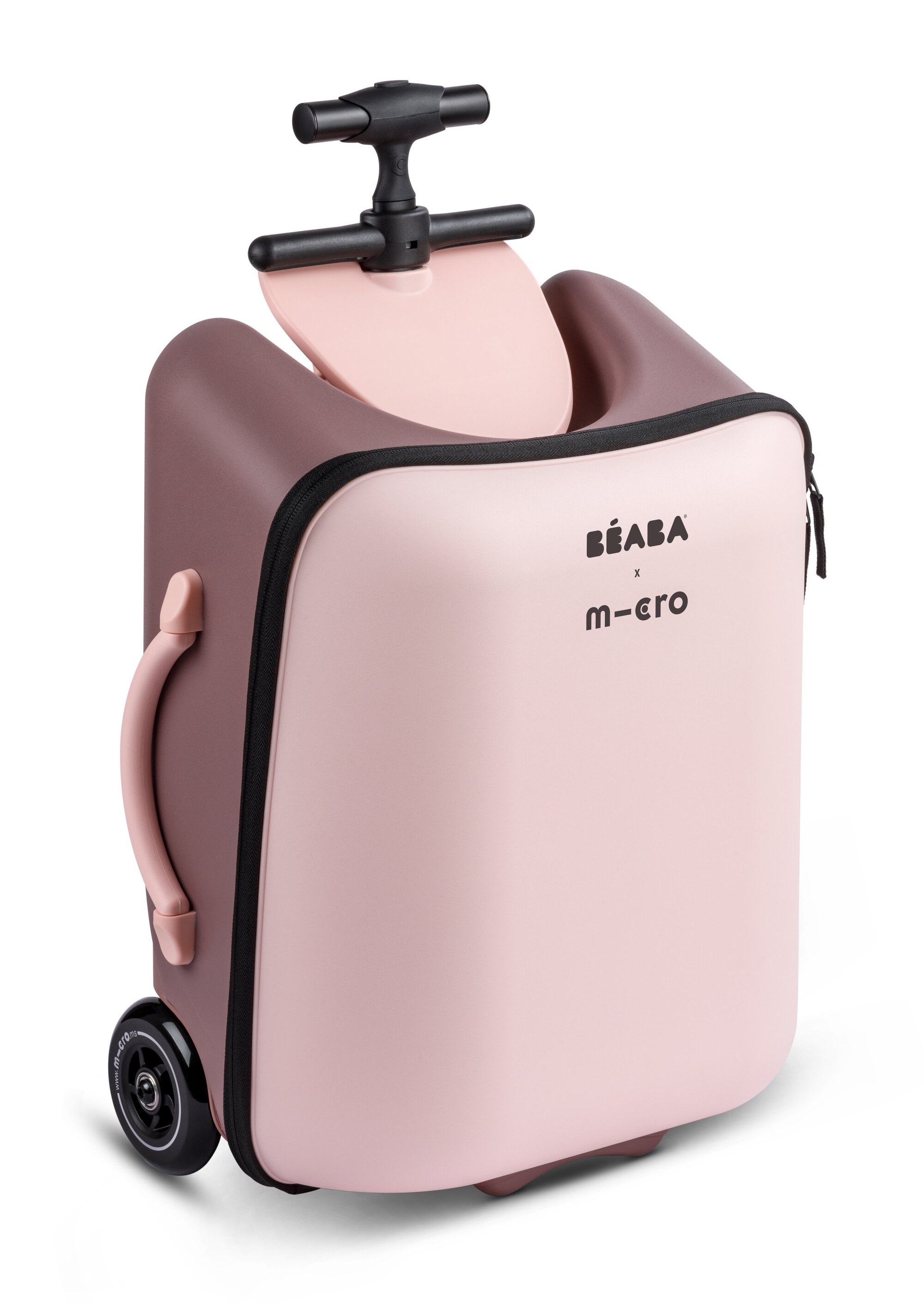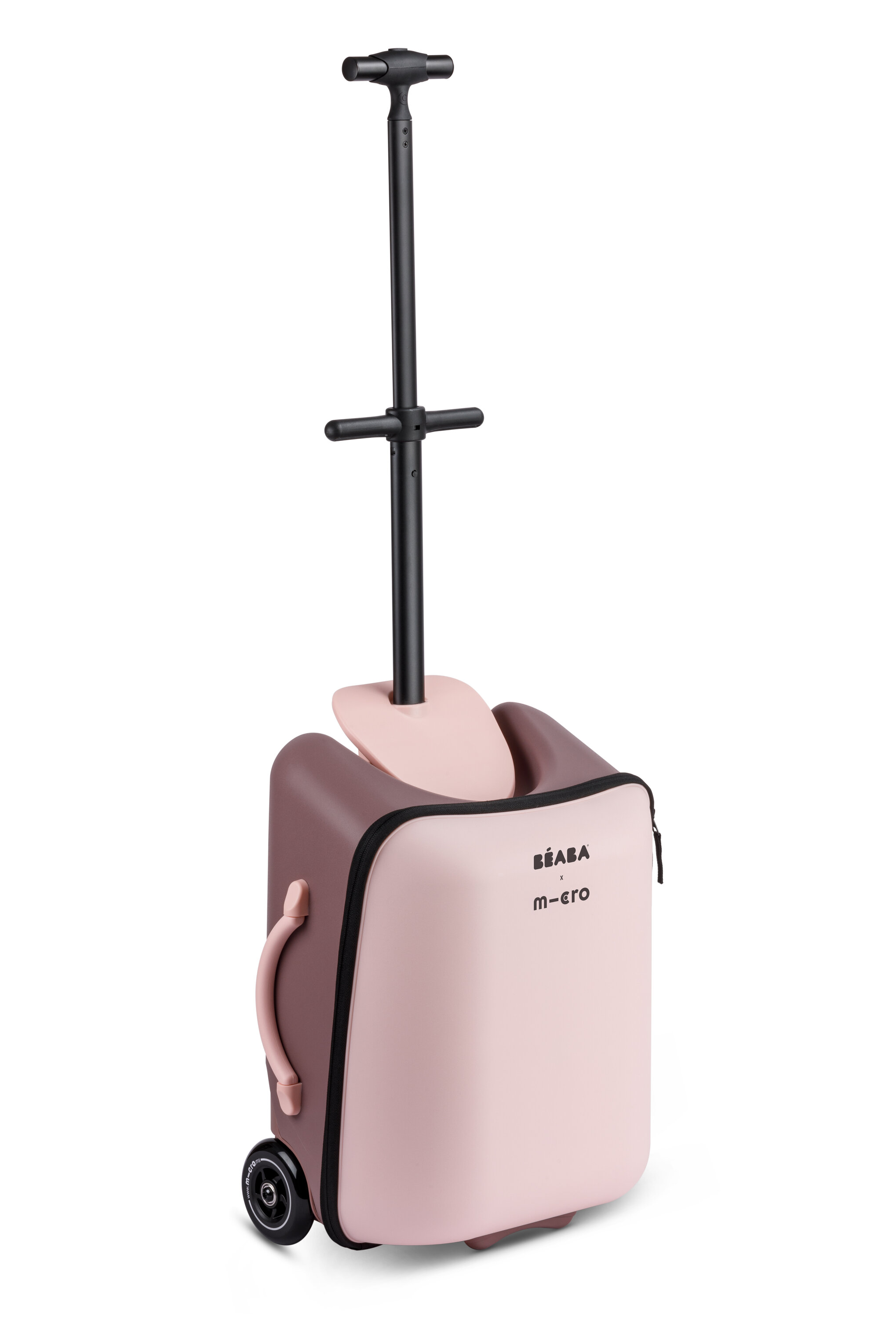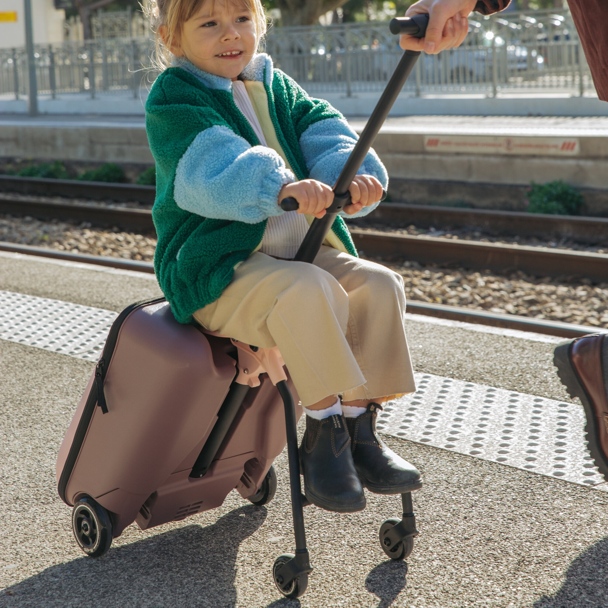 Unikátní kabinové zavazadlo usnadní a zrychlí vaše cestování s malým dítětem na letišti, na nádraží apod. Kufr je vybaven sedátkem, na kterém můžete vozit sedící dítě. Maximální stabilitu při jízdě se sedícím dítětem poskytují vyklápěcí opěrné nohy s kolečky. Vytahovací držadlo a přední kolečka otočná o 360° nabízí pohodlné ovládání kufru.