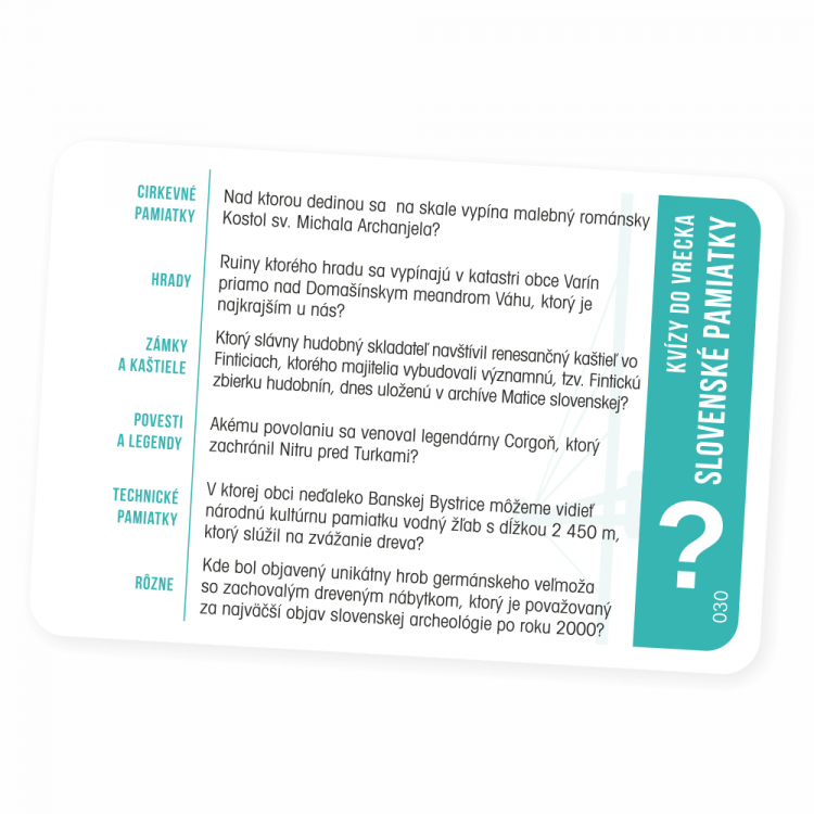 Pútavý zábavný kvíz o Slovenských pamiatkach. Hra je vďaka svojmu prevedeniu vhodná aj na cesty – stačí vziať do vrecka a môžete začať hrať kdekoľvek. Víno môžete hrať samostatne, ale kartičky môžu byť tiež pre spestrenie použití v základných verziách hier Slovensko, Svet a Európa – otázky a odpovede. V hre nájdete 300 otázok rozdelených do 6 tematických okruhov: Cirkevné pamiatky, Hrady, Zámky a kaštiele, Povesti a legendy, Technické pamiatky a Rôzne.