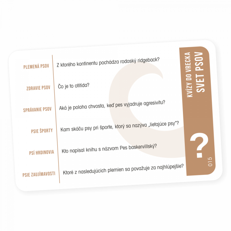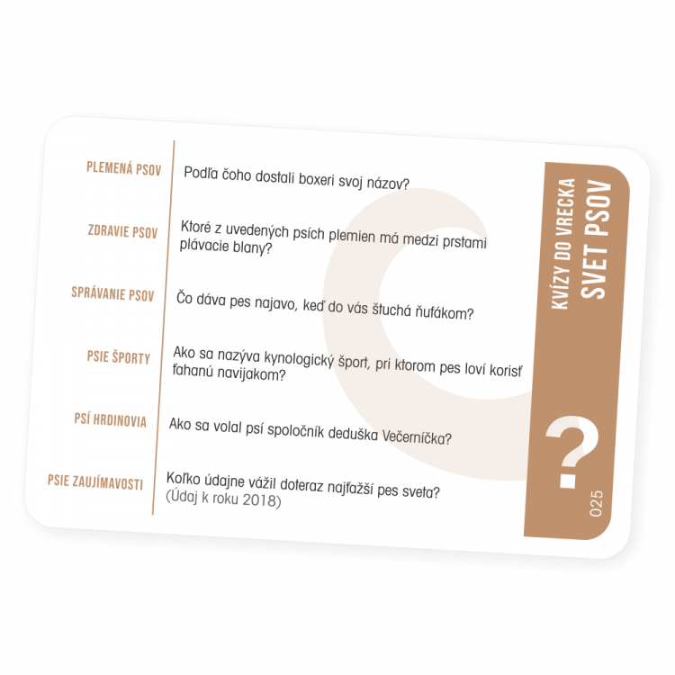 Pútavý zábavný kvíz, ktorý vás zoznámi s najobľúbenejšími domácimi miláčikmi. Hra je vďaka svojmu prevedeniu vhodná aj na cesty – stačí ju vziať do vrecka a môžete začať hrať kdekoľvek. V hre nájdete 300 otázok rozdelených do 6 tematických okruhov: Plemená psov, Zdravie psov, Správanie psov, Psie športy, Psí hrdinovia a Psie zaujímavosti. Hra obsahuje: 50 kariet, pravidlá