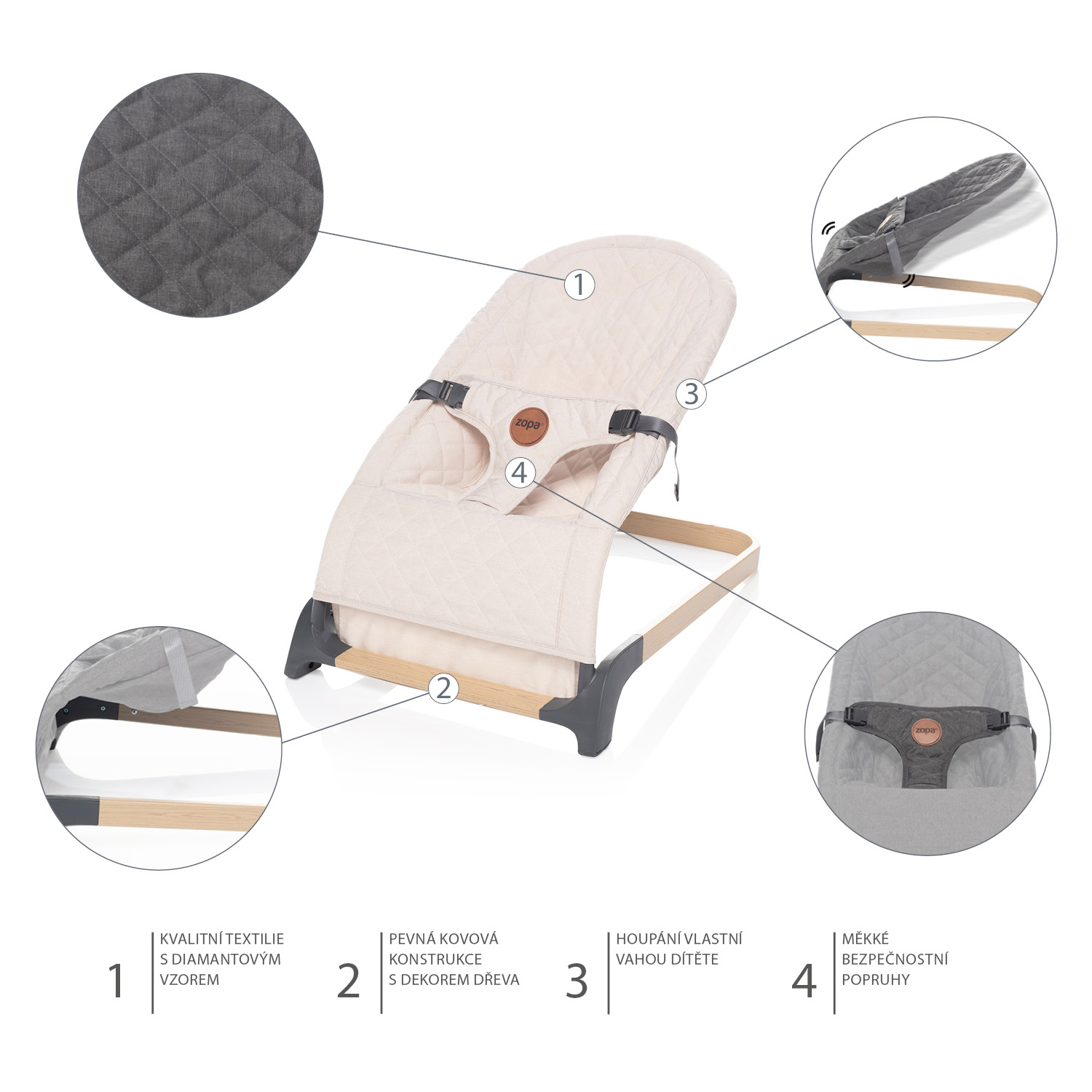 • Jednoduchá inštalácia• Kvalitná textília s diamantovým vzorom• Hojdanie vlastnou váhou dieťaťa• Jednoduché zloženie• Poťah je možné prať na 30°C• Spĺňa bezpečnostnú normu EN 12790Rozmery: