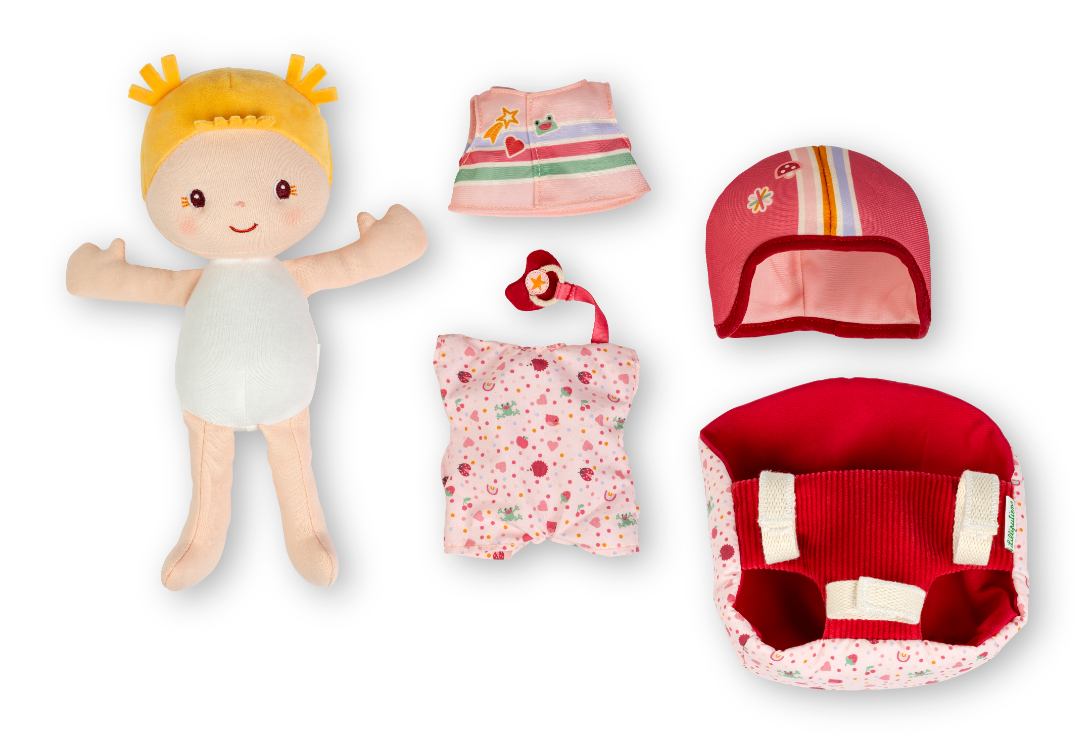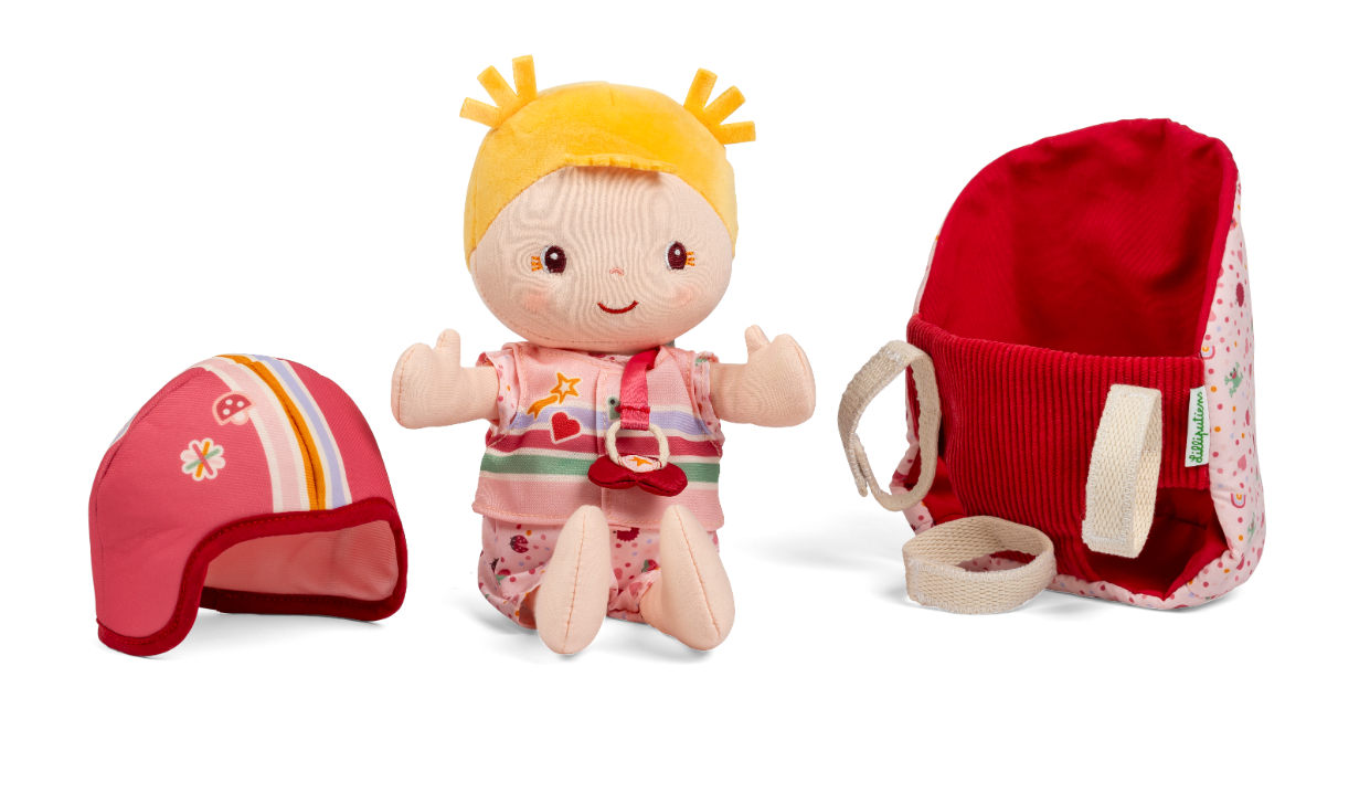 Ste pripravení na prechádzku na bicykli s bábikou Lenou? S touto látkovou bábikou a jej sedačkou na bicykel, má vaše dieťa všetko, čo potrebuje na napodobňovanie dospelých a na prechádzku na bicykli alebo odrážadle, a to už od 18 mesiacov. Cumlík je pripevnený k Leninmu overalu, takže ho nikdy nestratíte. Je magnetický, takže drží na tvári bábiky a počas výletov nespadne. Pre väčšiu bezpečnosť má Lena dokonca aj vlastnú malú vestu a helmu. Sedačka pre bábiku sa vďaka trom suchým zipsom veľmi ľahko pripevňuje k riadidlám. Stačí usadiť bábätko Lenu do sedačky čelom k dieťaťu a môžete vyraziť. Táto látková bábika Lilliputiens pomáha stimulovať detskú fantáziu a nasleduje ich všade! Meria 23 cm a možno ju prať v práčke na jemný prací program, na 30 °C.