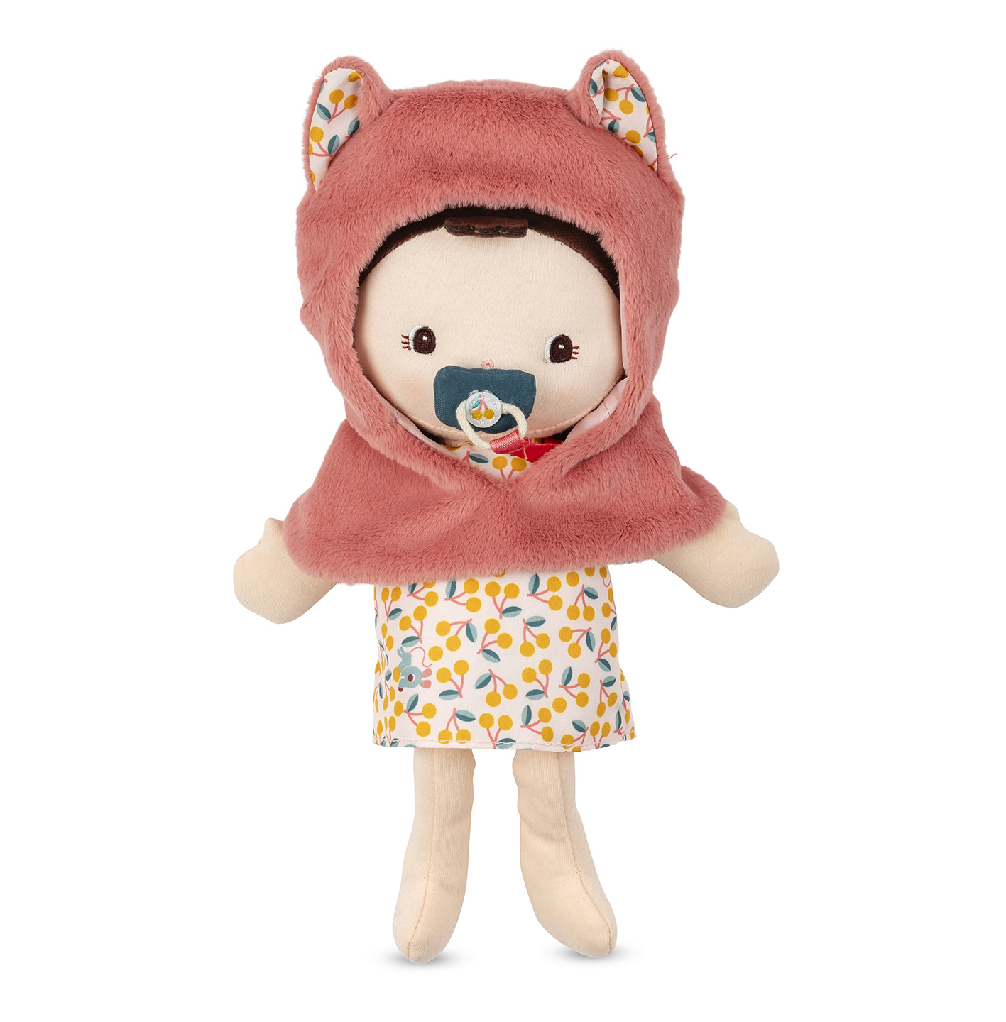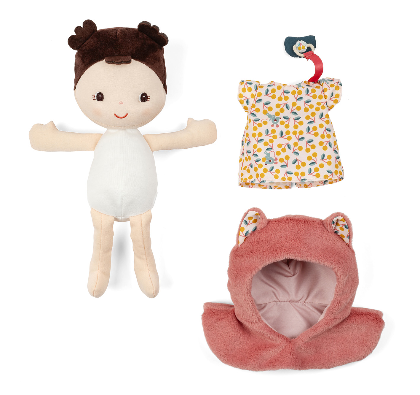 Ste pripravení na prechádzku v nosiči s bábikou Jeanne? S touto látkovou bábikou má vaše dieťa všetko, čo potrebuje na napodobňovanie dospelých a na prechádzku s vlastným bábätkom a to už od 18 mesiacov. Cumlík má bábika pripevnený k šatám, takže ho nikdy nestratíte. Je magnetický, takže drží na tvári bábiky a počas výletov nespadne. Jeanne má na sebe plyšovú kuklu v tvare mačičky. Nosič sa ľahko nastavuje vďaka popruhom. Stačí len umiestniť bábätko Jeanne dovnútra a vyraziť za dobrodružstvom. Táto bábika Lilliputiens pomáha stimulovať detskú fantáziu a nasleduje ich všade! Meria 24 cm a možno ju prať v práčke na jemný prací program, na 30 °C.