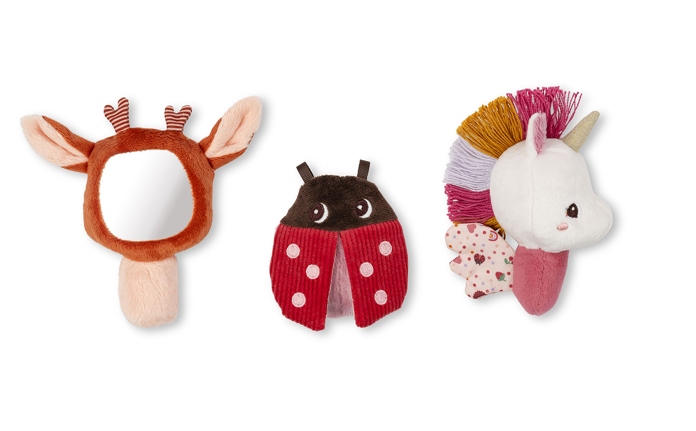Táto súprava 3 látkových hrkálok je vhodná od narodenia. Plyšové zvieracie hrkálky prebúdzajú zvedavosť tých najmenších a stimulujú ich zmysly. Jednorožec Lena a jej okúzľujúce krídla, ktoré vydávajú zábavný šuštivý zvuk, jelenček Stella s malým zrkadielkom a lienka, sa skladajú z niekoľkých textúr, ktoré môže dieťa objavovať končekmi prstov. Ich tvar bol navrhnutý pre ľahkú manipuláciu tými najmenšími. Je to skvelý tip na darček, pretože je dodávaný v krásnej škatuľke. Možno prať na ručné pranie.
