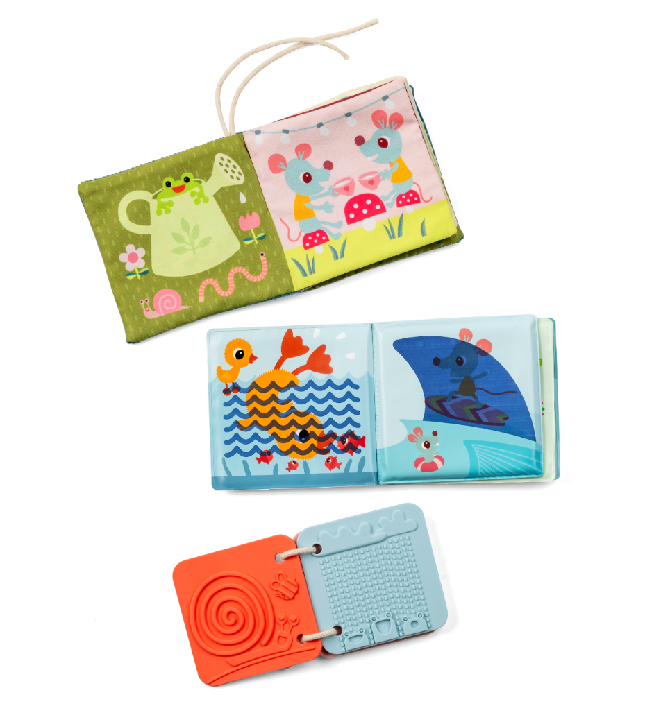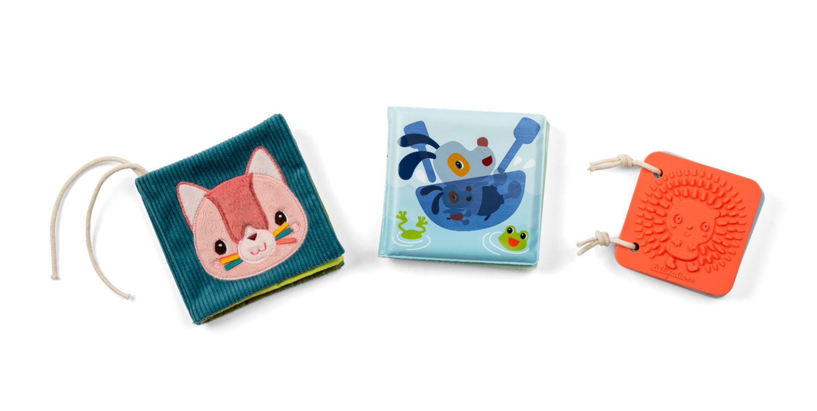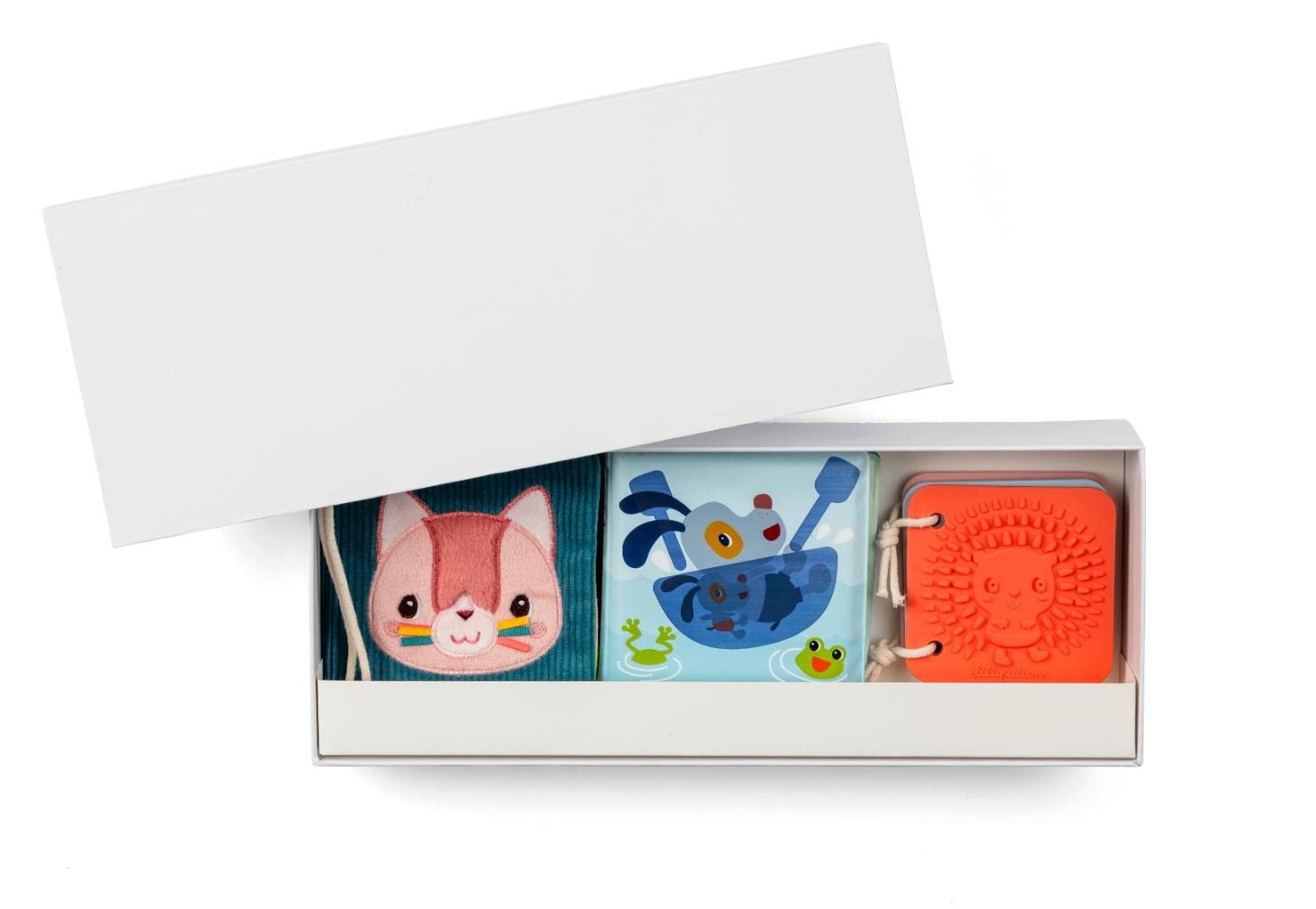 Tri malé knižky, ktoré prebudia zmysly bábätka sú vhodné od 3 mesiacov. Obrázková knižka na preskúmavanie, knižka do kúpeľa plná kúzelných prekvapení a silikónová knižka na preskúmavanie drobnými prstíkmi. V krásnej škatuľke vhodnej ako darček plný objavov!