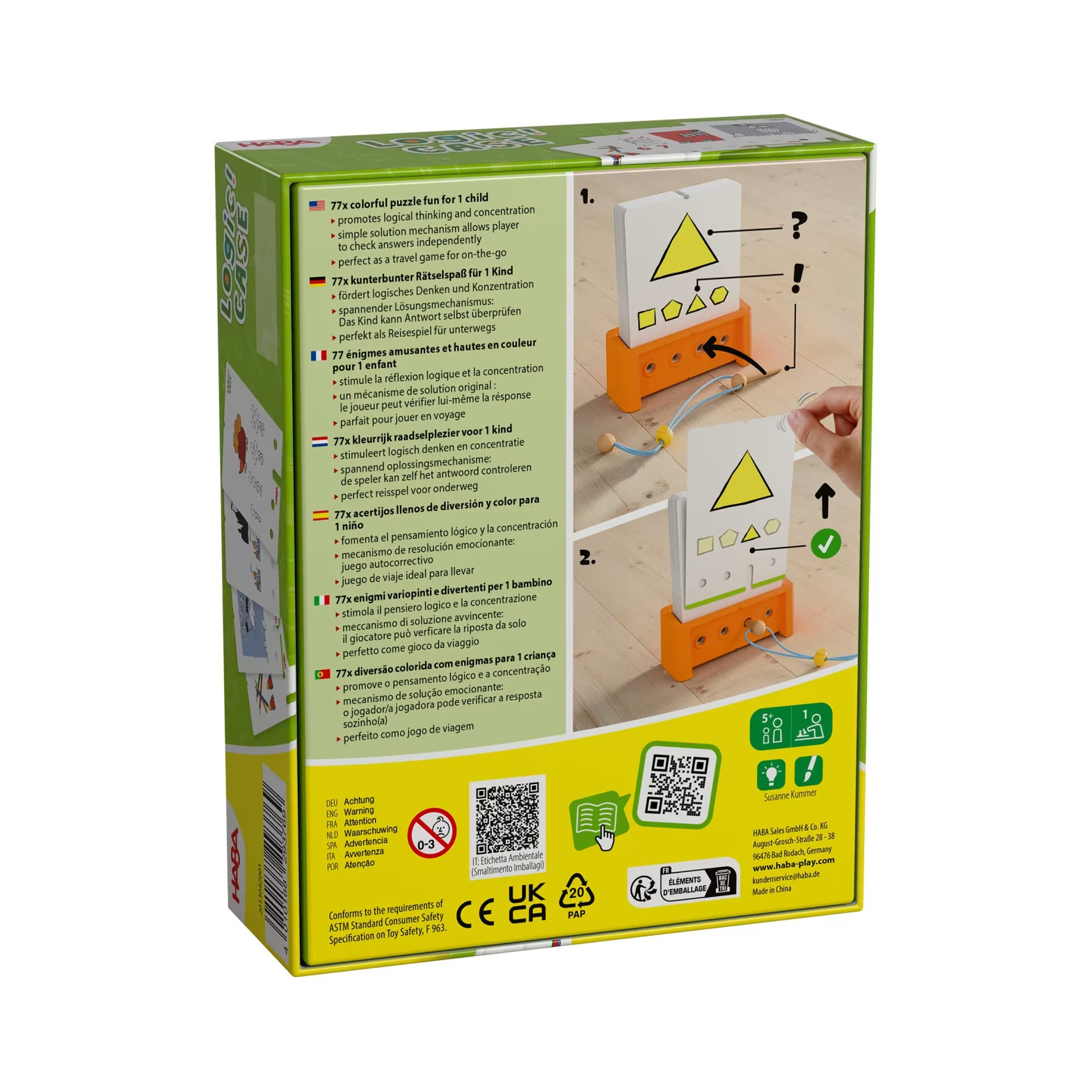 HABA Logic! CASE – Logická hra prináša obľúbené hádanky v novom, vylepšenom dizajne. Tento pestrofarebný set obsahuje 77 úloh navrhnutých pre jedného hráča, ktoré zábavnou formou stimulujú logické myslenie a sústredenie. Nový vzhľad prináša jasnejšiu komunikáciu herného princípu a ešte robustnejšie balenie, ktoré odolá aj častému používaniu. Srdcom hry je napínavý mechanizmus kontroly riešenia: dieťa vloží drevený kolík do otvoru zodpovedajúceho jeho odpovedi. Ak sa dá karta vytiahnuť smerom nahor, odpoveď je správna! Tento systém umožňuje deťom samostatne si overiť výsledok, čo posilňuje ich sebavedomie, motiváciu a schopnosť riešiť problémy bez pomoci dospelých. Vďaka kompaktnému baleniu a jednoduchému ovládaniu je Logic! CASE ideálnym spoločníkom na cesty, ktorý skráti dlhé chvíle v aute či v čakárni. Vek: 5+