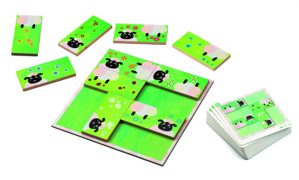 Hlavolam Ovce (Sheep logic) obsahuje hraciu dosku rozdelenú na 16 políčok a 10 drevených domino dielikov. Tvojou úlohou je rozmiestniť dieliky na hracej doske podľa zadania na kartičke. Prázdne miesta doplníš zvyšnými dielikmi. Pozor: dielikov je 10, ale na hraciu dosku sa zmestí len 8. Na každom dieliku je jedna alebo dve polovice ovce a doplňujúce prvky ako kvety alebo lienky. Všímaj si tieto doplňujúce prvky, pomôžu ti nájsť správne dieliky. Dieliky musíš ukladať tak, aby boli ovce celé. Kartičky majú vzostupný stupeň náročnosti. Návod si stiahnete tu: http://www.djeco.com/data/rules/DJ08473_SK.pdf