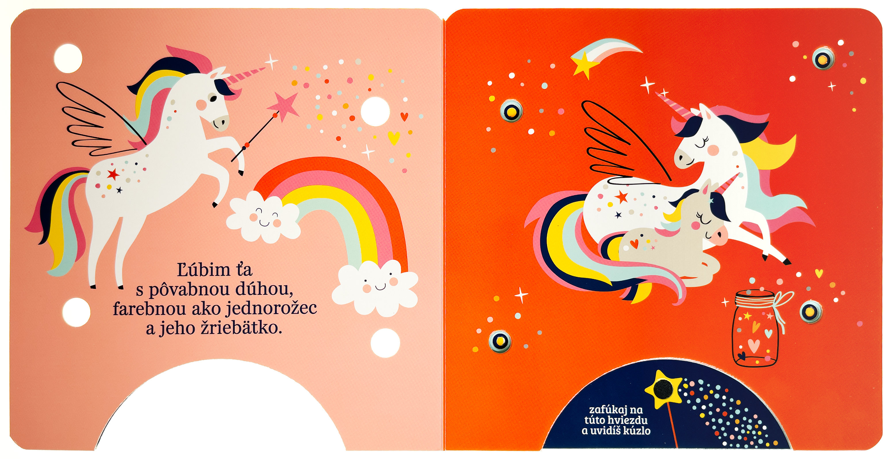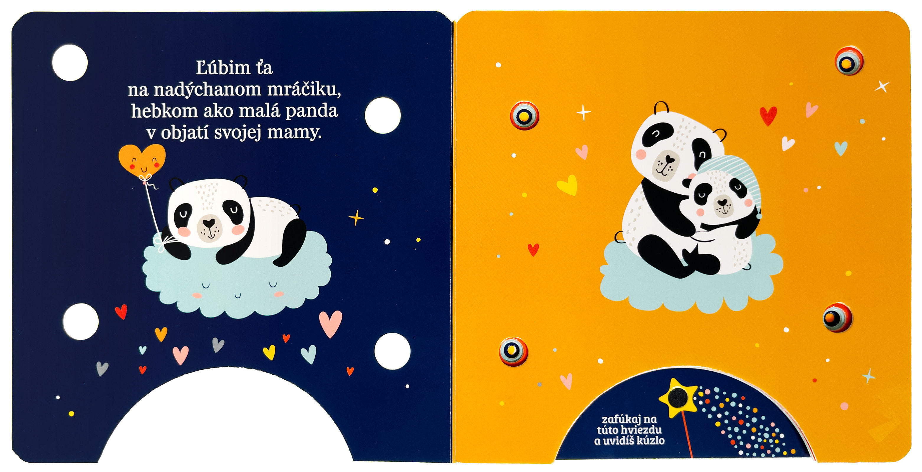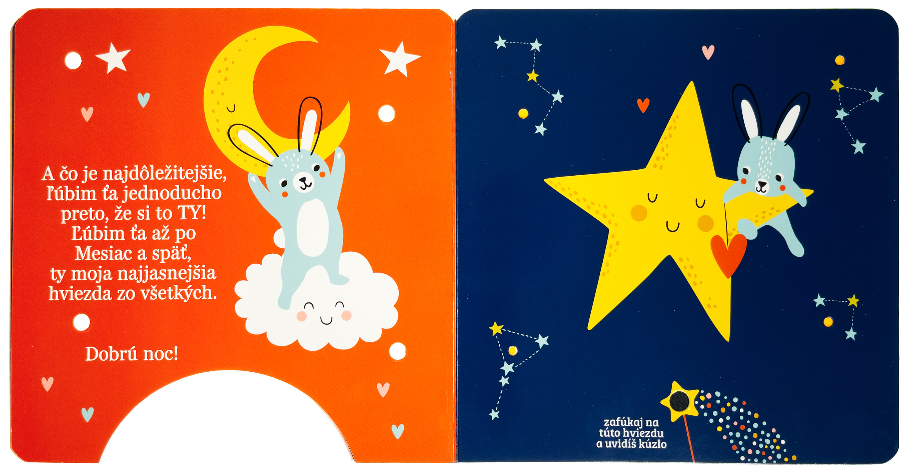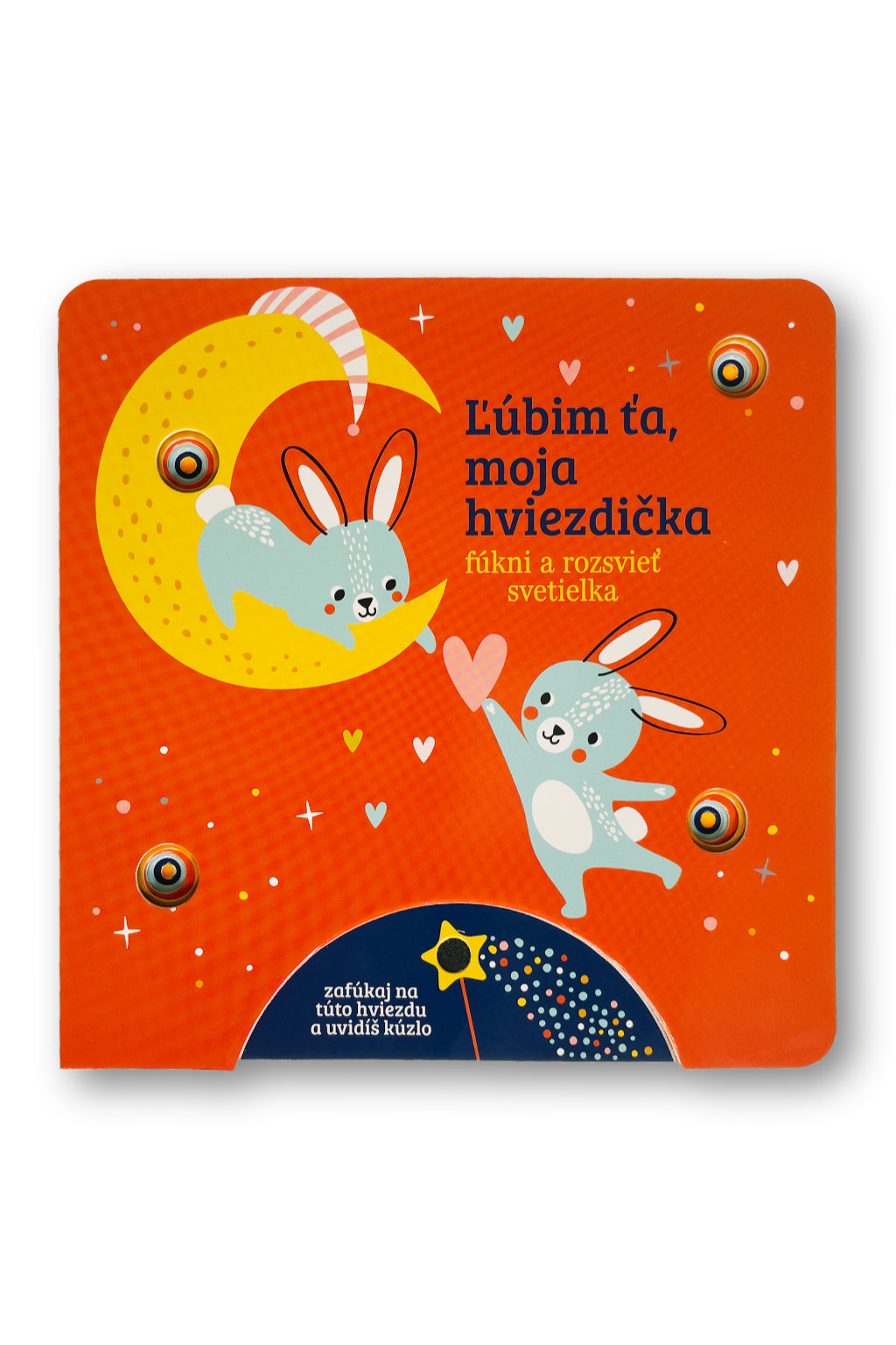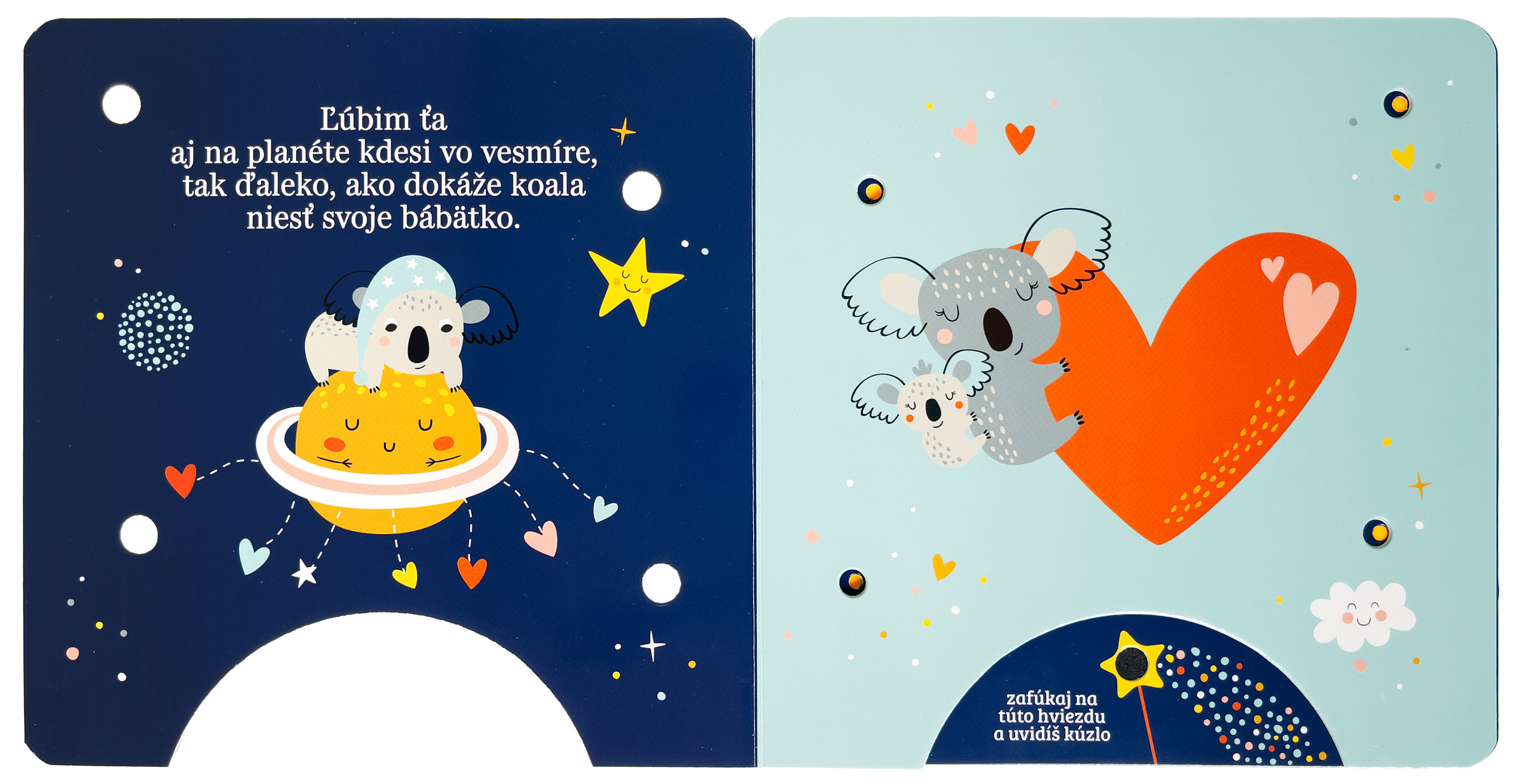 Stačí jemne zafúkať na snímač v dolnej časti knihy a rozžiaria sa kúzelné svetielka! Toto nežné leporelo pre najmenších rozpráva príbeh o rodičovskej láske, ktorá nepozná hraníc. Krátke poetické texty sprevádzajú roztomilé zvieratká, ktoré vyjadrujú lásku tak veľkú, že ju možno prirovnať k oblohe plnej hviezd, dúhe či ďalekým planétam. Vďaka svetelným efektom a interaktívnemu princípu "fúkni a rozsvieť" sa z obyčajného čítania stáva kúzelný zážitok, ktorý posilňuje puto medzi rodičom a dieťaťom. Ideálny večerný rituál pre tie najsladšie sny.Počet strán: 8