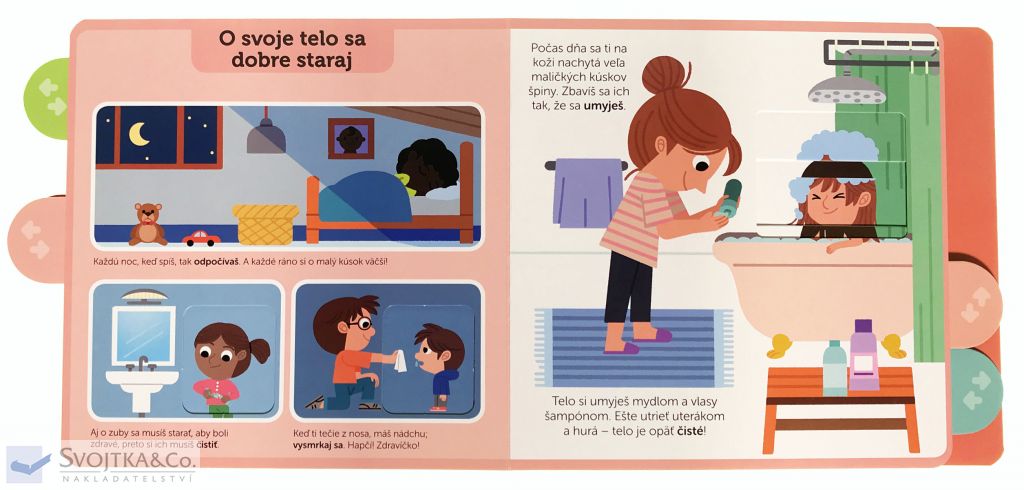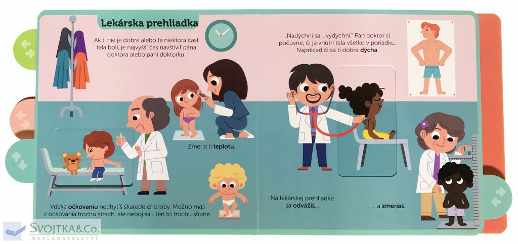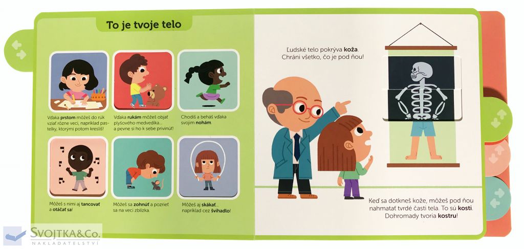 .Vieš, že tvoje telo pokrýva koža? A vieš, že pod kožou máš kostru, ktorá sa skladá z kostí? Na stránkach tohto leporela s pohyblivými prvkami sa zoznámiš s časťami ľudského telo a jeho fungovaním. Dozvieš sa, ako sa oň správne starať a že prehliadka u lekára nie je nič hrozné alebo desivé. Poponáhľaj sa, otvor knižku a teš sa, čo nové sa o sebe a svojom telom môžeš naučiť.