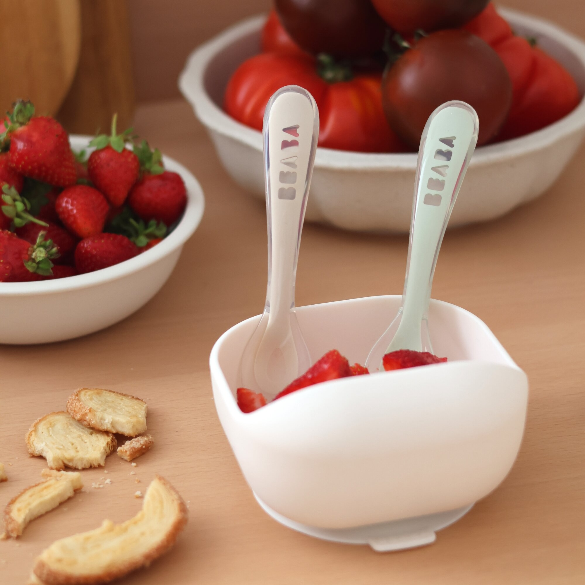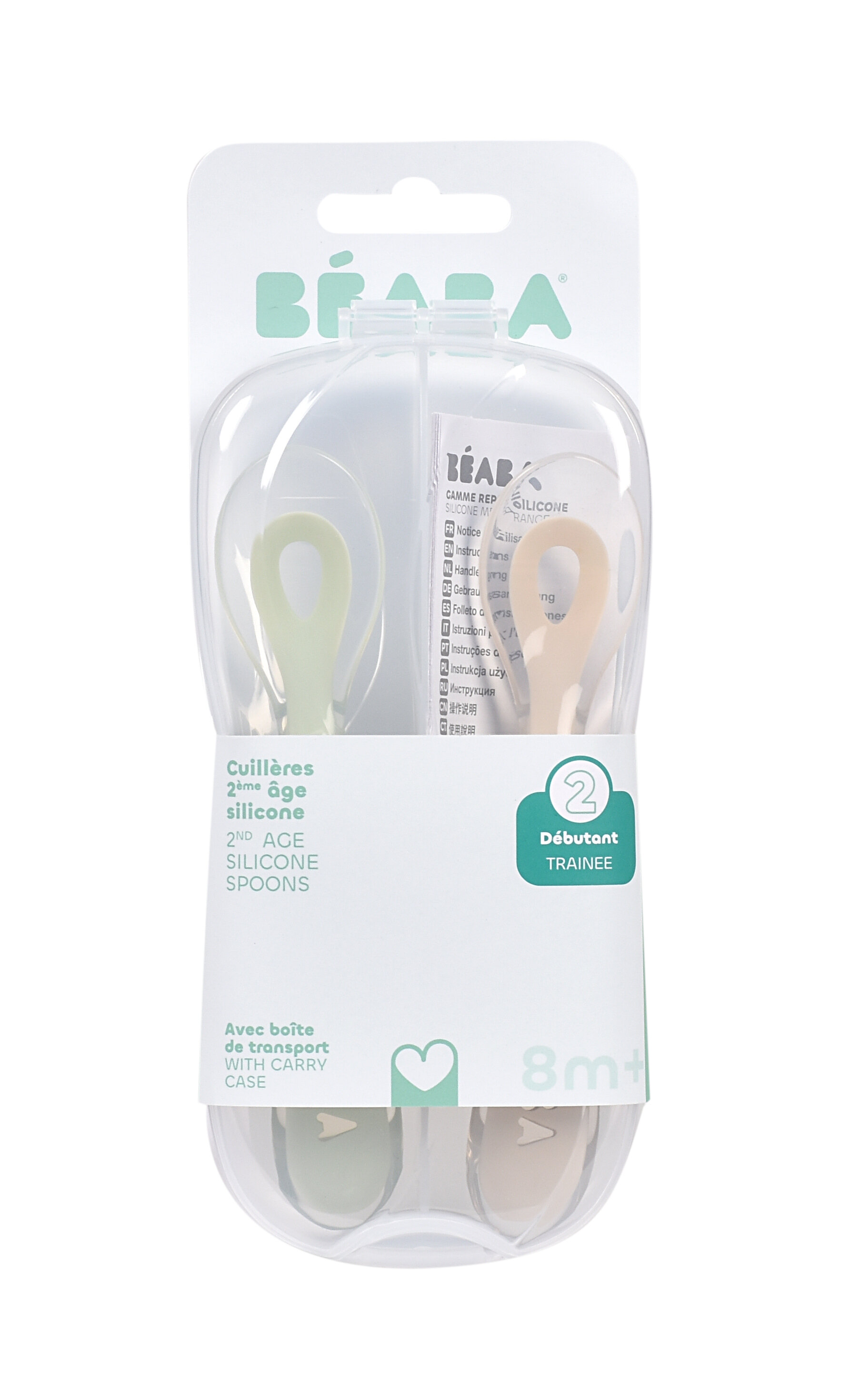 Silikonová lžička pro první samostatné krmení má ideální tvar pro dětská ústa. Tvar držadla usnadňuje dítěti držení lžičky. Integrovaná opěrka lžičky zabraňuje při položení lžičky na stůl kontaktu jídla se stolem a zajišťuje tak čistotu a hygienu. Praktické pouzdro umožňuje hygienické přenášení lžiček např. v přebalovací tašce.