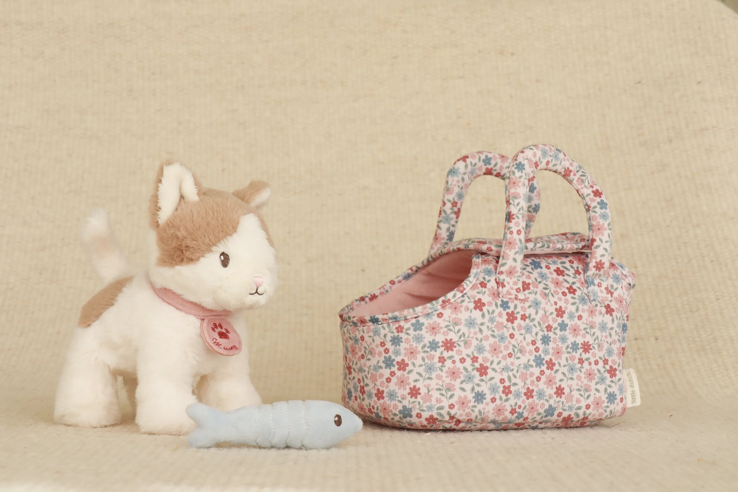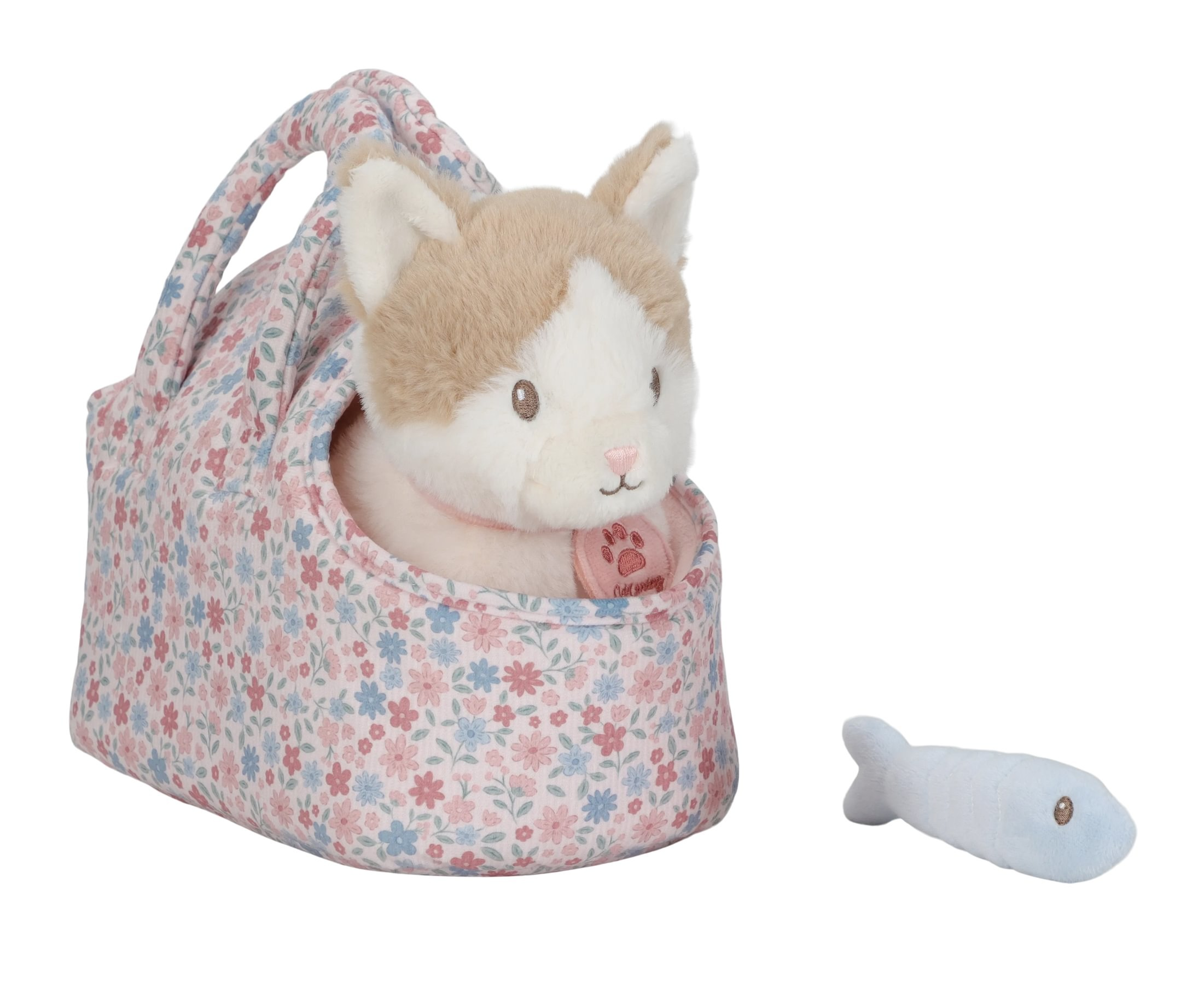 Kočička přichází v elegantní květované tašce s předním otvorem, aby mohla zvědavě vykukovat ven. Díky tomu si ji děti mohou vzít kamkoli – na procházku, na výlet, do školky nebo třeba k prarodičům. Na krku má přívěsek se svým jménem. Plyšová rybka na hraní má uvnitř magnet, takže drží kočičce u tlamičky.
